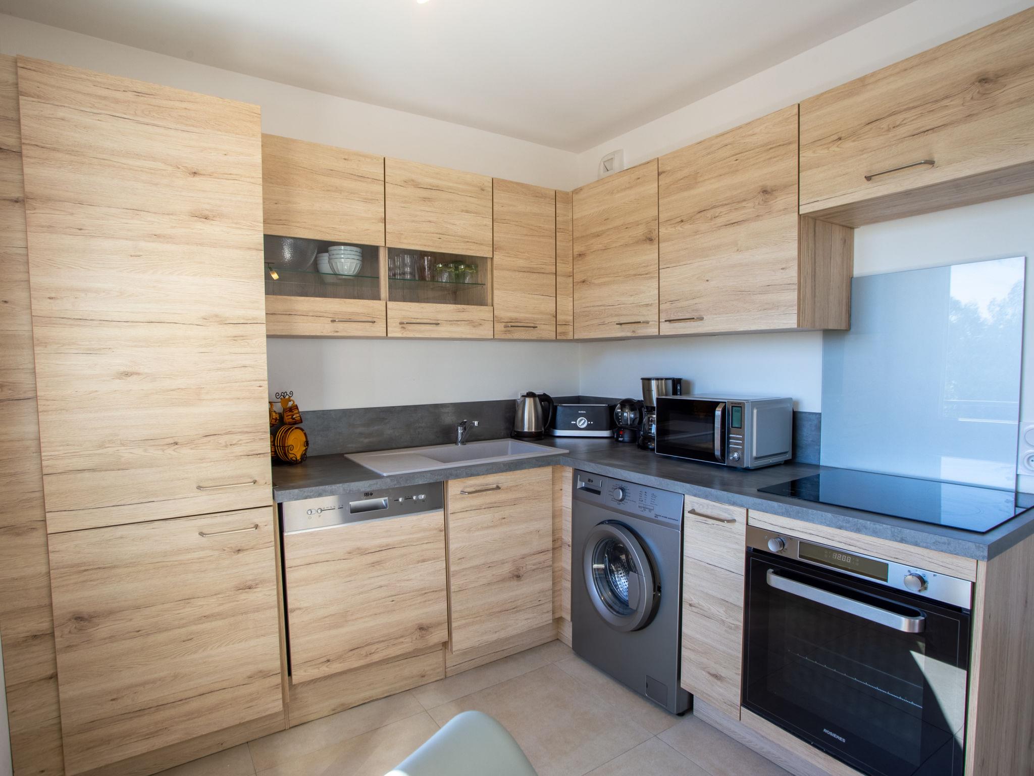 3-room apartment 55 m2 on 1st floor. Comfortable and beautiful furnishings: living/dining room with TV (flat screen), air conditioning. 1 room with 1 french bed (160 cm, length 200 cm), TV (flat screen). 1 room with 2 beds (90 cm, length 190 cm). Open kitchen (oven, dishwasher, 4 induction hot plates, toaster, kettle, electric coffee machine). Shower, sep. WC. Electric heating. Terrace 20 m2. Terrace furniture. View of the countryside. Facilities: washing machine, iron. Internet (WiFi, free). Parking space n 64. Please note: TV only FR. Smoke alarm. 83019000928 AS