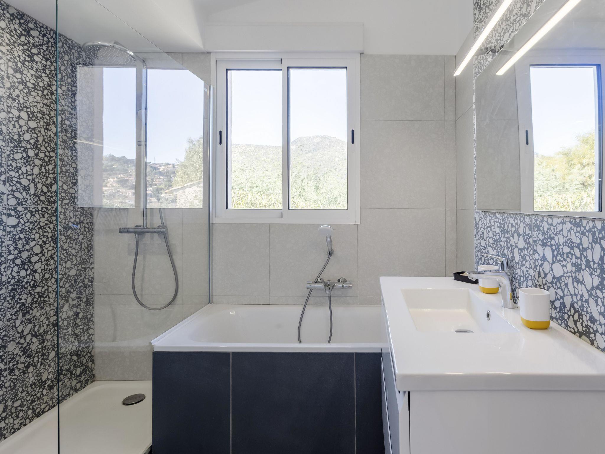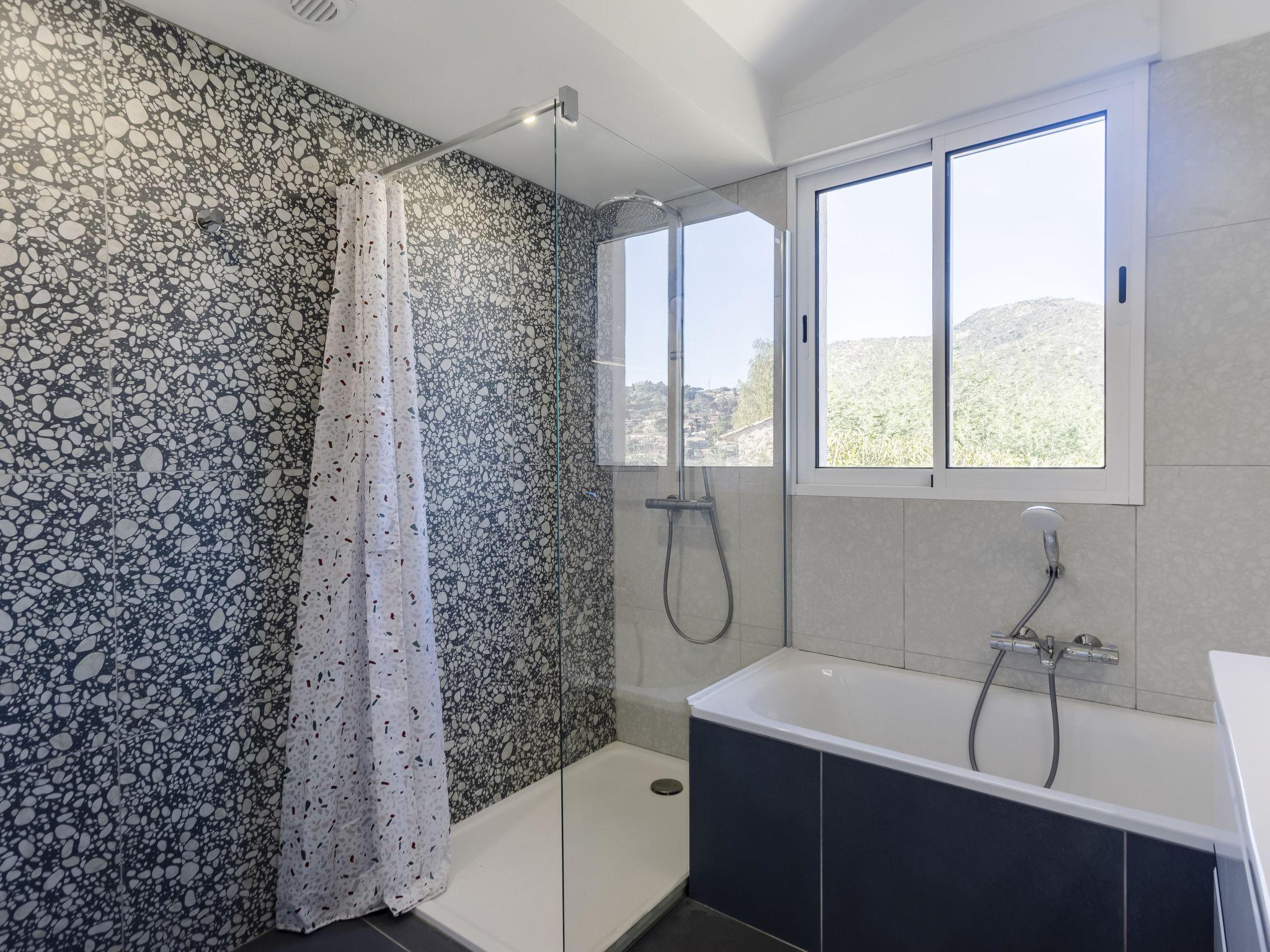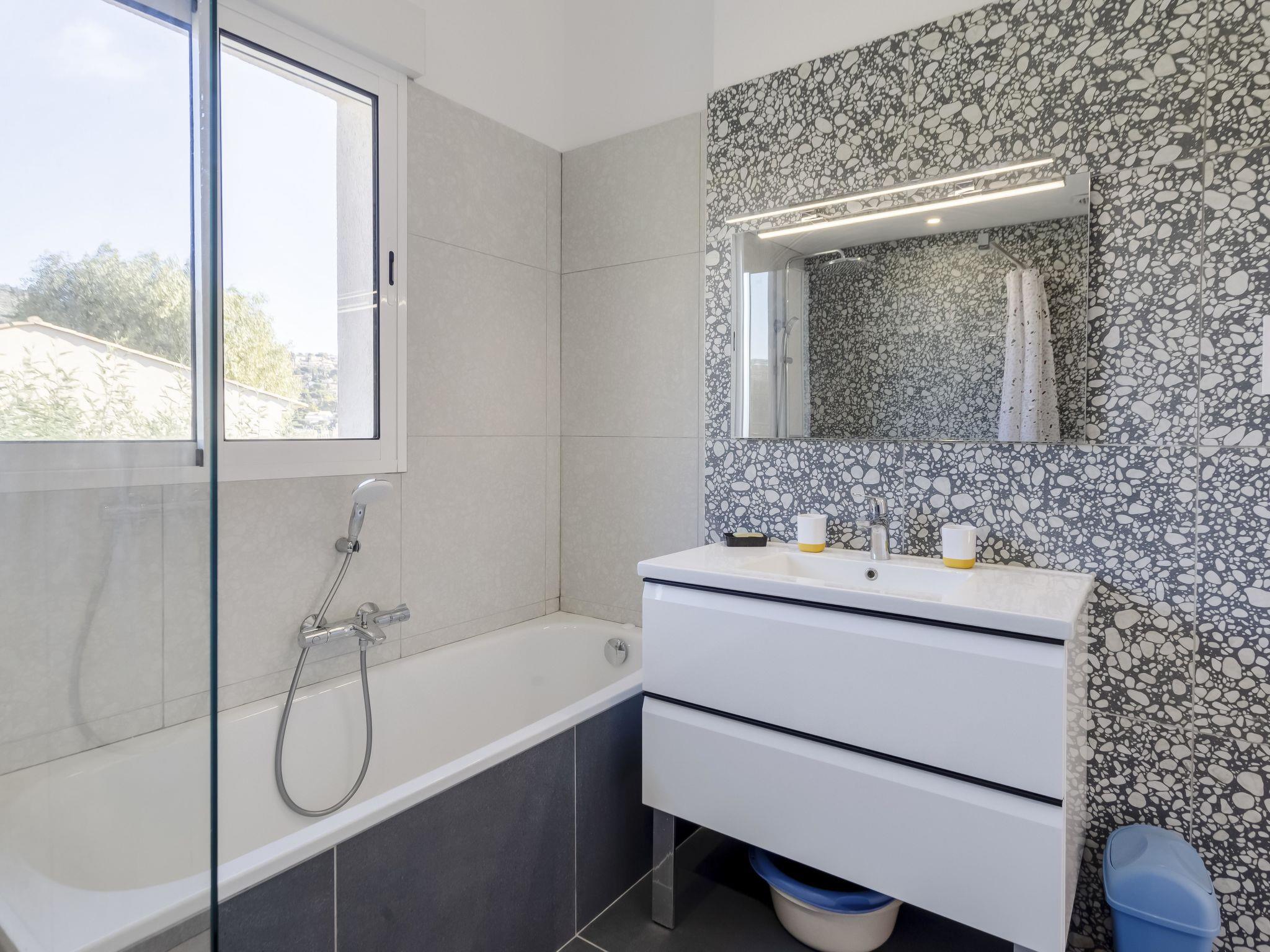 5-room house 128 m2 on 2 levels, south-east facing position. Very comfortable and beautiful furnishings: living/dining room with Scandinavian wood stove (only for decoration), TV (flat screen). 1 room with 1 french bed (160 cm, length 200 cm). Open kitchen (oven, dishwasher, 3 induction hot plates, toaster, kettle, microwave, electric coffee machine, Capsules for coffee machine (Nespresso) extra). Bath/shower, sep. WC. On the lower ground floor: 1 room with 1 french bed (140 cm, length 190 cm). Exit to the terrace. 1 room with 2 beds (90 cm, length 200 cm). Exit to the terrace. 1 room with 2 beds (90 cm, length 200 cm). Exit to the terrace. Shower, sep. WC. Electric heating, air-conditioning. Large terrace 42 m2, south facing position and, east facing position, small terrace 20 m2, garden 200 m2. Distant view of the sea. Facilities: washing machine, iron, hair dryer. Internet (WiFi, free). Parking (2 cars). Please note: non-smoking house. TV only FR. Smoke alarm. Offer by a private individual according to Art. 155, IV of CGI. 83019001442U2