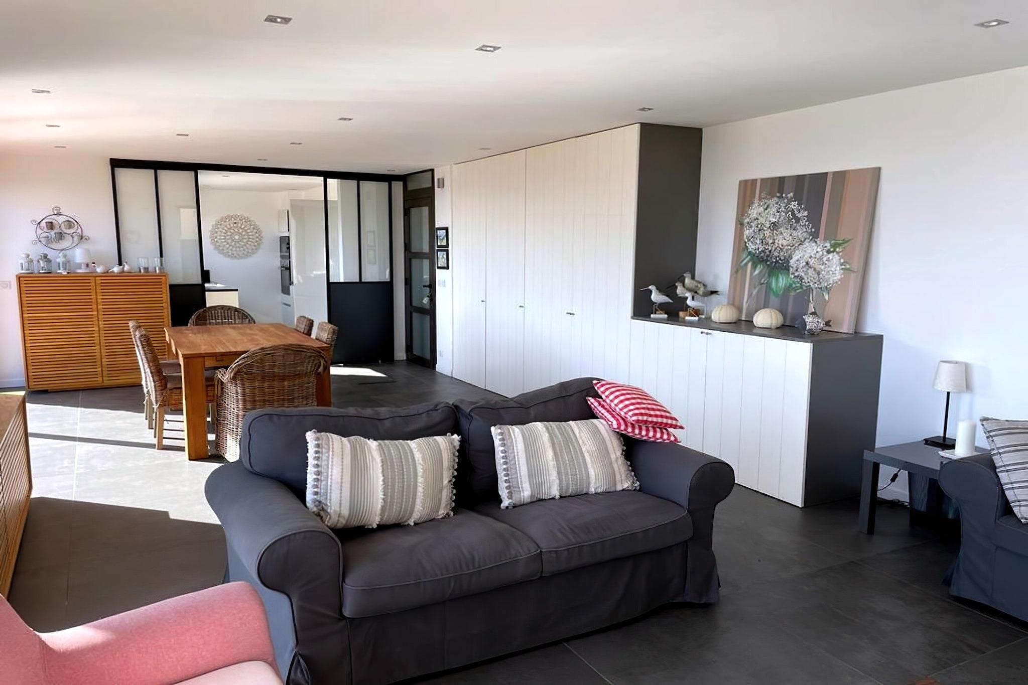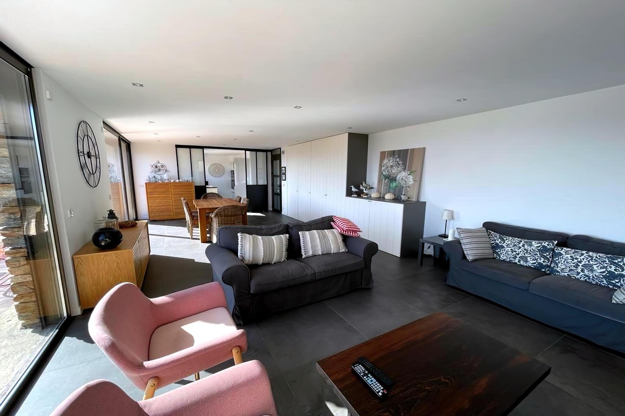 Stueetage: (Køkken(elkedel, brødrister, komfur(induktion), emhætte, espressomaskine, ovn, mikrobølgeovn, opvaskemaskine , køle-fryseskab, vaskemaskine, strygebræt, strygejern), stue / spisestue(Fjernsyn(fladskærm, Smart-TV), spisebord, sofahjørne), soveværelse(dobbeltseng(160 x 200 cm)), soveværelse(enkeltseng(80 x 200 cm), enkeltseng(80 x 200 cm)), Soveværelse med badeværelse(dobbeltseng, bruser, håndvask, toilet), badeværelse(bruser, håndvask), toilet, klimaanlæg, terrasse, solstole) spisebord(6 personer), terrasse, have, parkering, tennisbane(deles med andre gæster), loungemøbler, hyggespil, Pladegrill