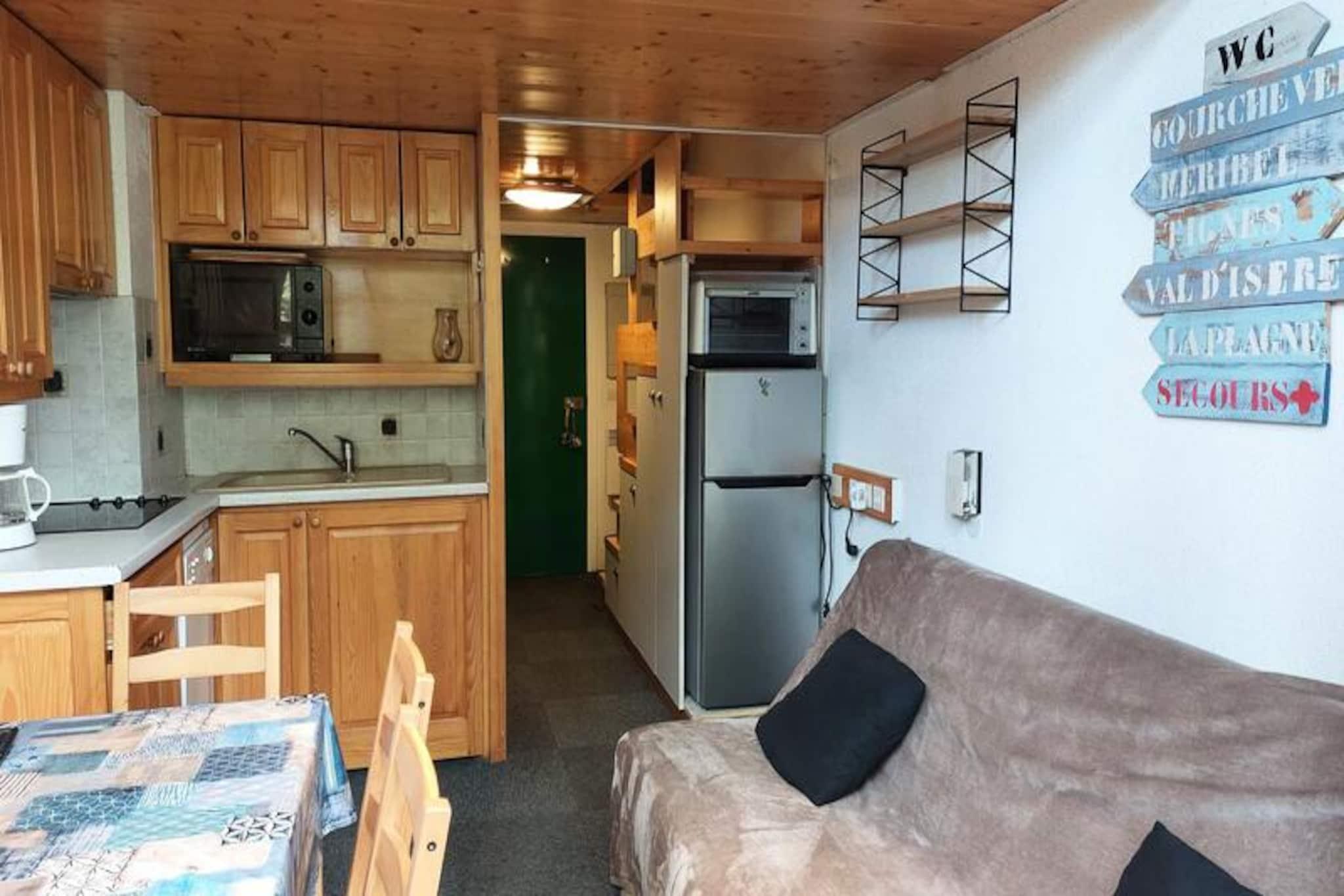 I hjertet af den fredfyldte landsby Charmettoger tilbyder denne hyggelige duplexlejlighed et perfekt alpint tilflugtssted til dit næste skiløb eller sommereventyr. Kun 20 meter fra den blide blå 'Charmettoger'-piste og 50 meter fra 'Transarc'-svævebanen, placerer denne ejendom dig lige ved døren til Paradiski-området, der lover endeløs bjergudforskning. Den sydvestvendte balkon inviterer dig til at nyde eftermiddagssolen, mens du nyder den friske bjergluft og den betagende udsigt. Den 25 m² store lejlighed er designet til at rumme op til fire gæster og har en mezzanin med en dobbeltseng og to enkeltsenge med udtræksseng, adskilt af en skydedør for ekstra privatliv. Det åbne køkken er fuldt udstyret med moderne apparater, herunder keramisk kogeplade, mikrobølgeovn, ovn, opvaskemaskine og mere, hvilket gør det nemt at tilberede måltider efter en dag på pisterne. Stuen, komplet med et fjernsyn, skaber et indbydende rum til afslapning og ro. Et badeværelse med badekar og toilet sikrer komfort under dit ophold, mens to sikre skibokse på samme repos giver praktisk opbevaring til dit udstyr. Boligen er ideelt beliggende med overdækket parkering kun 100 meter væk og gratis shuttlebusser, der kører regelmæssigt for at forbinde dig med nærliggende faciliteter. Der ligger en dagligvarebutik 200 meter væk, mens ESF-skiskolen og den pulserende landsby Villards kun ligger en kort gåtur eller tur med shuttlebus. Om sommeren forvandles området til et paradis for vandrere og naturentusiaster med frodige stier og panoramaudsigter, der venter på at blive opdaget. Uanset om du søger spændende vintersport eller rolige sommerferier, tilbyder denne lejlighed den perfekte blanding af komfort, bekvemmelighed og alpin charme. Skab uforglemmelige minder i hjertet af Les Arcs 1800, hvor hvert øjeblik er indrammet af de franske alpers majestætiske skønhed.