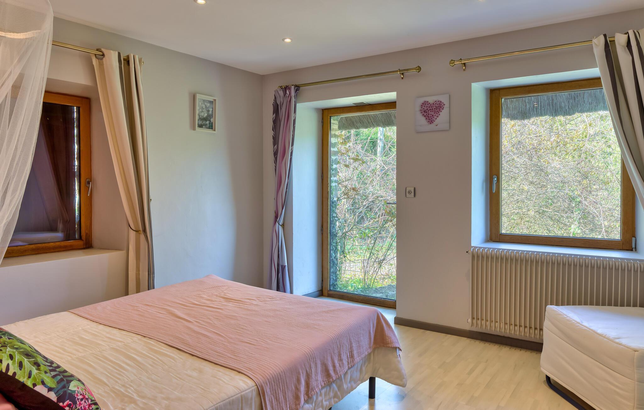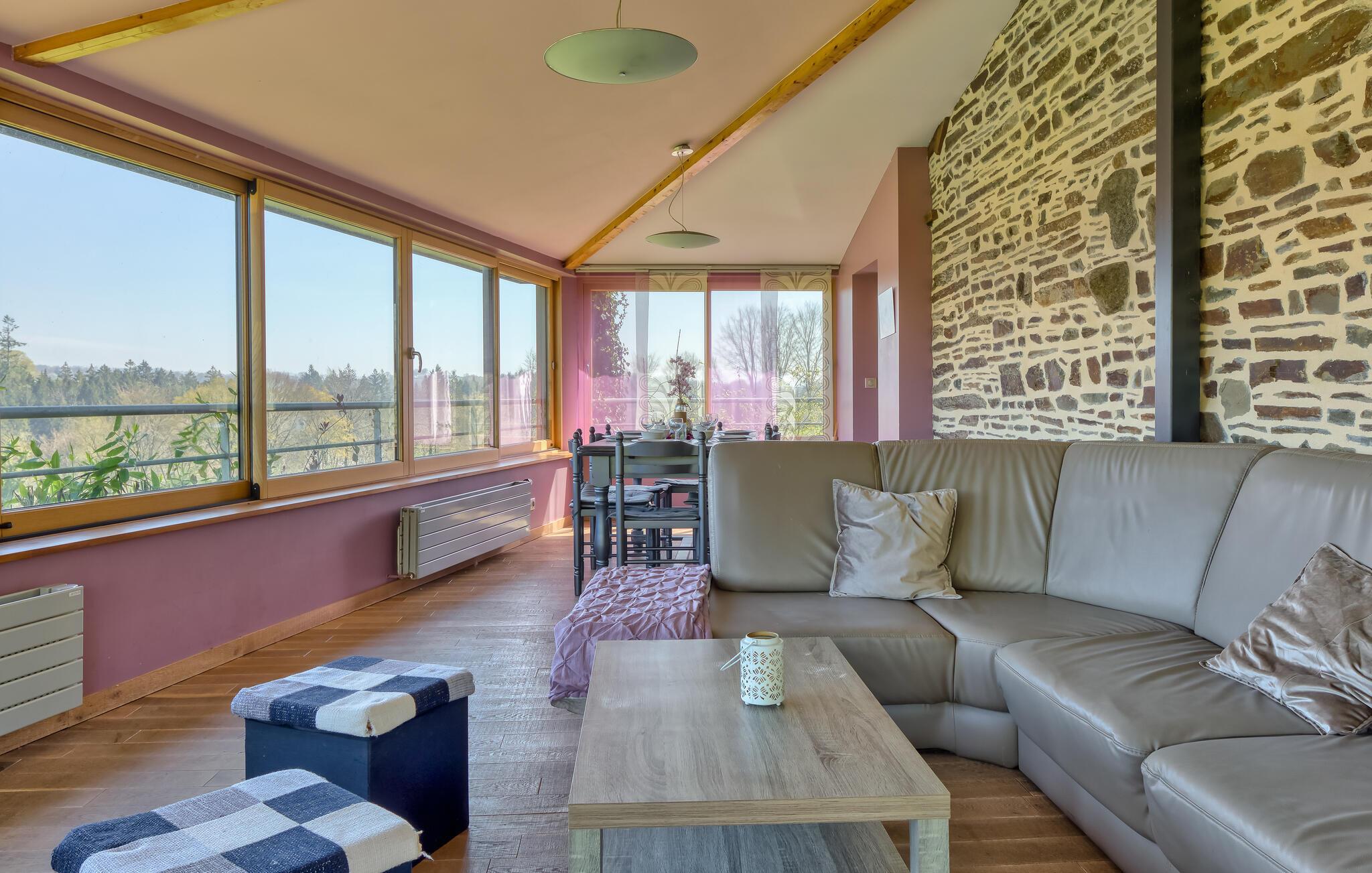 Husets indretning kombinerer autenticitet med komfort gennem synlige træbjælker og en hyggelig atmosfære. I kan også se frem til et helt særligt lokale, som også er tilgængeligt for jer her. Garagen, som er omdannet til et spillelokale og er udstyret med et bordtennisbord, byder på hyggestunder med familie og venner. Fra boligen kan I nyde den betagende udsigt over dalen, hvor naturen udfolder sin skønhed med årstidernes rytme. Hver solopgang bader det fredelige og magiske landskab i et fascinerende lys og sikrer et afslappende ophold.