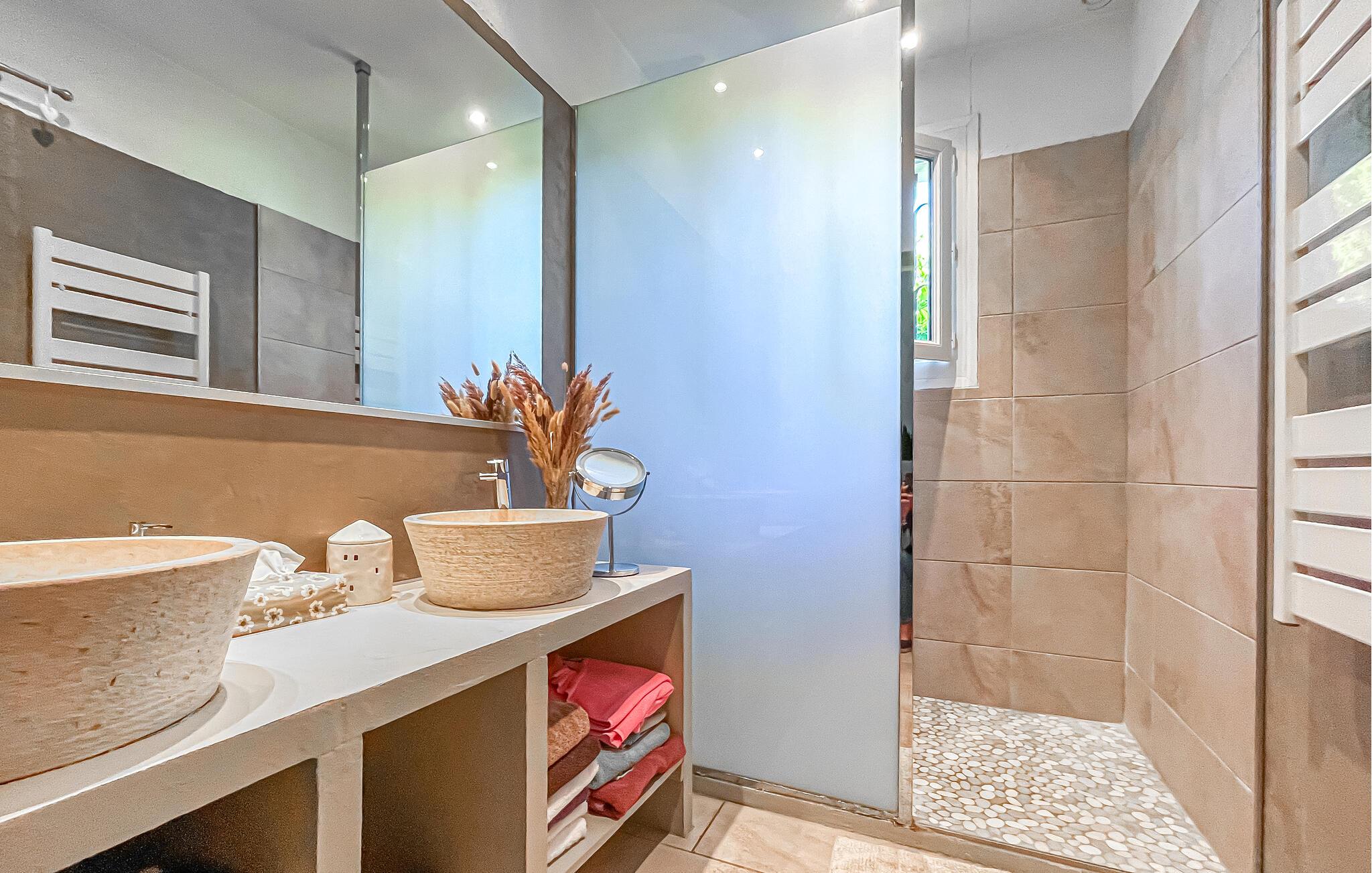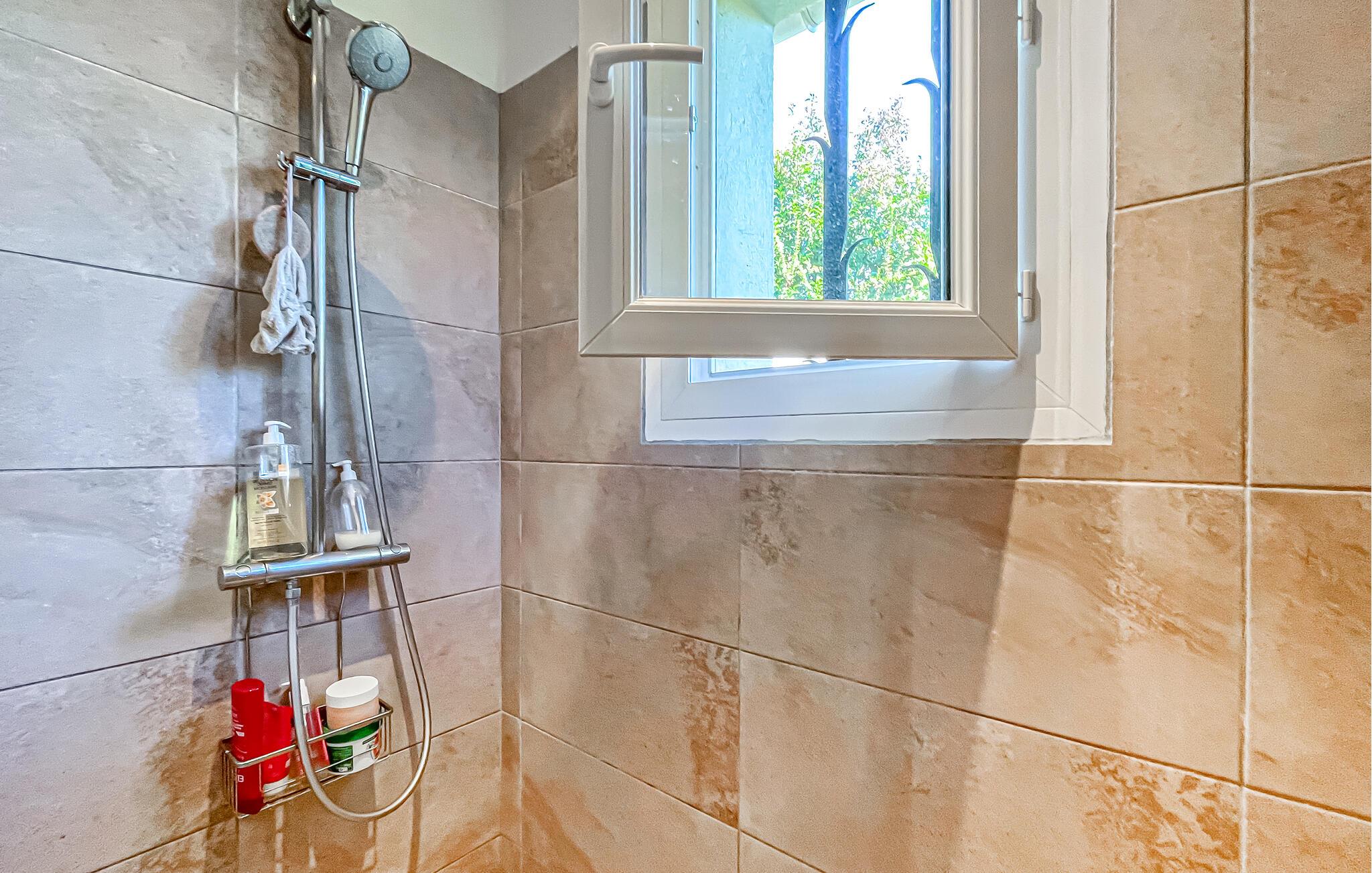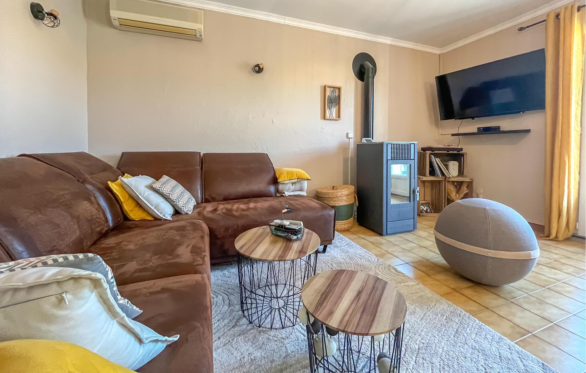Dette feriehus tilbyder solrig ro på en ideel beliggenhed – perfekt til familier eller venner, der ønsker at kombinere provencalsk charme med afslapning. Stuen er komfortabelt møbleret med en stor sofa, TV og pilleovn til hyggelige aftener. Den tilstødende spiseplads giver plads til hyggelige måltider, mens det lyse køkken tilbyder masser af plads til at lave mad sammen.