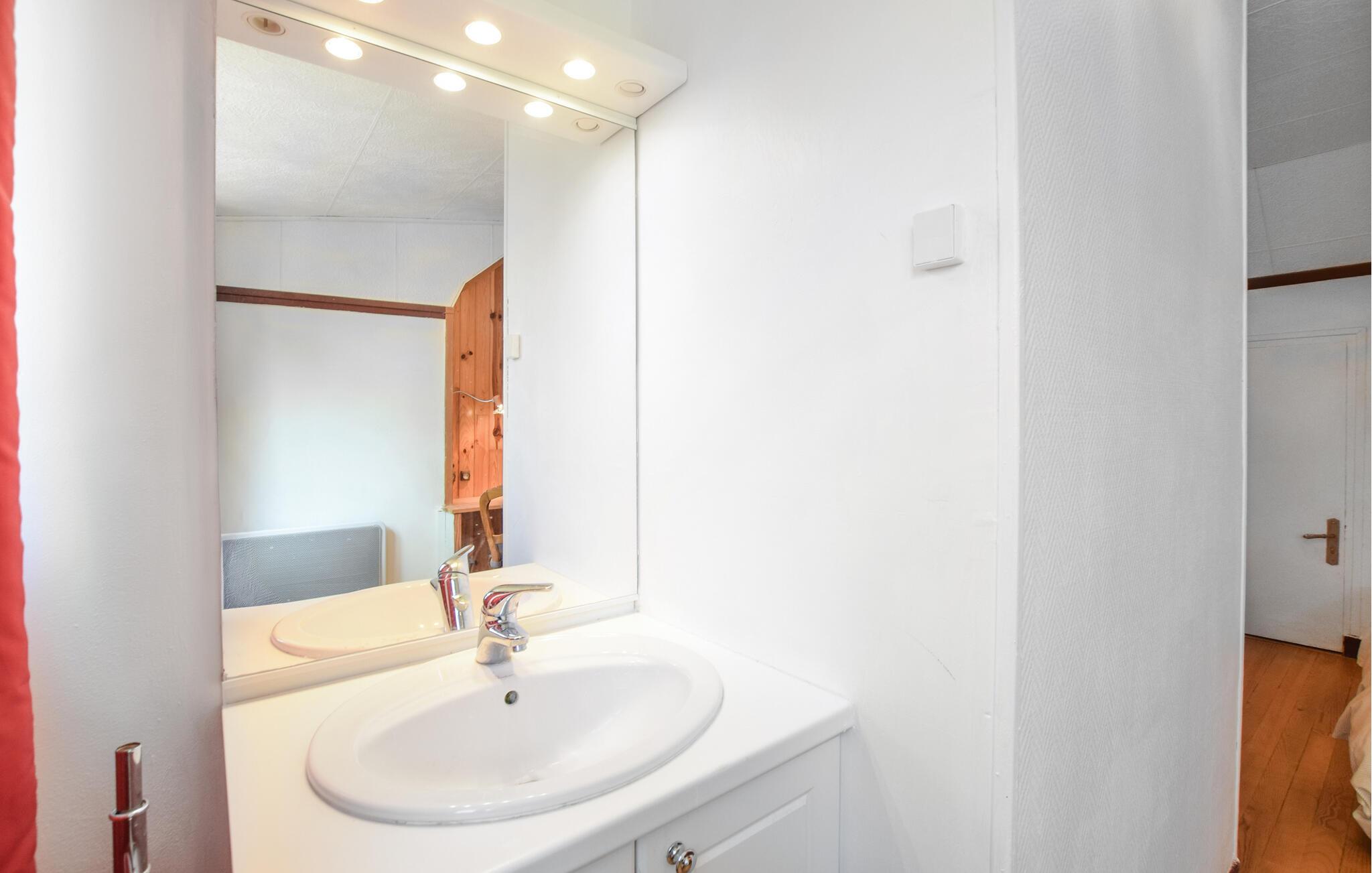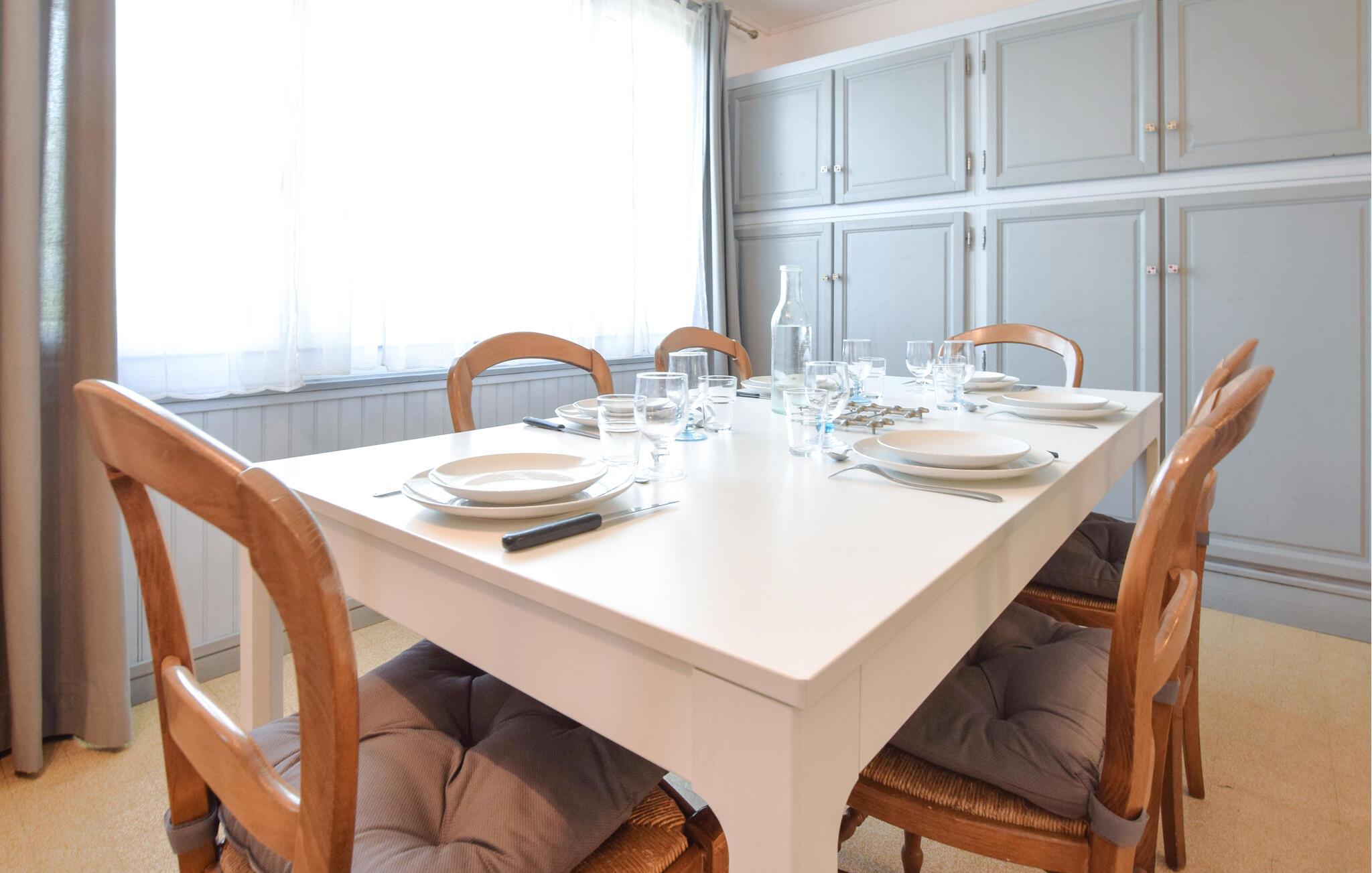 Jeres feriehus er lyst møbleret og udstråler en hyggelig, familiær atmosfære. Opholdsstuen i jeres feriehus med sofa, lænestole og tv giver mulighed for at afslutte aftenen i hyggeligt selskab. Brug den tilstødende spiseplads med et stort bord til fælles måltider, og lav mad i det praktisk indrettede køkken.