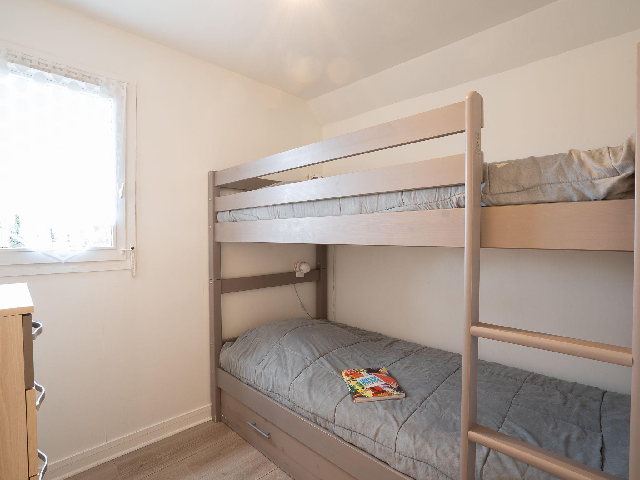 3-room apartment 35 m2 on 2 levels on 1st floor, west facing position. Living/dining room with TV (flat screen). Exit to the terrace. Kitchenette (oven, dishwasher, 4 ceramic glass hob hotplates, toaster, kettle, microwave, electric coffee machine). Sep. WC. Electric heating. Upper floor: 1 room with 1 french bed (140 cm, length 190 cm), TV (flat screen). 1 room with 1 x 2 bunk beds (90 cm, length 190 cm). Shower. Terrace 12 m2, west facing position. Terrace furniture. Facilities: washing machine, iron. Internet (WiFi, free). Parking space n 139. Please note: non-smokers only. Smoke alarm.