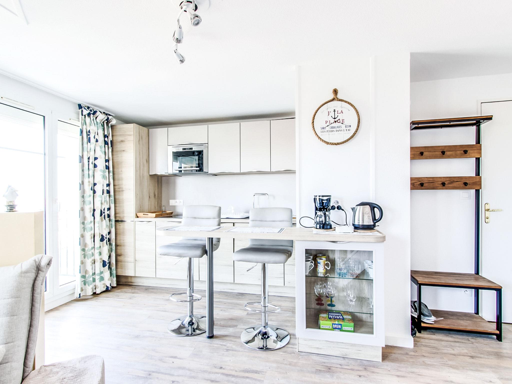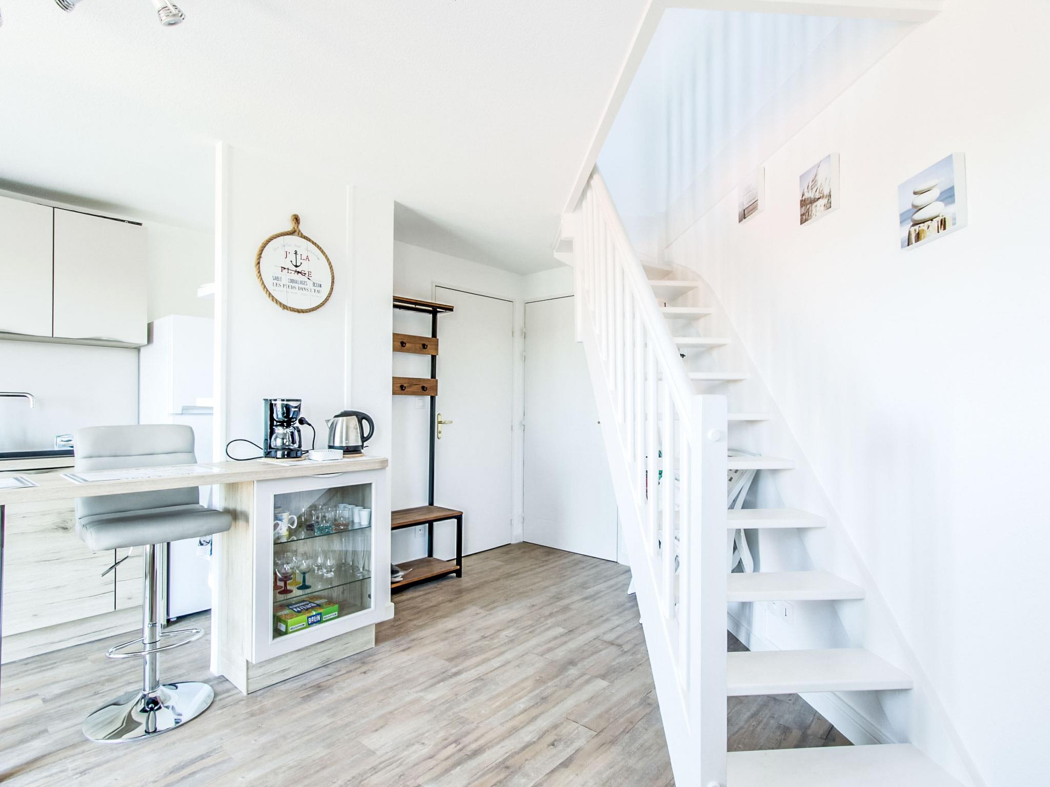 2-room apartment 35 m2 on 2 levels on 2nd floor, north-west facing position. Living/dining room with TV (flat screen), electric shutters. Exit to the balcony. Kitchenette (dishwasher, 3 induction hot plates, toaster, kettle, microwave, freezer, electric coffee machine) with bar. Sep. WC. Electric heating. Upper floor: 1 room with 1 french bed (140 cm, length 190 cm). Shower/WC. Parquet floors. Balcony 5 m2. Balcony furniture. Beautiful distant view of the sea and the river. Facilities: hair dryer. Internet (WiFi, extra). Parking space n 2831. Please note: smoke alarm.