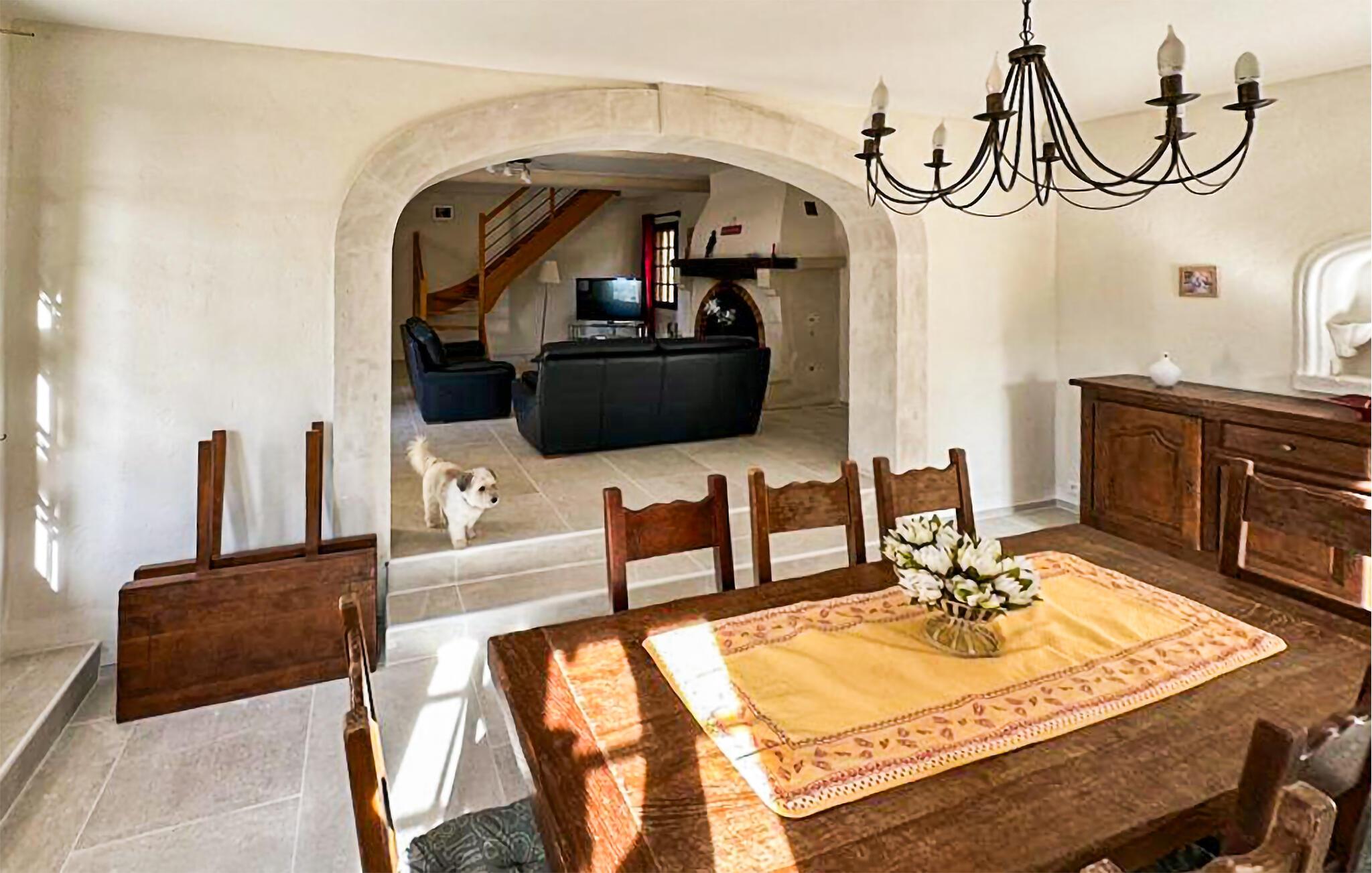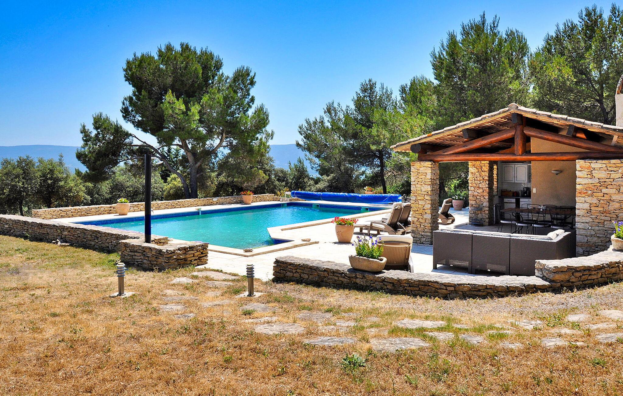Oplev denne charmerende ferievilla i Cabrières d'Avignon, perfekt beliggende mellem Gordes og Isle sur la Sorgue, med en fantastisk udsigt over Luberon. Gemt i et fredfyldt, lukket område, sikrer denne villa et roligt, men tilgængeligt feriested. Villaens indbydende funktioner inkluderer et veludstyret poolhus med sommerkøkken, gasgrill og praktisk brusebad med toilet, perfekt til dejlige udendørs sammenkomster. Inde i villaen finder du et fuldt udstyret køkken og en rummelig spiseplads, der åbner ud til terrassen. Det komfortable opholdsområde suppleres af en pejs, som er ideel til hyggelige aftener. Træd udenfor for at nyde den ekspansive lukkede ejendom, omfavnet af cederskoven. Du vil finde rigelig parkering, en petanqueplads og en carport for ekstra bekvemmelighed. Stjerneattraktionen er den opvarmede private pool, der byder på et pragtfuldt landskab og udsigt over landsbyen Gordes. Poolhuset, et knudepunkt for fritid, har et sommerkøkken, gasgrill og et dejligt opholdsområde til mindeværdige øjeblikke med dine kære. Ejendommen er beliggende 1 km fra Cabrieres i hjertet af et begrænset område (kun adgang for beboere) "Foret des Cèdres" (Cederskoven). Forskellige vandre- og cykelstier i skoven i nærheden af ejendommen. Cabrieres d'Avignon ligger tæt på berømte landsby Gordes. Dette område er især kendt for "Bories": Små tørstenshytter fra det 18. århundrede. Ejendommen er beliggende nær Gordes og andre charmerende landsbyer i Luberon: Bonnieux, Ménerbes, Lacoste. I nærheden kan du også besøge: Fontaine de Vaucluse, Isle sur la Sorgue Nyd din ferie i Vaucluse i Provence.