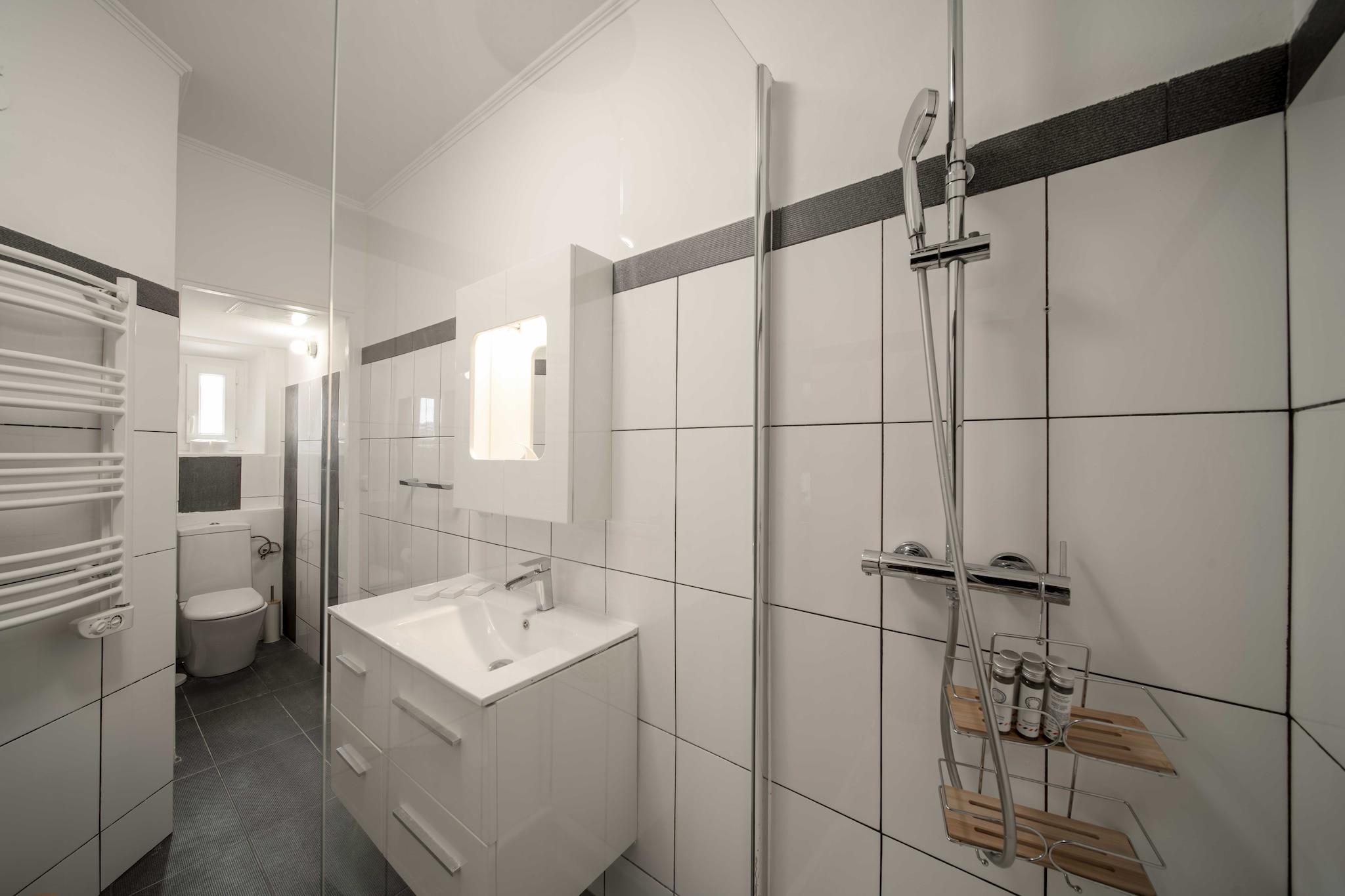 On the 4th floor: (Kitchen(stove, hob, electric kettle, toaster, coffee machine, oven, microwave, dishwasher, fridge, dishes and cutlery, Cooking basics), Living/diningroom(single sofa bed, dining table), bedroom(double bed), bedroom(double bed), bathroom(shower, toilet)) Bed Linen, Desk, Elevator, Hot Water, Internet Access DSL, Wardrobe, TV, tumble dryer, washing machine, heating, air conditioning, iron, hairdryer, Towels/Sheets (Incl.), shampoo, Essentials, Carbon monoxide detector, Cleaning Disinfection, Enhanced cleaning practices, High touch surfaces disinfected, Long term stays allowed