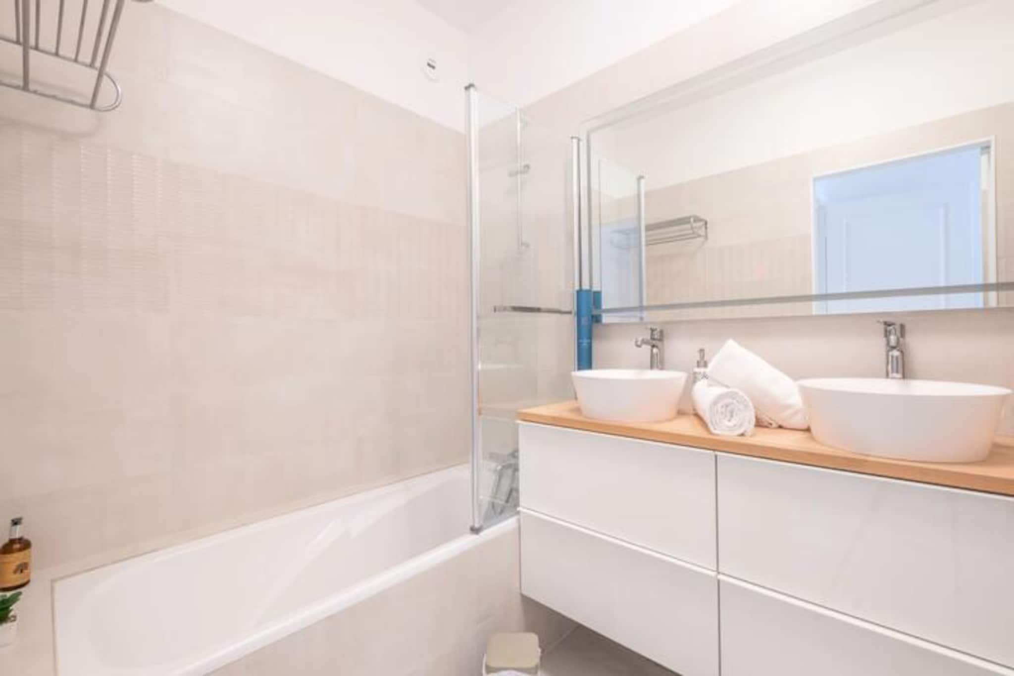 Forestil dig at vågne op til den blide lyd af bølger, der skyller mod kysten, med solen, der står op over Lérins-øerne lige uden for dit vindue. Denne totalrenoverede lejlighed i stueetagen i Cannes tilbyder en uovertruffen ferie ved havet, der kombinerer moderne luksus med charmen ved kystlivet. Med direkte adgang til stranden kun 30 sekunder væk og en frodig have på 150 m² med udsigt over havet, er denne ejendom perfekt til dem, der søger ro og bekvemmelighed i lige mål. Beliggende få skridt fra Palm Beach Village, er det en oase, hvor afslapning møder levende lokal kultur. \n\nIndenfor er lejligheden designet med omhyggelig sans for detaljer. Den rummelige stue åbner ud mod haven, hvilket skaber en problemfri inde-udendørs oplevelse. Et smart-tv, sovesofa og spisebord til op til seks gæster supplerer det fuldt udstyrede åbne køkken, komplet med førsteklasses apparater som en Nespresso-maskine og SodaStream. Soveværelset har en queensize-seng, garderobe og eget badeværelse, mens det andet soveværelse har to enkeltsenge. Et andet brusebad med toilet sikrer komfort for alle gæster. Aircondition og Wi-Fi er inkluderet, og en privat parkeringskælder gør dit ophold endnu mere behageligt.\n\nBeliggenheden er uovertruffen. Inden for fire minutters gang finder du en charmerende landsbylignende butiksgade med bageri, slagter, fiskehandler og supermarked. Restauranter og private strande ligger lige så tæt på, mens den ikoniske Croisette og Palais des Festivals kun ligger en kort gåtur eller køretur væk. Offentlige transportmuligheder og nærheden til Nice Côte d'Azur Lufthavn gør det nemt at udforske den franske riviera.\n\nUanset om du er her for Cannes' glamour eller Middelhavets ro, tilbyder denne lejlighed den perfekte base for at skabe uforglemmelige minder. Lad havbrisen og den fantastiske udsigt inspirere din ferie i dette idylliske tilflugtssted.
