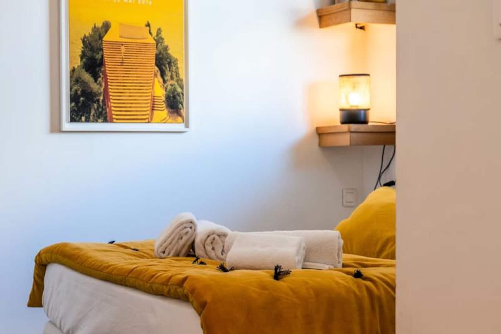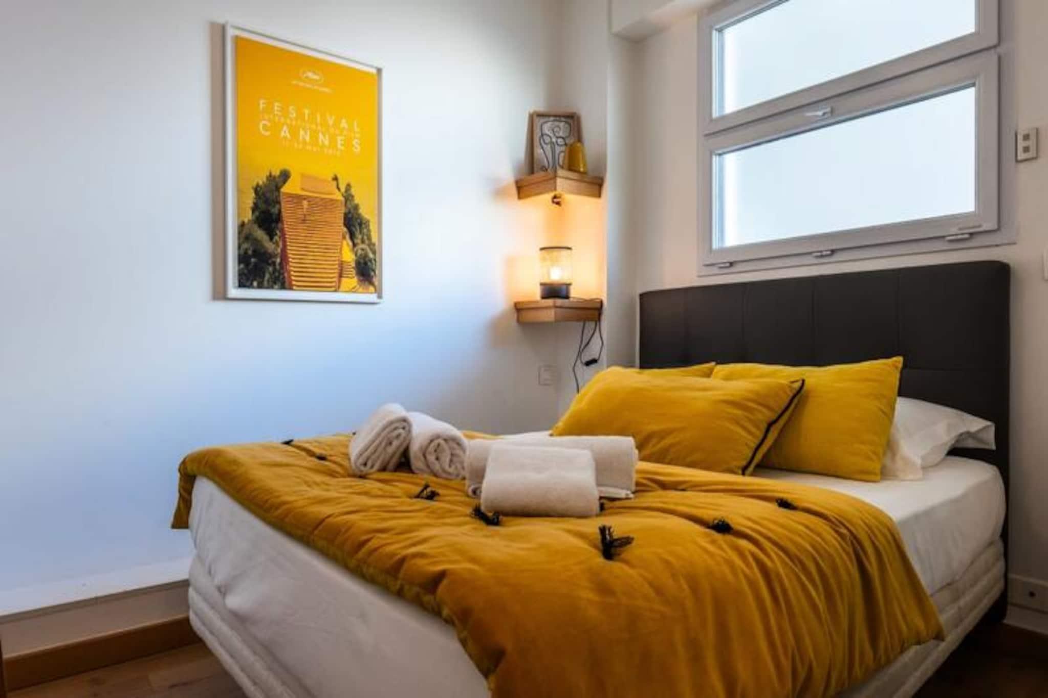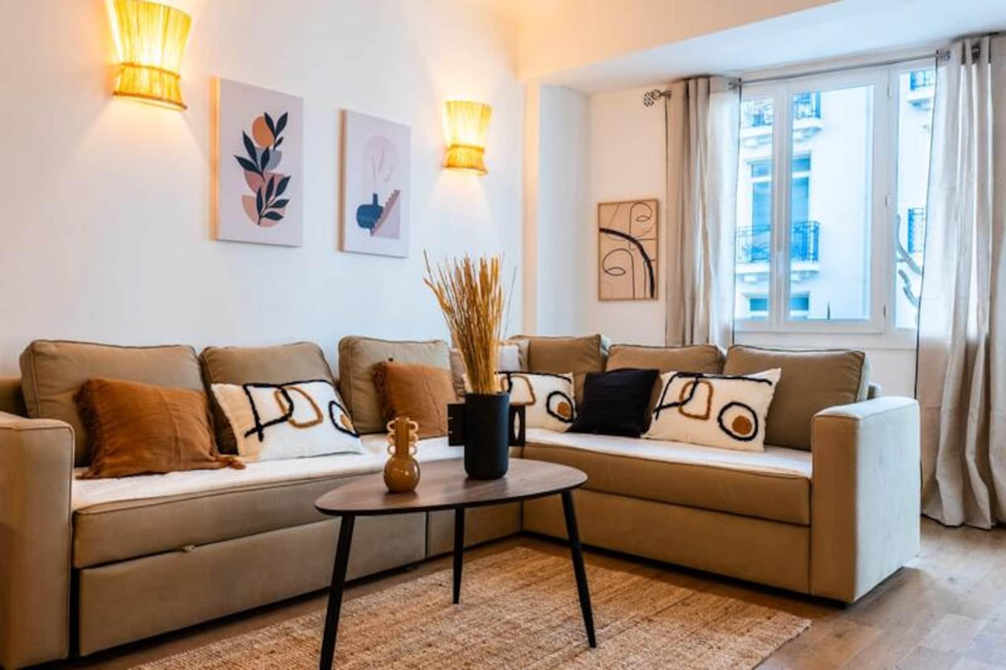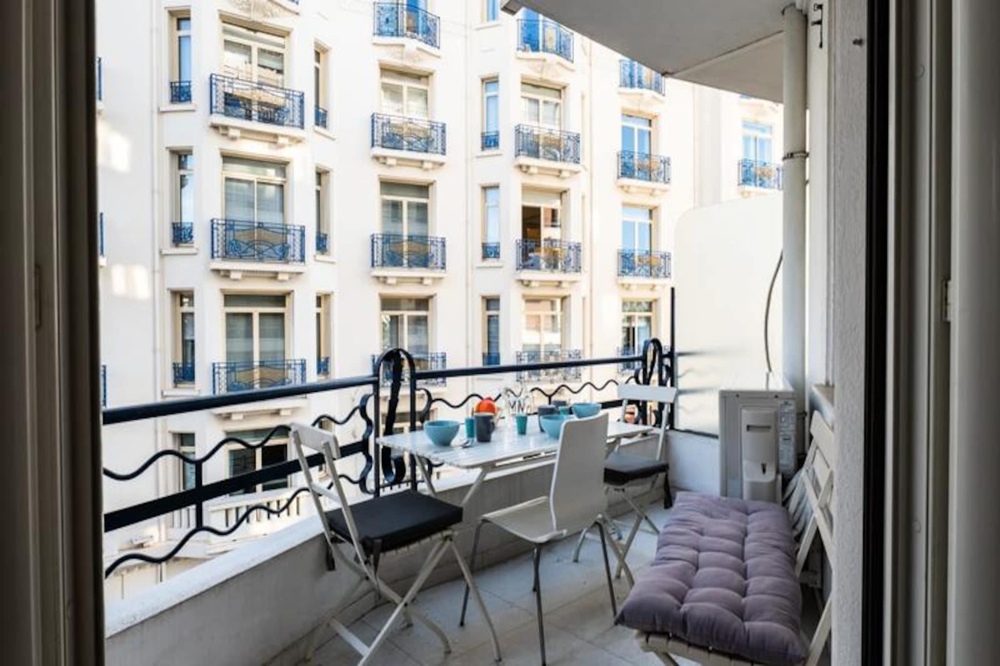 Træd ind i hjertet af Cannes og oplev denne elegante lejlighed med to soveværelser, perfekt beliggende kun få skridt fra den ikoniske Croisette. Med sine pulserende omgivelser og nærhed til byens fineste attraktioner tilbyder denne ejendom en ideel base for at udforske Cannes med venner eller kære. Forestil dig at nippe til din morgenkaffe på den østvendte terrasse med udsigt over det berømte Martinez Hotel, mens du nyder den delvise havudsigt og den livlige atmosfære på Rue Latourg-Maubourg. Uanset om du er her for glamouren i Palais des Festivals eller charmen i de lokale gader, placerer denne lejlighed dig i centrum af det hele. \n\nIndenfor udstråler lejligheden varme og elegance med sin smagfulde indretning og gennemtænkte designede rum. Den rummelige opholdsstue er opdelt i tre forskellige zoner: en hyggelig stue med en blød sofa og fladskærms-tv, et fuldt udstyret åbent køkken med ovn og mikrobølgeovn samt en spiseplads til fire personer, der åbner ud til terrassen. Begge soveværelser har queensize-senge, indbyggede skabe og blødt sengetøj for at sikre afslappende nætter. Det større soveværelse har endda et fladskærms-tv for ekstra komfort. Et moderne badeværelse med en stor bruser fuldender rummet og tilbyder alt, hvad du behøver for et afslappende ophold. \n\nTræd udenfor, og du vil være omgivet af trendy barer, restauranter og butikker. Gå en tur langs Croisetten, shoppe på Rue d'Antibes, eller nyd morgenmad og cocktails på Rue Hoche - alt sammen få minutter fra din dør. For dem, der søger et livligt natteliv, fortsætter områdets pulserende energi ind i aftenen, med nærliggende steder, der skaber en spændende atmosfære. \n\nUanset om du besøger byen for glamouren, maden eller kystcharmen, tilbyder denne lejlighed en problemfri blanding af komfort og bekvemmelighed, hvilket gør den til det perfekte valg til din Cannes-ferie.
