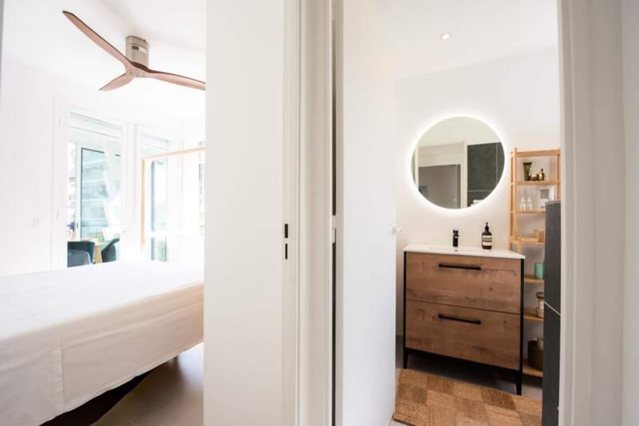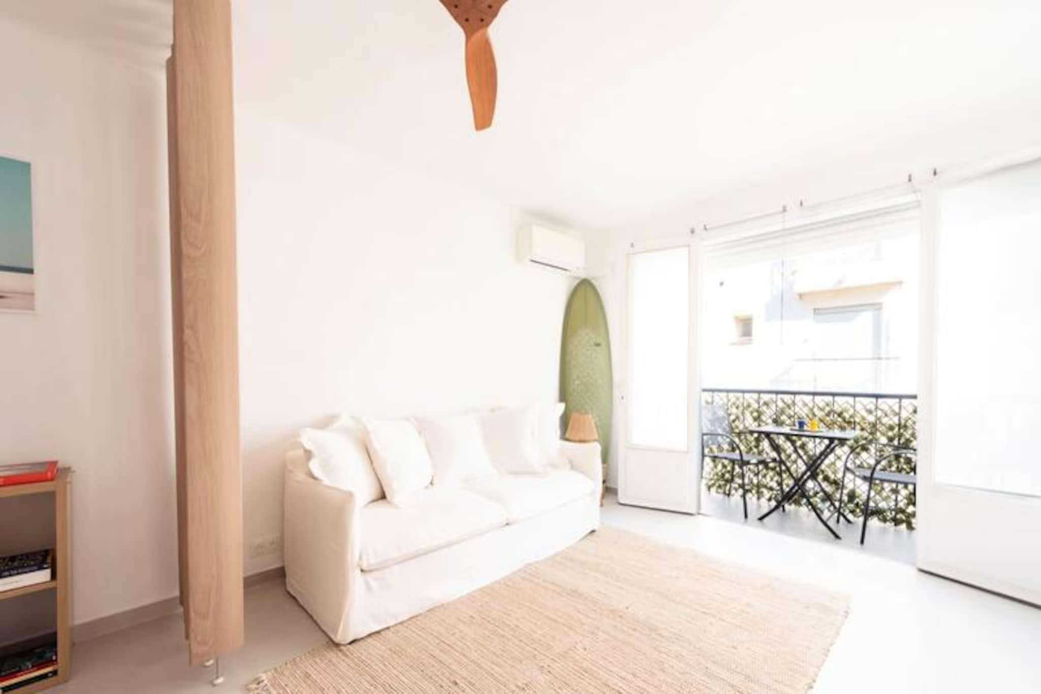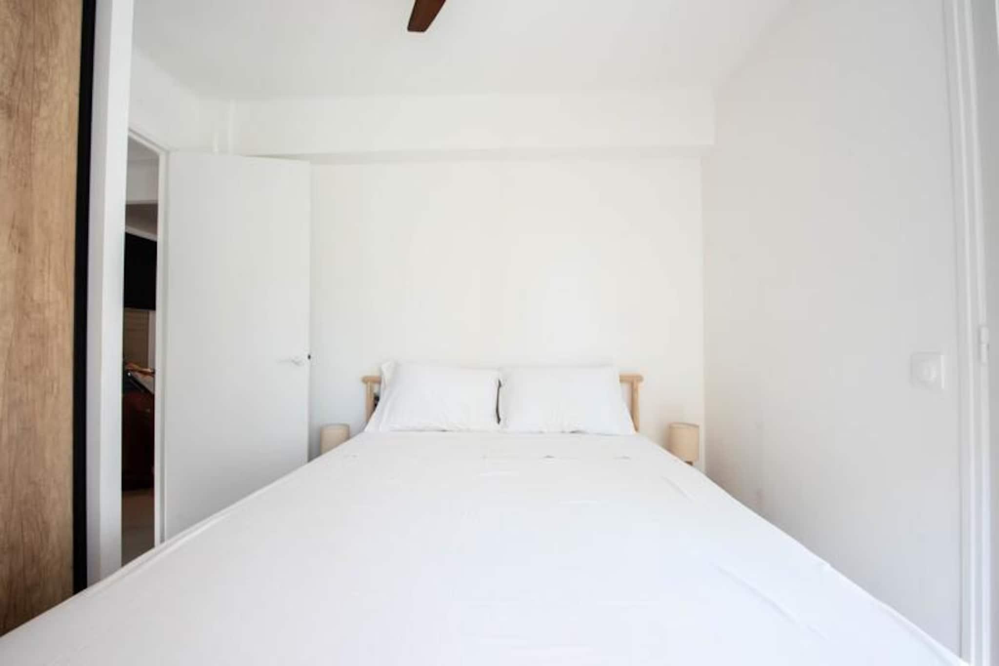 Badet i den franske rivieras gyldne lys tilbyder denne nyrenoverede lejlighed i det prestigefyldte Palm Beach-distrikt i Cannes en uovertruffen blanding af komfort og bekvemmelighed. Forestil dig at vågne op til den blide havbrise og slentre til de nærliggende strande eller den ikoniske Croisetten, kun få minutter væk. Den pulserende, men rolige atmosfære i Palm Beach skaber den perfekte baggrund for et mindeværdigt ophold på en af ??verdens mest glamourøse destinationer. Uanset om du er her for fritiden eller til den berømte filmfestival i Cannes, er denne lejlighed din port til det bedste af Rivieraen. \n\nTræd indenfor og oplev et lyst og rummeligt toværelses tilflugtssted designet til afslapning og ro. Stuen, der er fyldt med naturligt lys, har en hyggelig lounge med en sovesofa, et stort Smart TV og adgang til en charmerende balkon. Det åbne køkken med en central køkkenø inviterer dig til at nyde en hurtig morgenmad, før du tager ud for at udforske. Soveværelset med sin queensize-seng og loggia-adgang lover afslappende nætter, mens det moderne walk-in brusebad tilføjer et strejf af luksus til din daglige rutine. Reversibel aircondition og Wi-Fi sikrer din komfort under hele dit ophold.\n\nDenne lejlighed ligger kun en kort gåtur fra Mouré Rouge-stranden og Croisetten og placerer dig i hjertet af Cannes' pulserende Palm Beach-distrikt. Nyd bekvemmeligheden ved nærliggende butikker, herunder bagerier, supermarkeder og butikker, alt sammen inden for fem minutters gang. Offentlig transport og gratis gadeparkering gør det nemt at udforske området. Palais des Festivals, epicentret for Cannes' kulturelle scene, ligger kun 20 minutters gang væk, perfekt til dem, der deltager i arrangementer eller søger underholdning.\n\nUanset om du nyder det lokale køkken, soler dig i middelhavssolen eller opdager charmen ved Cannes, tilbyder denne lejlighed de ideelle rammer for en Riviera-flugt. Lad Palm Beachs elegance og den franske rivieras tiltrækningskraft skabe uforglemmelige minder under dit ophold.