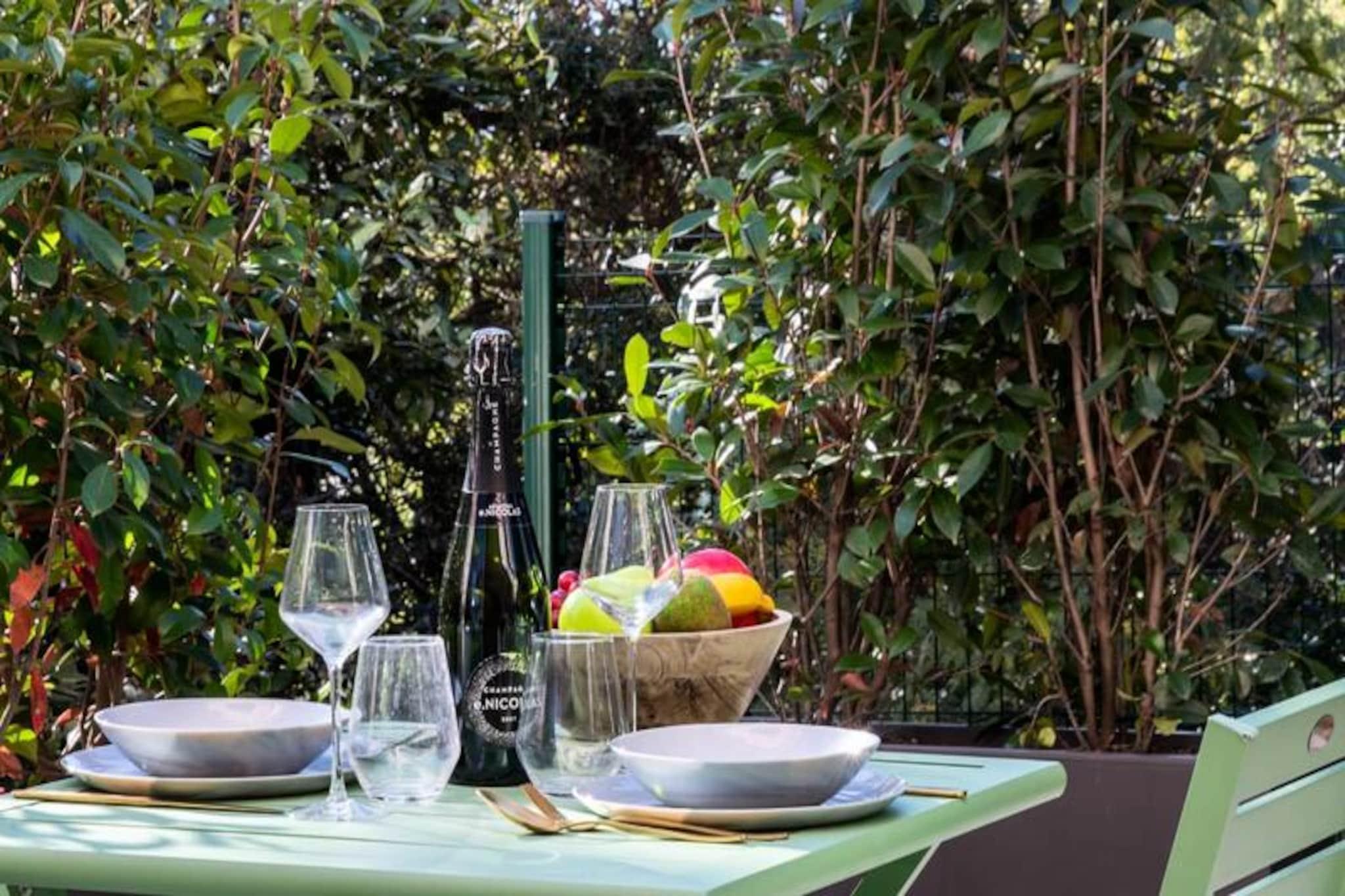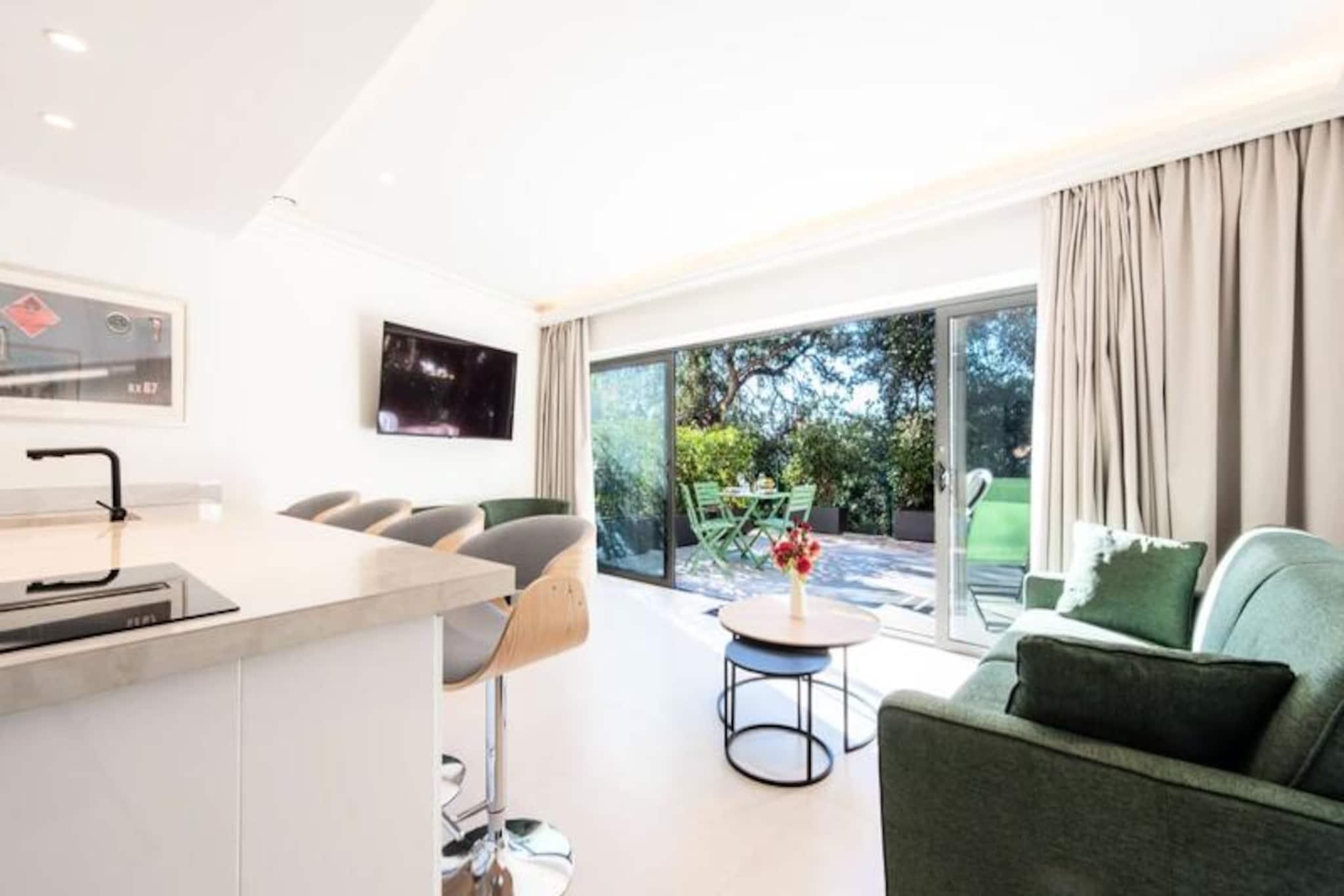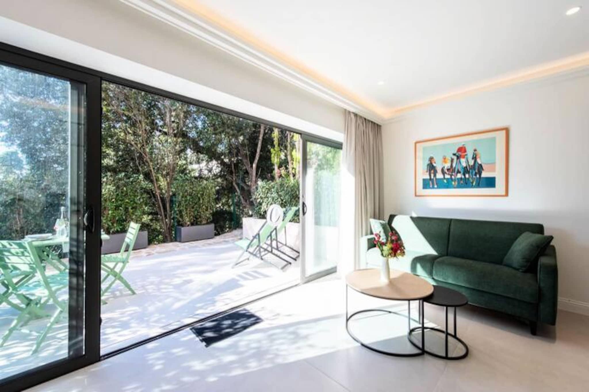 Midt i Cannes' pulserende charme tilbyder denne afsondrede duplexlejlighed et roligt tilflugtssted omgivet af frodigt grønt. Uden naboer ovenover inviterer denne bolig i haveplan dig til at slappe af i ro og ro, hvor moderne elegance blandes med naturlige materialer. Forestil dig selv sole dig i Riviera-solen på din private terrasse og nyde freden efter en dag med at udforske Cannes' ikoniske kystlinje og glamourøse gader.\n\nTræd indenfor for at opdage et lyst og luftigt opholdsrum, omhyggeligt designet til komfort og stil. Stuen har en enkelt sovesofa, Smart TV og spiseplads, mens det åbne køkken er fuldt udstyret med kogeplader, ovn, køleskab og opvaskemaskine - perfekt til at tilberede måltider ligesom derhjemme. Ovenpå har soveværelset en queensize-seng, Smart TV, skrivebordsområde og garderobe, suppleret af et elegant brusebad og separat toilet. Reversibel aircondition sikrer komfort året rundt, mens møbler af høj kvalitet forbedrer den overordnede atmosfære.\n\nBeliggende kun få minutter fra Cannes' mest ikoniske attraktioner, er denne lejlighed ideelt placeret til at udforske den franske riviera. La Croisette-stranden ligger en afslappet 20-minutters gåtur væk, mens Palais des Festivals et des Congrès kun ligger 10 minutters kørsel derfra. Forkæl dig selv med luksusshopping og gourmetmad langs Croisetten, eller tag på en naturferie til Lérins-øerne, kun 12 minutter med færge.\n\nUanset om du er her for Cannes' glamour eller Rivieraens naturlige skønhed, tilbyder denne lejlighed den perfekte blanding af bekvemmelighed, komfort og charme. Lad denne fredelige oase være dit hjem væk fra hjemmet, hvor uforglemmelige minder venter.