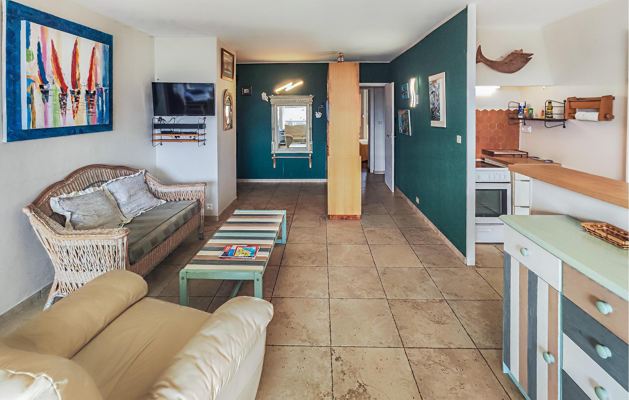 Denne lyse og indbydende lejlighed venter jer i den afslappede havn i Cap d'Agde og tilbyder den perfekte mulighed for at kombinere afslappende dage ved havet med dejlige udflugter ind i landet. Tilbered lækre måltider i det åbne køkken, planlæg jeres aktiviteter ved det indbydende spisebord og læn jer tilbage på sofaen efter en lang dag med et brætspil eller en god bog.