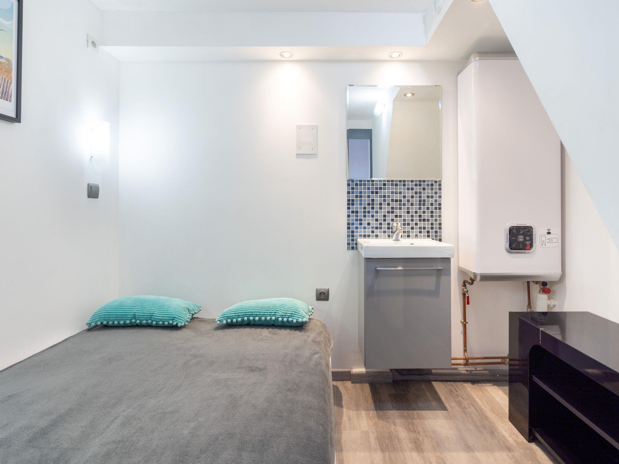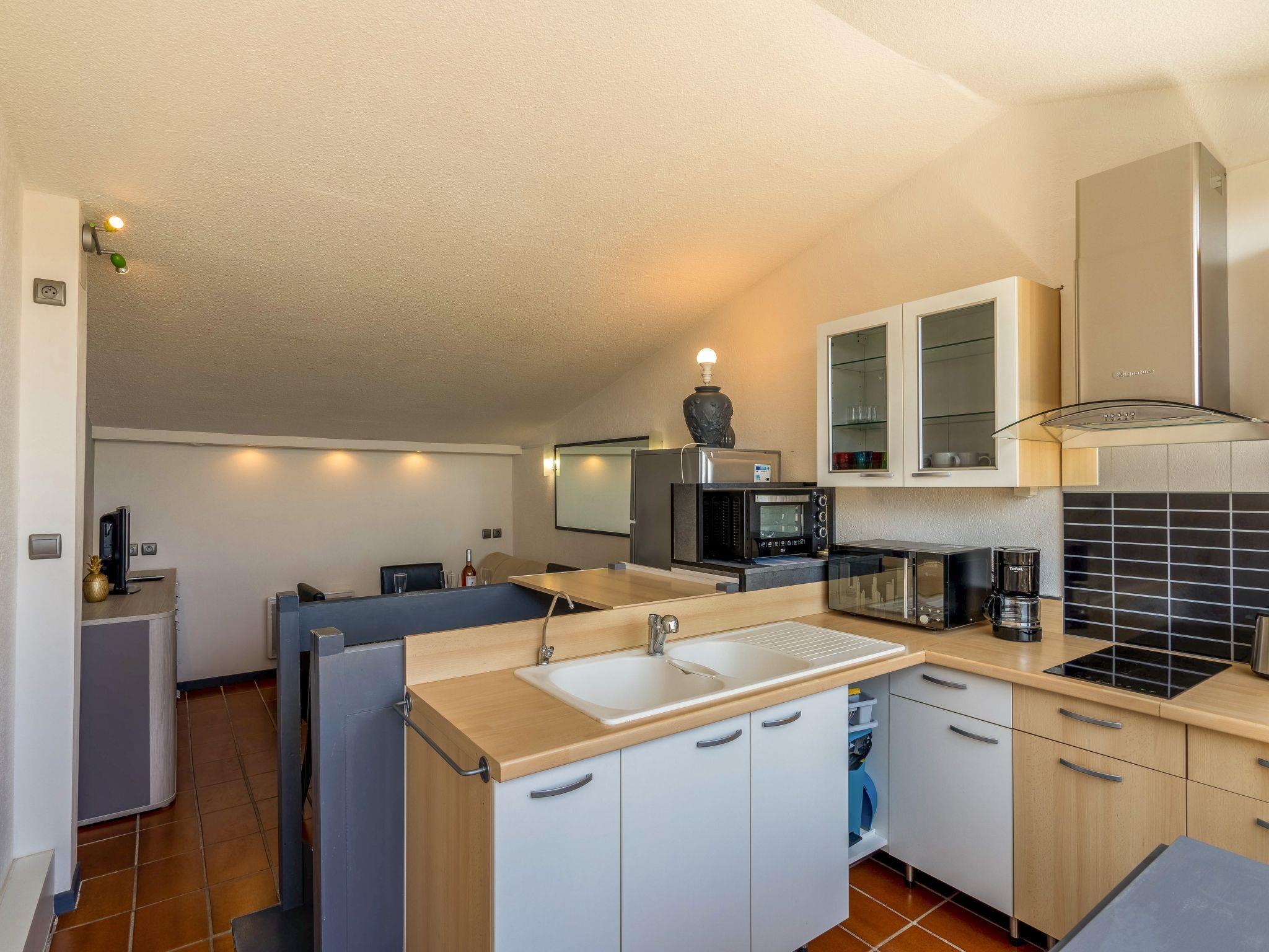 "Les Héliades", 3-room apartment 42 m2 on 2 levels on 3rd floor. 1 room 12 m2 with 1 french bed (140 cm, length 190 cm). Sleeping alcove 5 m2 with 1 double sofabed (140 cm, length 190 cm). Shower, sep. WC. Heating, electric heating. Upper floor: (steep stair) living/dining room 12 m2 with TV (flat screen). Kitchenette (2 induction hot plates, toaster, kettle, microwave, electric coffee machine). Exit to the terrace, south facing position and east facing position. Large terrace 13 m2, south facing position and, east facing position. Terrace furniture. Very beautiful view of the sea and the port. Facilities: Internet (WiFi, extra). Parking space n 45. Please note: maximum 1 pet/ dog allowed. Smoke alarm. Instead of an enclosed bedroom, some sleeping areas are located in an open-plan area (gallery, alcove, etc.).