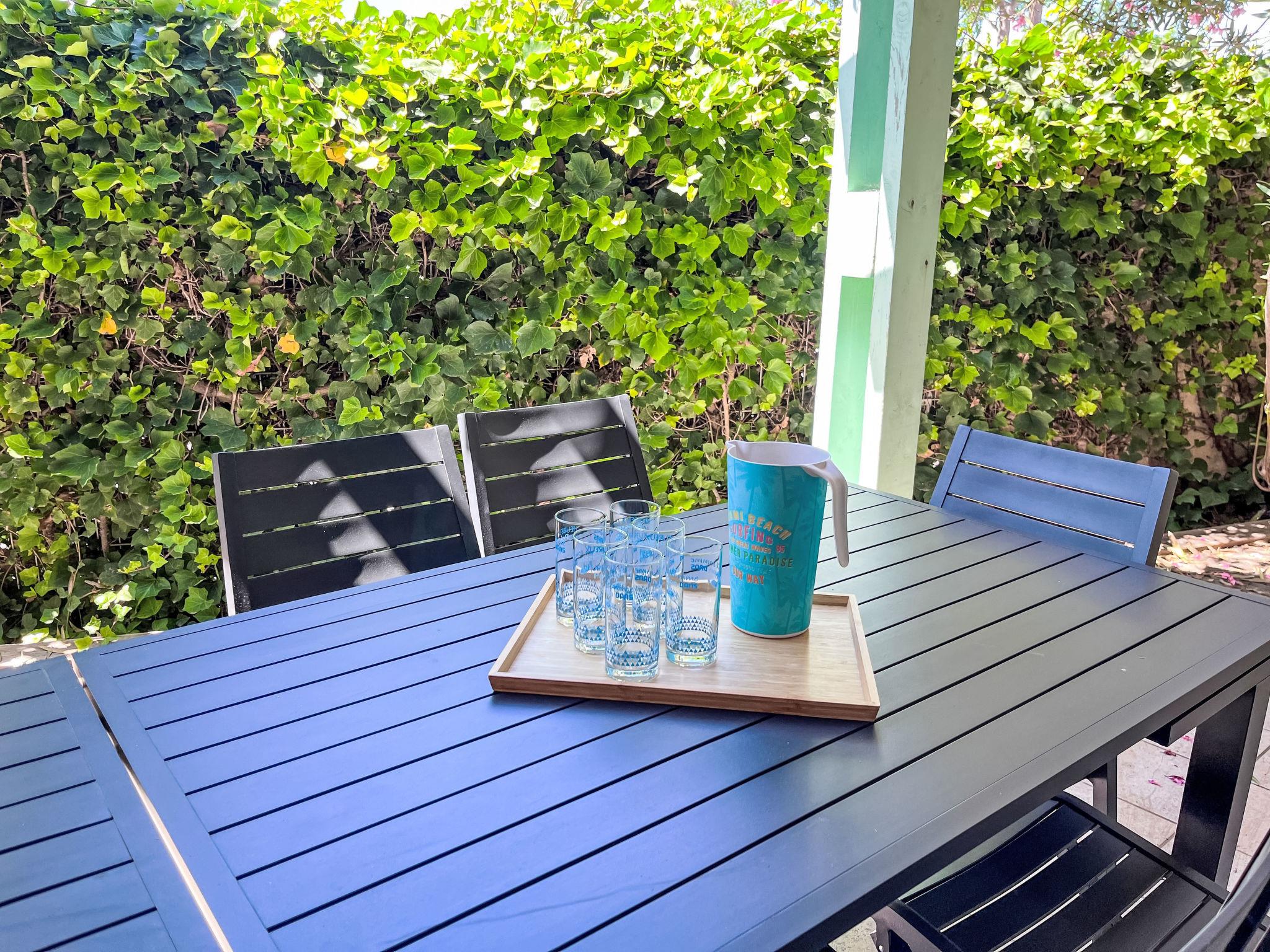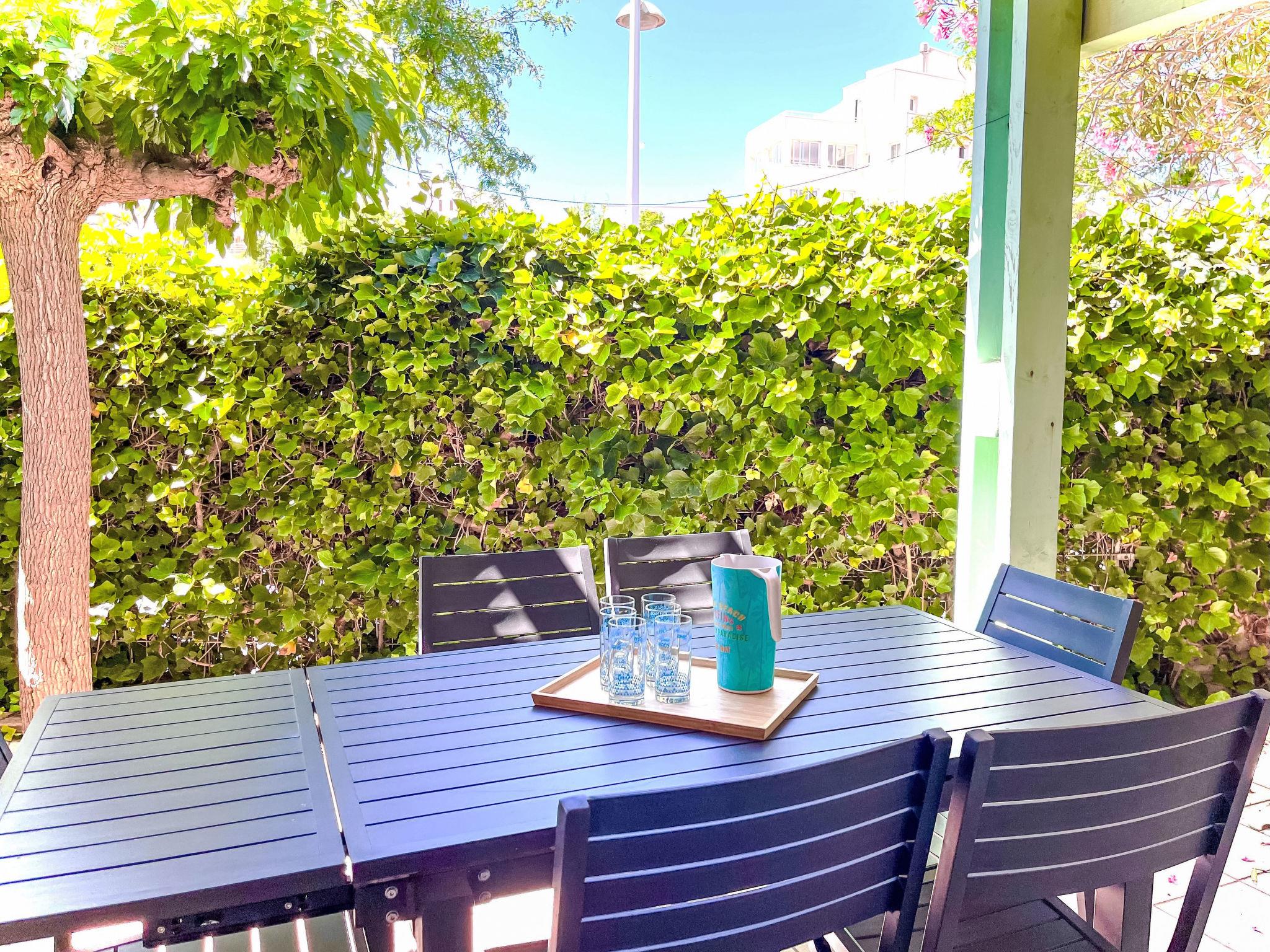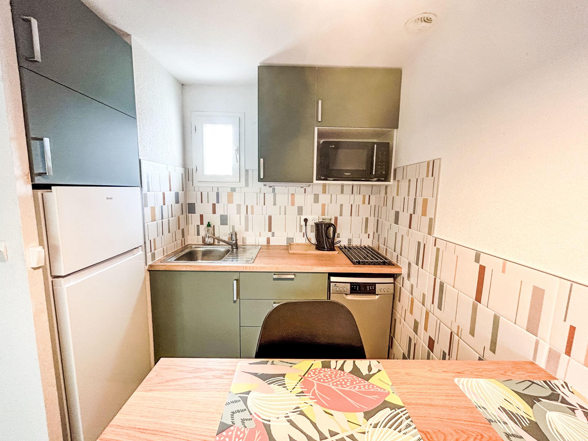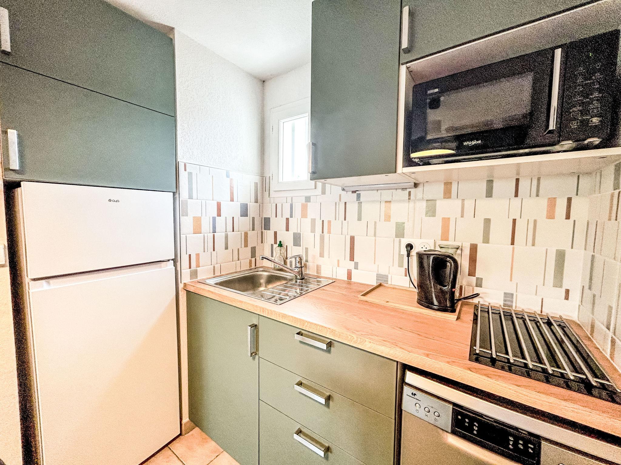 3-room terraced house 37 m2 on 2 levels. Partly renovated in 2013: living/dining room with TV and air conditioning. Exit to the terrace. Kitchenette (dishwasher, 2 ceramic glass hob hotplates, microwave). Upper floor: 1 room with 1 french bed (140 cm, length 190 cm). 1 room with 2 beds (90 cm, length 190 cm). Bath/WC, sep. WC. Electric heating. Terrace 10 m2, south facing position, patio. Terrace furniture. Facilities: washing machine. Internet (WiFi, extra). Parking. Please note: apartment street side. Smoke alarm.