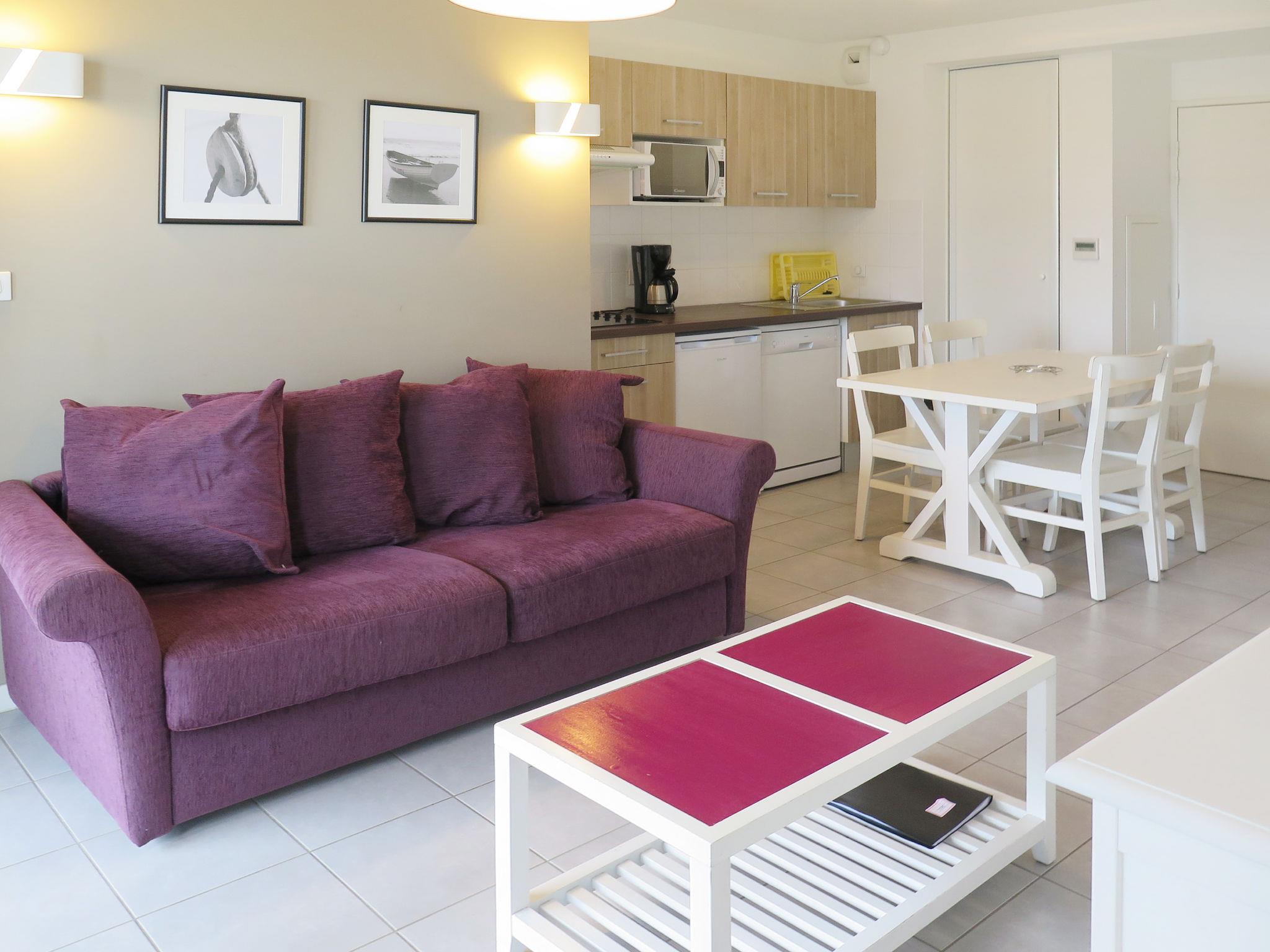 "L'Estacade", 2-room apartment 43 m2. Bright, practical furnishings: living/sleeping room with 1 double sofabed, dining table and TV. 1 room with 1 french bed (160 cm). Alcove with 1 x 2 bunk beds (80 cm). Kitchenette (dishwasher, 4 ceramic glass hob hotplates, toaster, kettle, microwave, electric coffee machine). Bathroom, sep. WC. Electric heating. Balcony or terrace. Terrace furniture, balcony furniture. Facilities: Internet (WiFi, extra). Please note: non-smokers only. Maximum 1 pet/ dog allowed. Smoke alarm, fire extinguisher. The property is one of a type of property or apartment. Instead of an enclosed bedroom, some sleeping areas are located in an open-plan area (gallery, alcove, etc.).