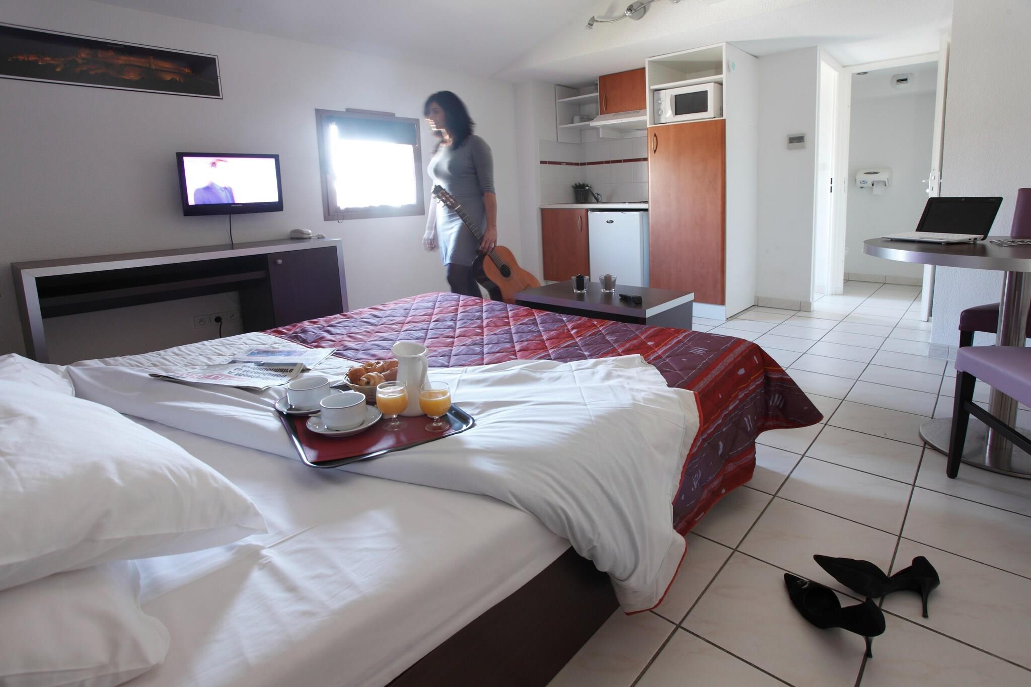 Ved foden af Carcassonnes legendariske middelalderfæstning tilbyder denne charmerende feriebolig den perfekte indgang til historie, kultur og afslapning. Med sin førsteklasses beliggenhed kun få skridt fra den UNESCO-beskyttede Cité kan du starte din morgen med synet af århundreder gamle tårne og brostensbelagte gader, der venter på at blive udforsket. Uanset om du er her for at fordybe dig i byens rige kulturarv eller blot slappe af, blander atmosfæren gammeldags magi med moderne komfort. Boligen har elegant designede, airconditionerede interiører, der er omhyggeligt indrettet til to gæster, hvilket skaber en hyggelig og romantisk ramme for et parferie, inklusive en rummelig stue med siddepladser og tv, et soveværelse med dobbeltseng, et simpelt køkken, hvor I kan tilberede lette måltider, og endelig et moderne badeværelse til hverdagens bekvemmelighed. Start din morgen i det indbydende morgenmadslokale, del rolige øjeblikke på den smukke fællesterrasse, eller nyd bekvemmeligheden ved parkering på stedet. Hver detalje er designet til at gøre dit ophold både behageligt og mindeværdigt, samtidig med at du placerer dig lige i hjertet af Carcassonnes charme. Fra din hoveddør kan du slentre til den majestætiske Basilica de Saint-Nazaire, krydse den historiske Pont Vieux over floden Aude, eller fortabe dig i labyrinten af middelalderlige gader. Og med fæstningen kun 300 meter væk er du aldrig langt fra dens imponerende mure, pulserende markeder og stemningsfulde caféer. Her byder hver dag på den perfekte blanding af historiens fortryllende og den lette moderne flugt.