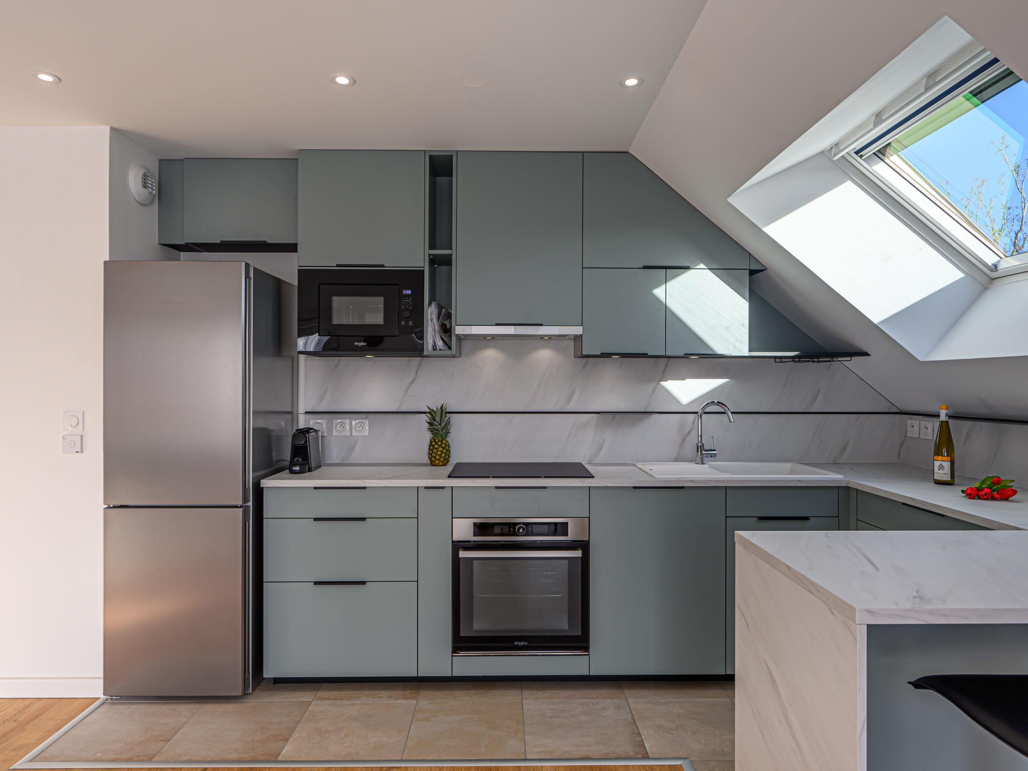 Residence "Les Terrasses de Saint-Colomban", 2 storeys, built in 2024. In the resort 500 m from the centre of Carnac bourg, 1.5 km from the sea, 1.5 km from the beach. In the house: lift, storage room for bicycles. Single garage. Grocery, supermarket 230 m, restaurant, bakery, café 400 m, bus stop 500 m, sandy beach "Grande Plage de Carnac" 1.5 km, thermal baths "Thalazur Carnac" 1.3 km.