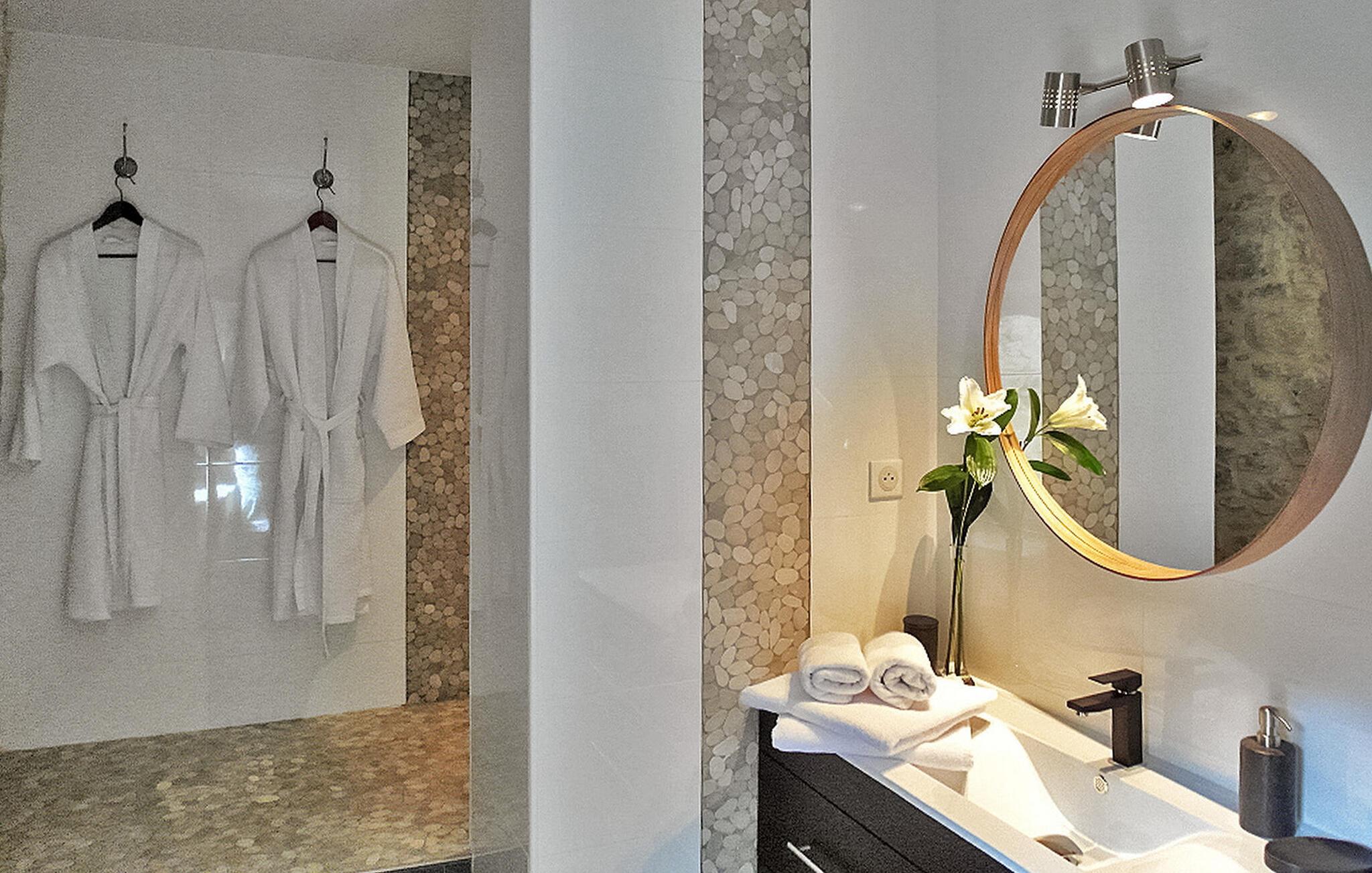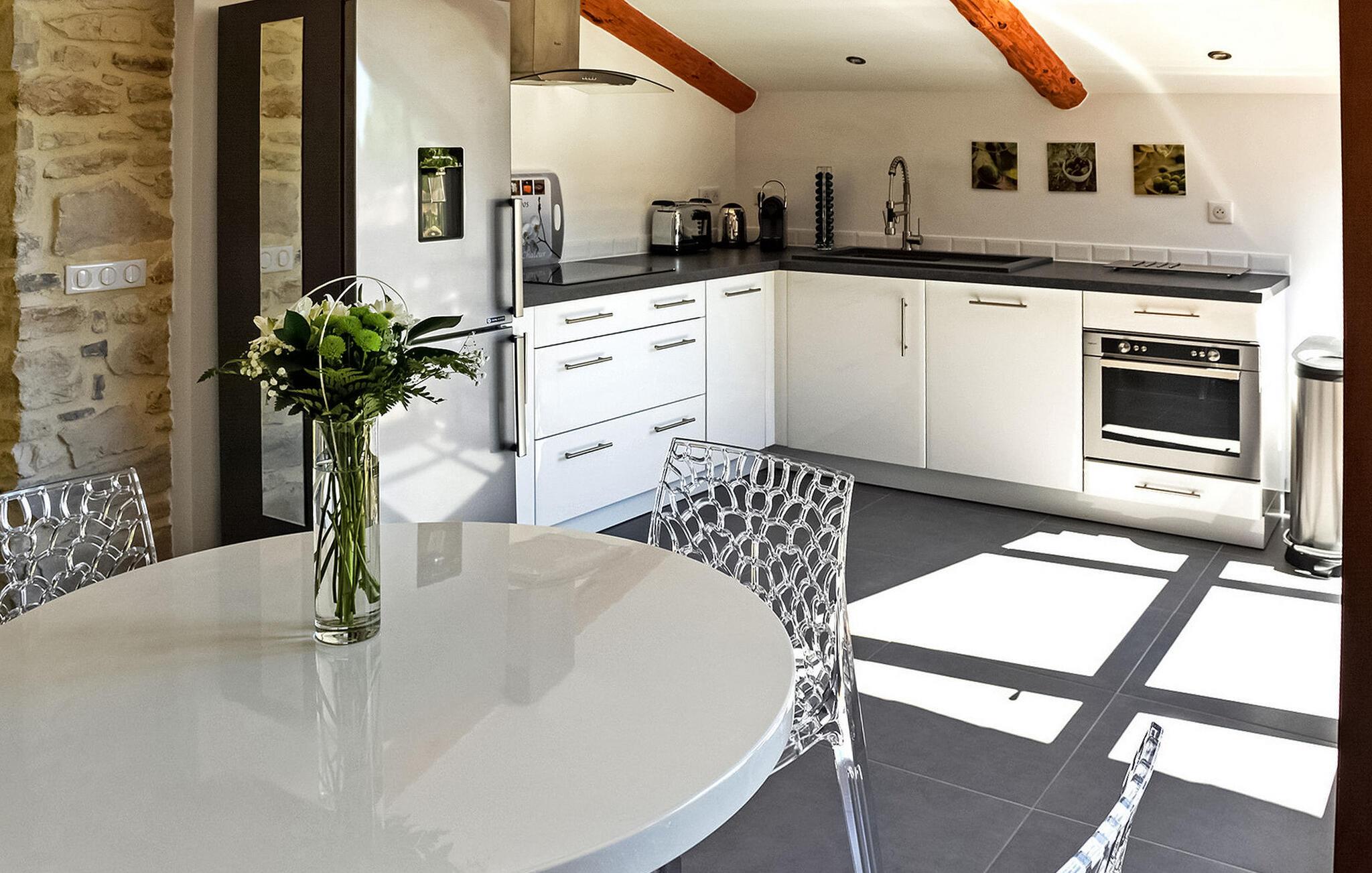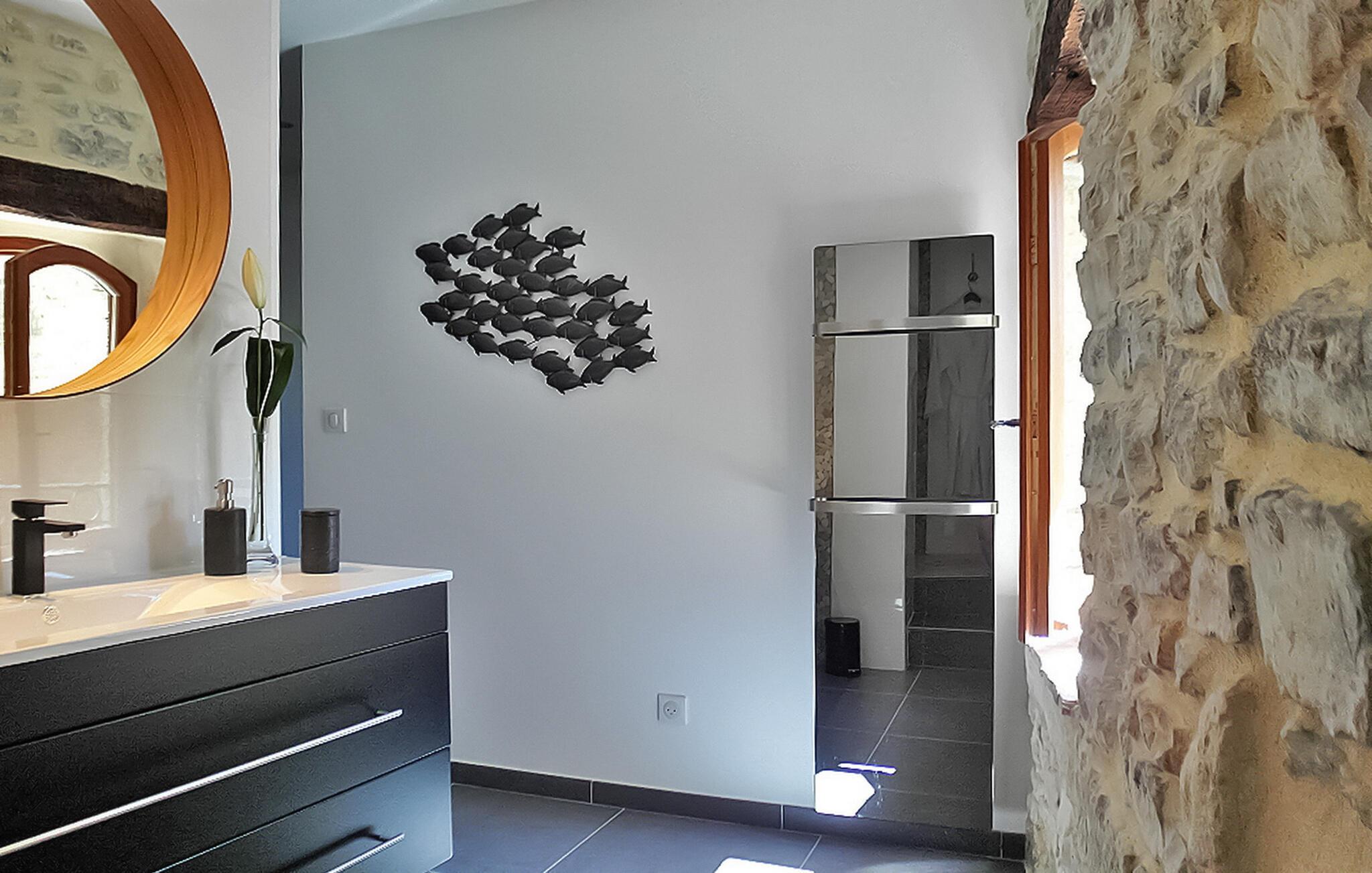 Nyd denne ferieudlejning designet til to, og lover et intimt og romantisk tilflugtssted mellem Nîmes og Montpellier. Beliggende i et tidligere kloster fra det 9. århundrede, kan denne prestigefyldte ejendom prale af seks udsøgte feriehuse, hver skræddersyet til to gæster, midt i en fredfyldt ejendom omgivet af vinmarker. Denne udlejning udstråler luksus og komfort. Det nederste niveau, der ligger på 1. sal, inviterer dig til at slappe af med stil. Beundre den blottede stenvæg, slap af på en designer-lædersofa fra Roch & Bobois, og forkæl dig selv med det gigantiske fladskærms-tv, der er synligt fra den hyggelige seng. For ekstra forkælelse kan du nyde den 2-personers indendørs jacuzzi med massagedyser og farveterapi. Gå op til det øverste niveau via en lufttrappe for at finde et veludstyret køkken. Få adgang til den charmerende terrasse, der ligger på toppen af tagene og tilbyder panoramaudsigt, et bord til udendørs spisning og to indbydende liggestole. Ud over boligen kan du udforske den fælles park med fængslende vingårdsudsigt og nyde den sikrede swimmingpools forfriskende vand, beskyttet af en alarm. Deltag i afslappet grillaften med en kulgrill og nyd venskabelige spil petanque på banen. Oplev et virkelig fortryllende feriested i denne luksuriøse udlejning, fyldt med overdådighed, komfort og betagende omgivelser. Ejendommen er beliggende mellem Nîmes og Montpellier, tæt på landsbyen Carnas, nær den middelalderlige landsby Sommières. Med 300 solskinsdage om året byder dette hjørne af paradis i den provencalske Gard på landskaber af sjælden skønhed: 30 minutter til Camargue og sandstrandene i Languedoc. Et stenkast væk afslører nationalparken Cévennes lige så spektakulære landskaber. Regionen er rig på en fantastisk historisk arv: Byen Avignon, de romerske byer Nîmes og Arles, Pont du Gard, Hertugdømmet Uzès, de historiske Languedoc-byer Montpellier, Pézenas, Aigues-Mortes, Sommières og Sauve og et væld af charmerende landsbyer at besøge. Denne ferieejendom er et ideelt udgangspunkt for at opdage Camargue, Cevennerne, Gard Provençal, Languedoc.