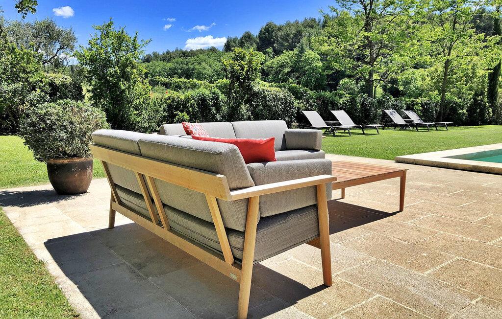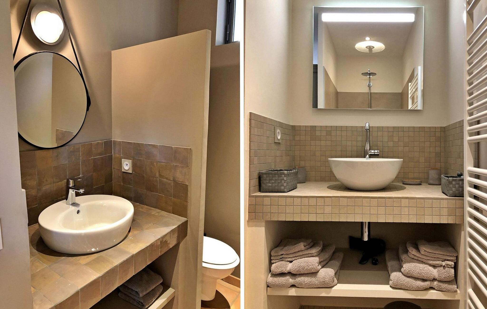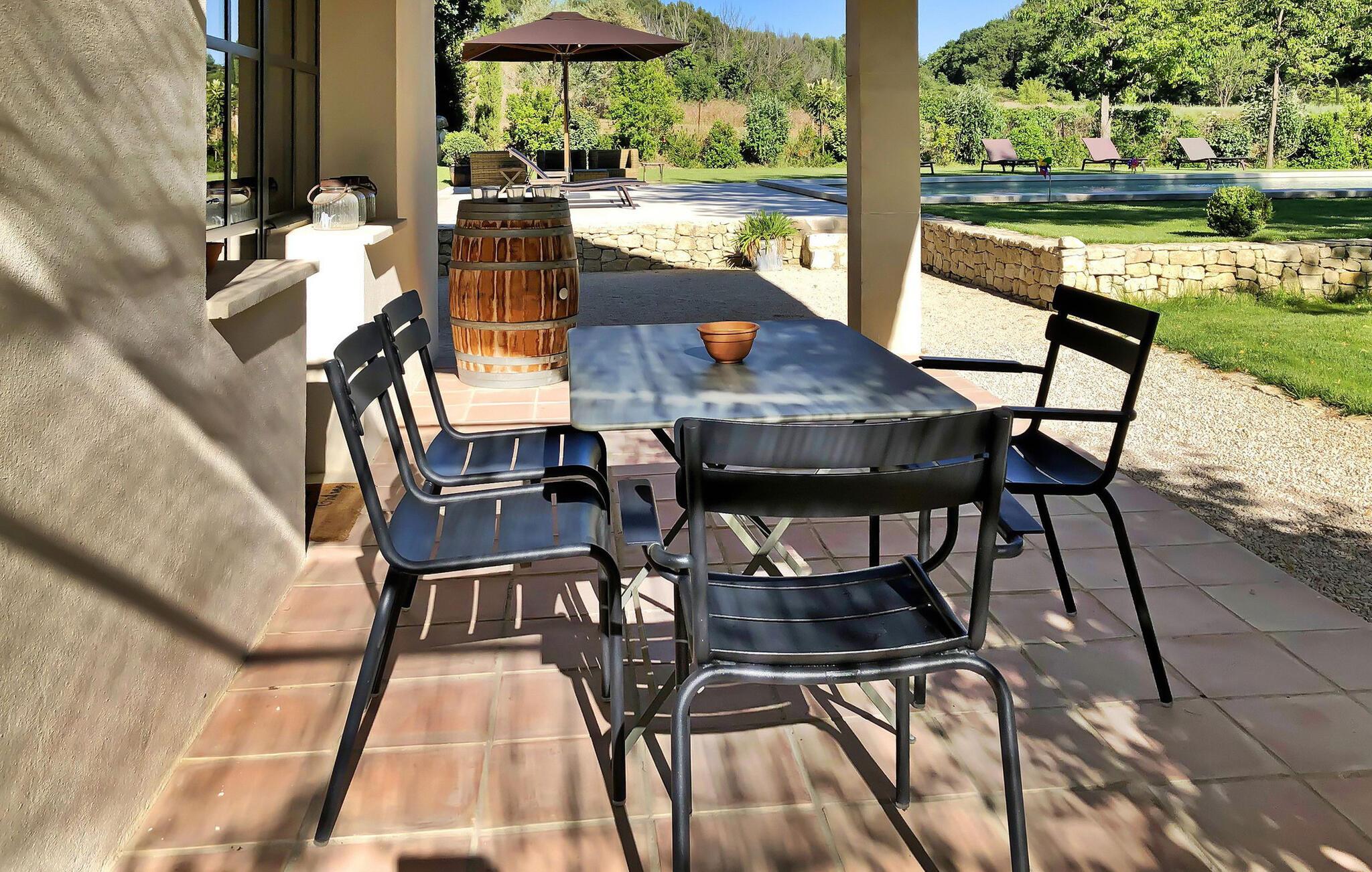 I tilknytning til spisestuen er en overdækket terrasse udstyret med havemøbler, som indbyder til at spise udenfor. Den flisebelagte terrasse foran køkkenet byder på en fortryllende ramme om et hyggeligt måltid. En opvarmet pool, åben fra april til slutningen af ??september, og en skyggefuld boulebane inviterer dig til at slappe af og slappe af. Den smukt anlagte have byder på naturlig skygge og et charmerende springvand. Bemærk venligst: For et ophold på to uger er en midlertidig rengøring inkluderet i prisen. Lejligheden er også ideel til en vinterferie, da den er meget velisoleret og har gulvvarme.