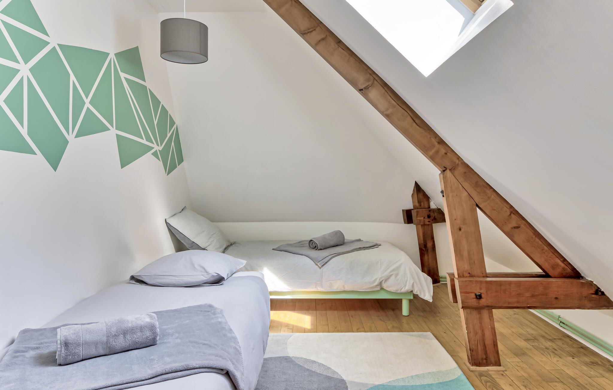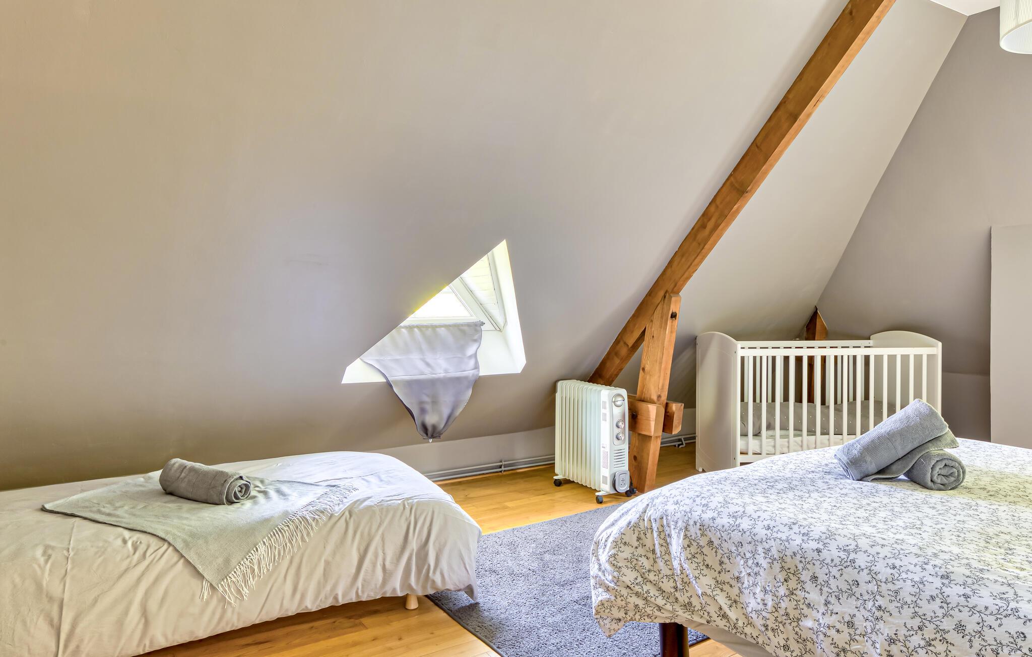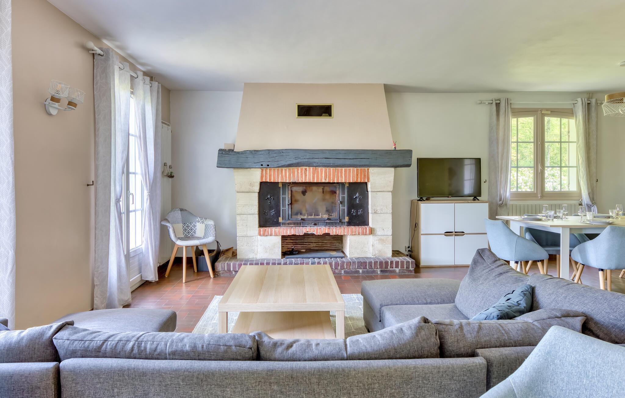 Velkommen til dette rummelige hjem, hvor I kan tilbringe afslappende dage med venner eller familie i hjertet af Normandiets landskab. Glæd jer til hyggelige stunder i den hyggelige spisestue og stemningsfulde aftener ved brændeovnen. Spil bordfodbold, nyd den fredelige atmosfære med en god bog, og planlæg jeres aktiviteter med et glas vin i den behagelige sofa.