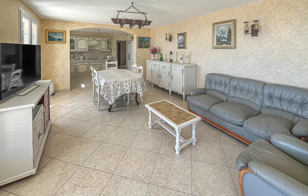 Bliv budt velkommen af ??den klassiske indretning i den rummelige opholds- og spisestue, der er karakteriseret af lyse fliser og varme farver. Store vinduer og døre åbner op for udsigten til naturen og oversvømmer værelserne med naturligt lys. Tag plads ved spisebordet med den naturskønne udsigt eller slap af i sofaen. Nyd at lave mad sammen i det åbne køkken i landlig stil, og værdsæt den korte afstand mellem køkken og spisestue.