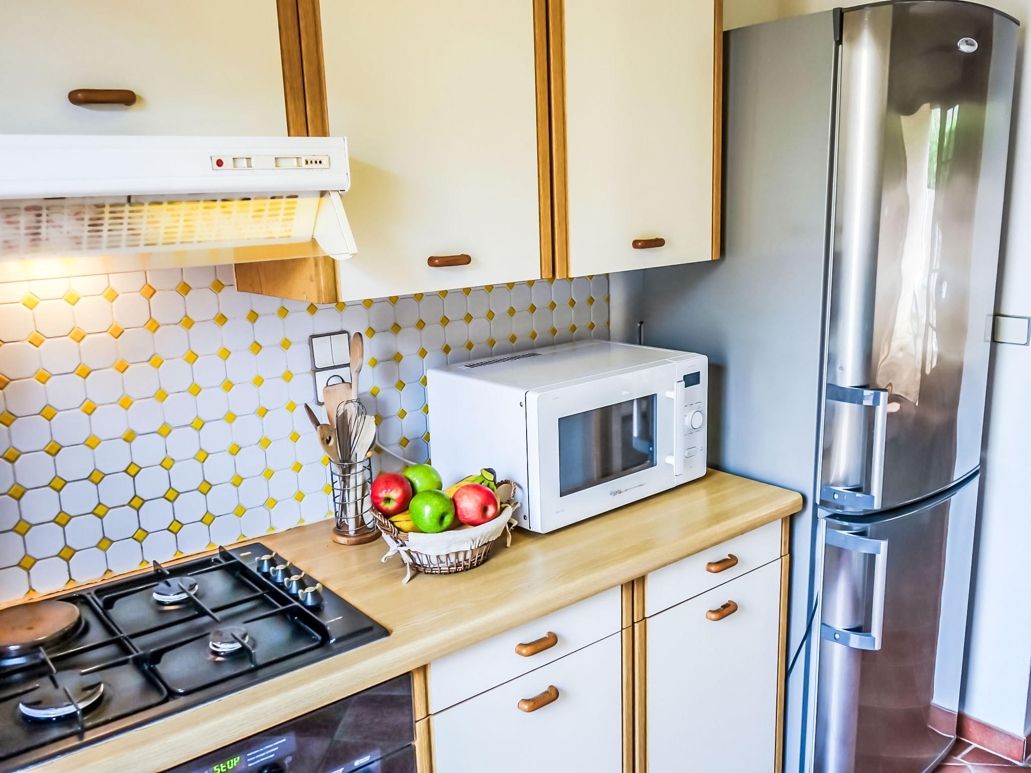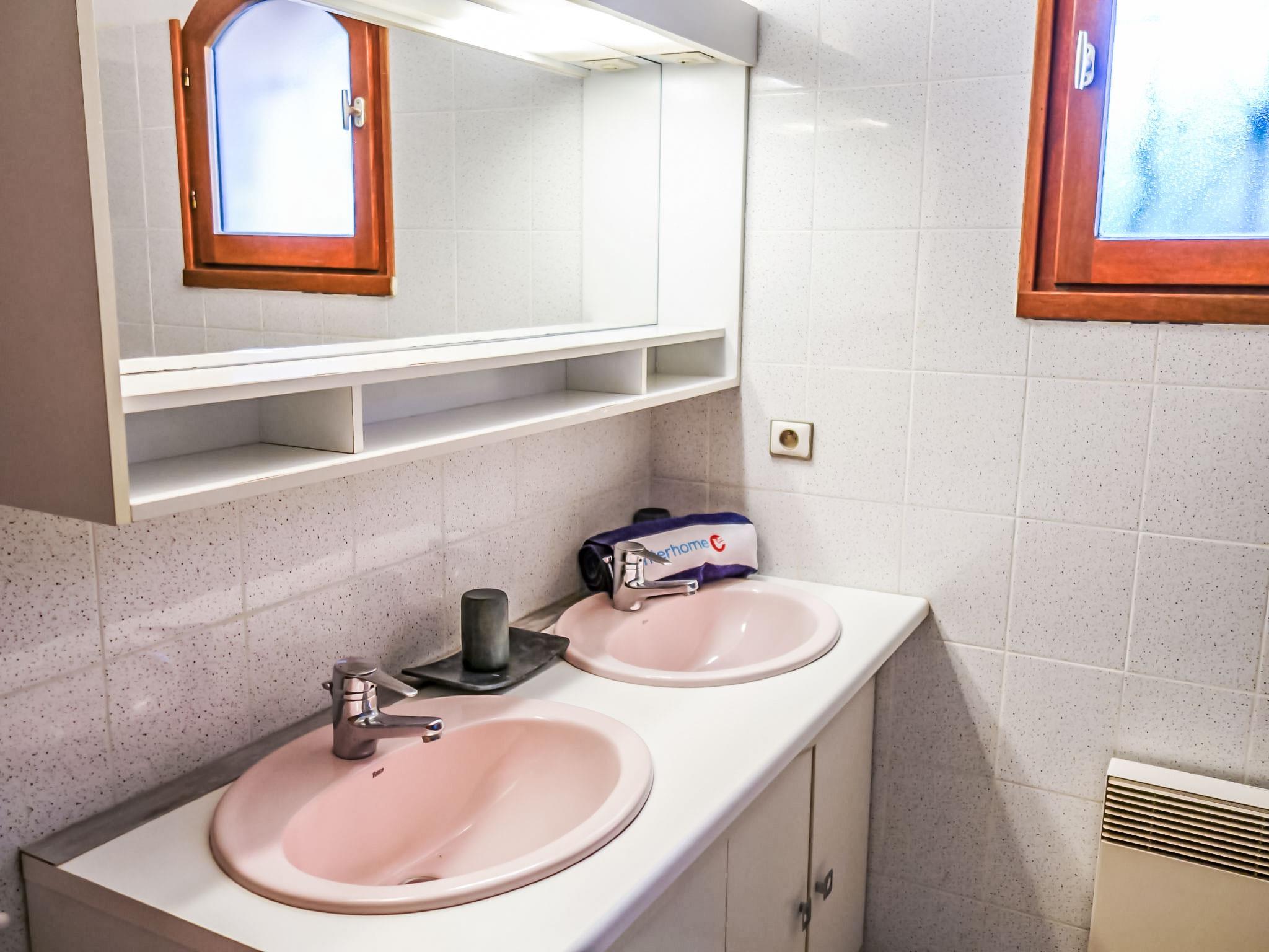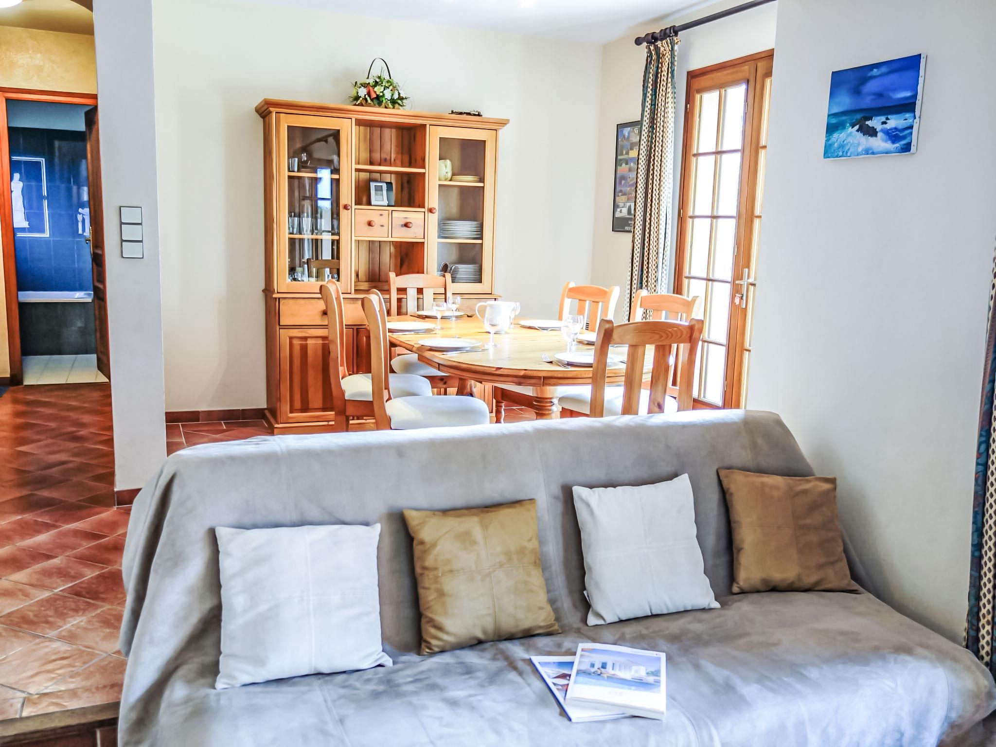 4-room terraced house 110 m2 on 2 levels, south facing position. Practical and beautiful furnishings: living/dining room with TV (flat screen). Exit to the terrace, to the swimming pool. 1 room with 1 french bed (160 cm, length 200 cm). Kitchen (4 hot plates, oven, dishwasher, toaster, kettle, microwave, freezer, electric coffee machine, Capsules for coffee machine (nespresso) extra). Bathroom, sep. WC. Upper floor: 1 room with 1 french bed (140 cm, length 190 cm). 1 room with 2 x 2 bunk beds (80 cm, length 190 cm). Shower/WC. Electric heating. Terrace 20 m2, roofed, south facing position. Terrace furniture, deck chairs (4). Facilities: washing machine, dryer, iron. Internet (WiFi, extra). Parking (fenced). Please note: maximum 1 pet/ dog allowed. Smoke alarm. The barbecue is in the rear courtyard of the house, by the kitchen. Sea view from the 1st floor of the villa.