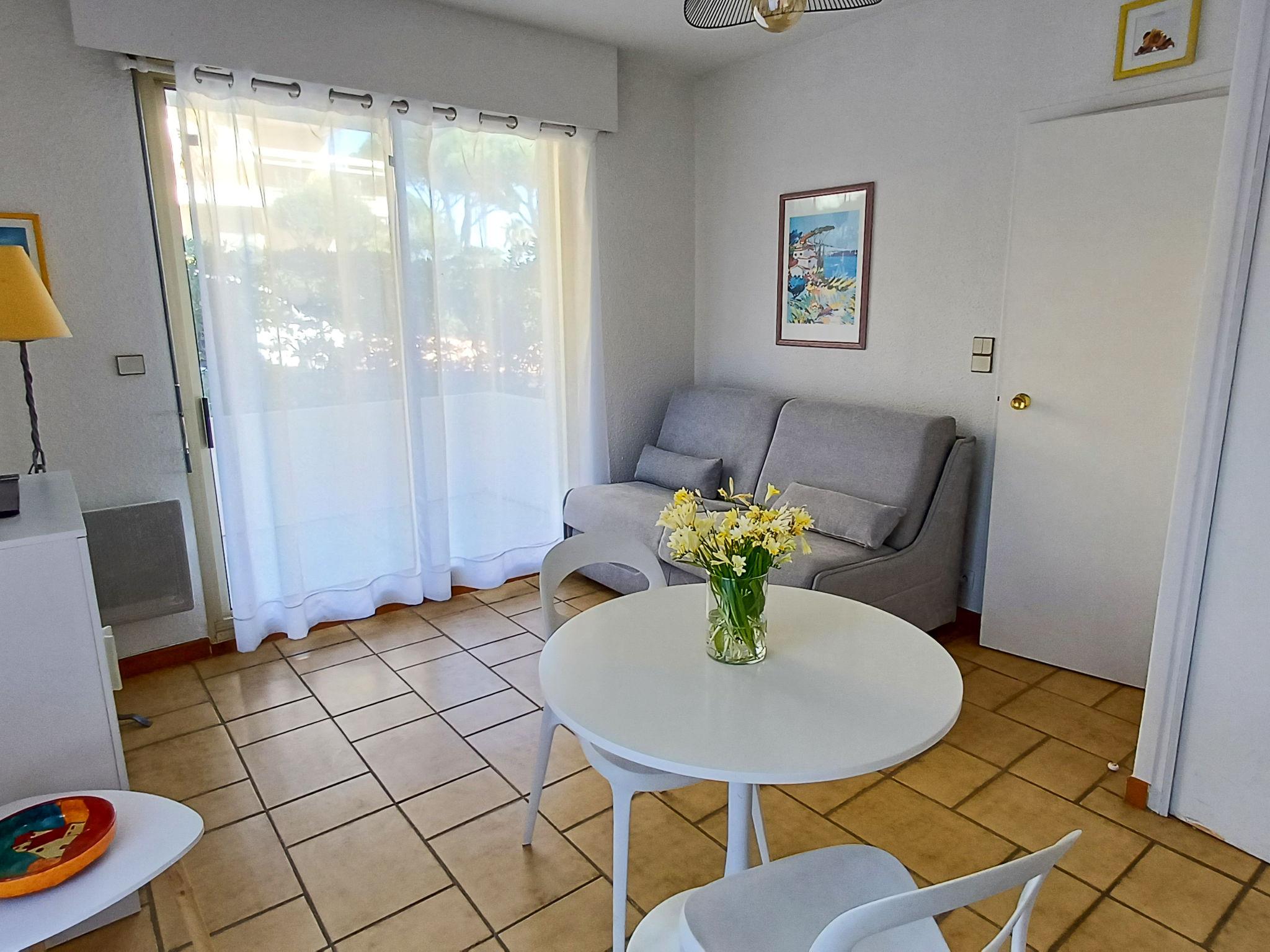 1-room studio 20 m2, on the ground floor, west facing position. Partly renovated in 2024, beautiful furnishings: living/dining room with 1 double sofabed (140 cm, length 190 cm), TV (flat screen), fan. Exit to the terrace. Open kitchen (oven, 2 induction hot plates, kettle, electric coffee machine, combination microwave). Shower/WC. Electric heating. Large terrace 30 m2. Terrace furniture, electric barbecue. Partial view of the sea. Facilities: washing machine, iron. Internet (WiFi, extra). Parking space n 38.