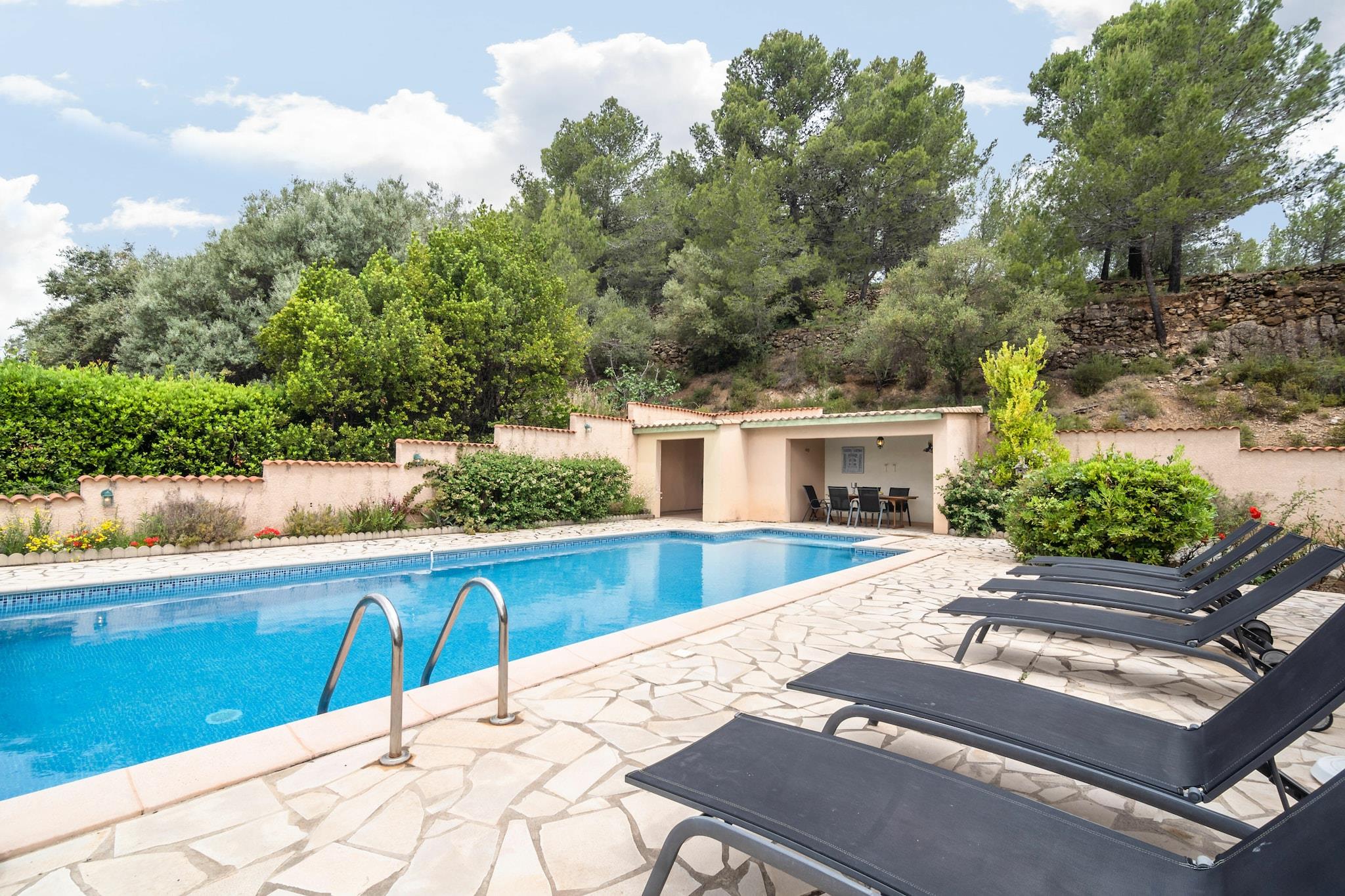 Beliggende på en bakketop i den charmerende vinlandsby Cébazan tilbyder Villa Impériale total privatliv og en betagende udsigt over vinmarker og et nærliggende naturreservat. Omgivet af 13.500 m² frodige haver fyldt med roser, oliventræer og palmer, har denne villa med tre soveværelser komfortabel plads til seks personer. Indenfor finder du airconditionerede rum, et fuldt udstyret køkken, en hyggelig opholdsstue med pejs og et badeværelse med både badekar og bruser. Kun 650 m væk er landsbyens bageri perfekt til friske morgenbaguetter, mens den livlige købstad Saint-Chinian ligger få minutter væk for shopping, vinsmagninger og spisning. Der er en charmerende restaurant med en hyggelig udendørs terrasse beliggende 10 minutters gang fra huset, hvor der serveres hjemmelavede retter, herunder dem, der tilberedes på trækulsgrillen. Tilbring solrige dage med at slappe af ved den 10×5 m private pool med trappe, eller slap af under den skyggefulde terrasse. Udendørskøkkenet - med grill og køleskab - gør udendørs måltider til en fornøjelse. Når aftenen falder på, kan du nippe til lokal vin under en stjerneklar himmel. Fra din dør fører markerede vandrestier gennem vinmarker og skove, ideelt for naturelskere. For de eventyrlystne kan du nyde mountainbiking, kanosejlads, golf eller en naturskøn bådtur langs Canal du Midi. Kæledyr er varmt velkomne her, med endeløse stier til lange gåture lige fra villaen. Nærliggende Saint-Chinian byder på kæledyrsvenlige udendørscaféer og markeder, hvor din firbenede ven kan deltage i fornøjelsen. Middelhavskysten, kun 30 minutter væk, byder på strækninger af sandstrande, der er perfekte til gåture langs havet med din hund, plus fiskerestauranter, hvor kæledyr kan slappe af ved din side.