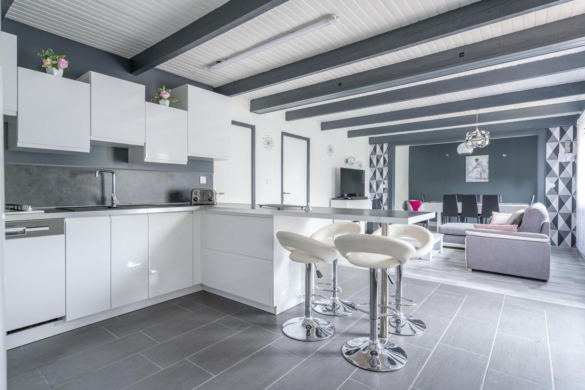 Stueetage: (åbent køkken(kogeplade(Komfur med fire kogeplader, gas), brødrister, kaffemaskine(kaffepude), kaffemaskine, mikrobølgeovn, opvaskemaskine , køle-fryseskab), stue / spisestue(Fjernsyn, spisebord(8 personer), sofahjørne, DVD-afspiller), soveværelse(dobbeltseng(140 x 200 cm)), badeværelse(badekar, håndvask), badeværelse(bruser, håndvask, toilet), toilet(toilet), bryggers(vaskemaskine)) På 1. etage: (soveværelse(dobbeltseng(140 x 190 cm)), soveværelse(enkeltseng(90 x 190 cm), enkeltseng(90 x 190 cm)), toilet(håndvask, toilet)) spisebord(8 personer), terrasse, have, solstole, grill(gas), Pladegrill
