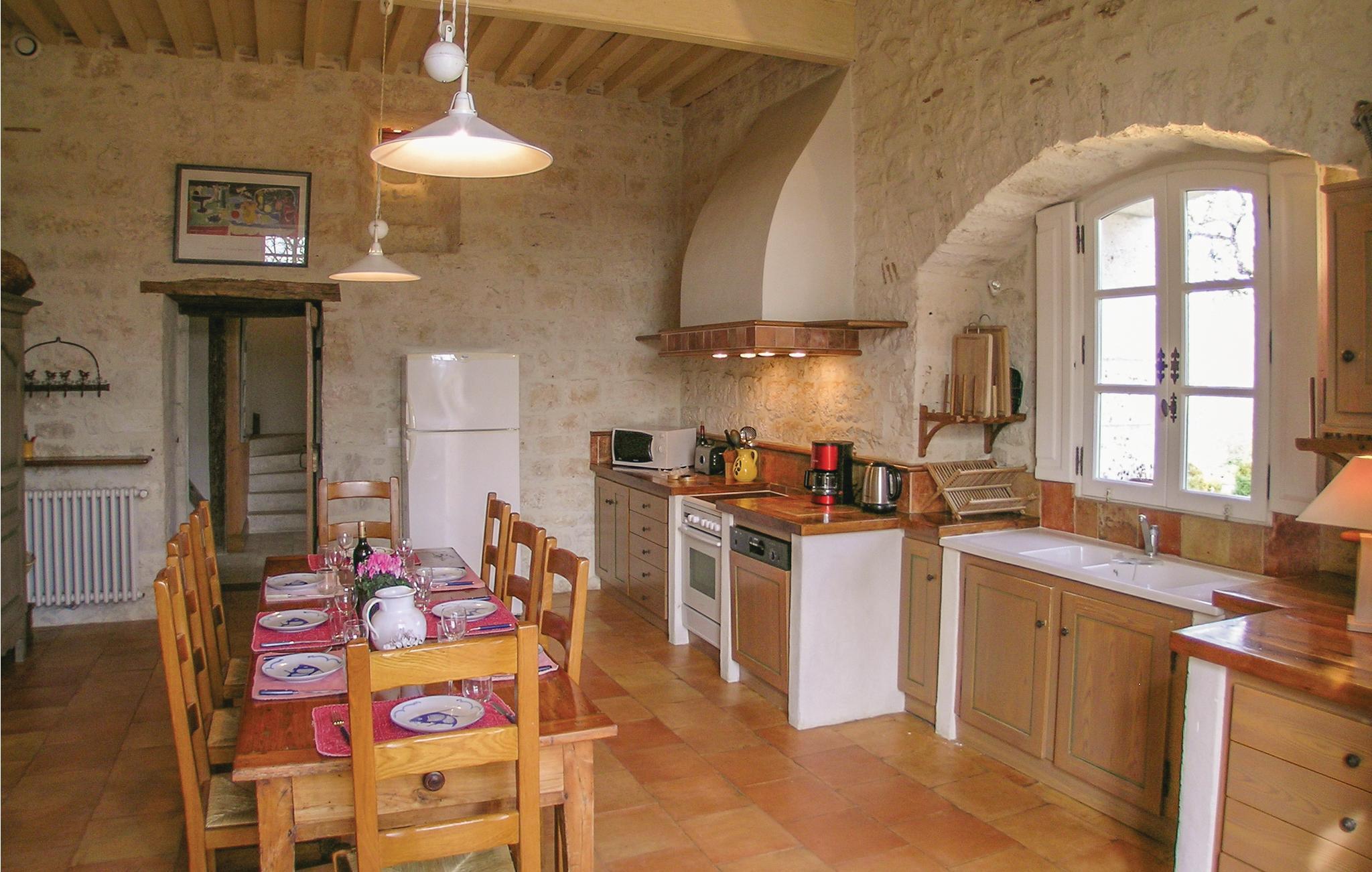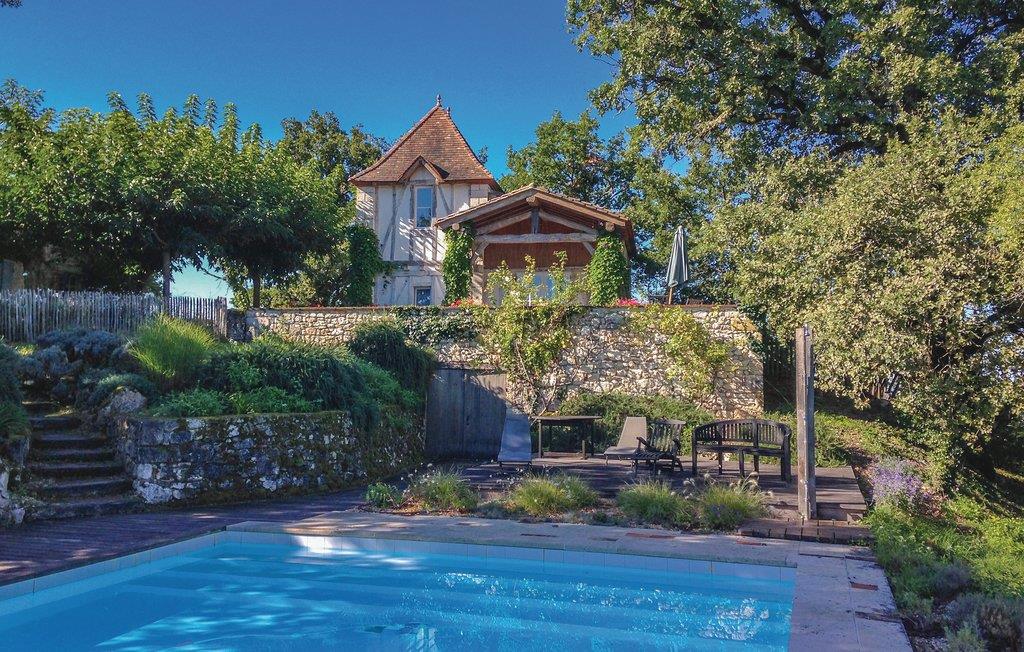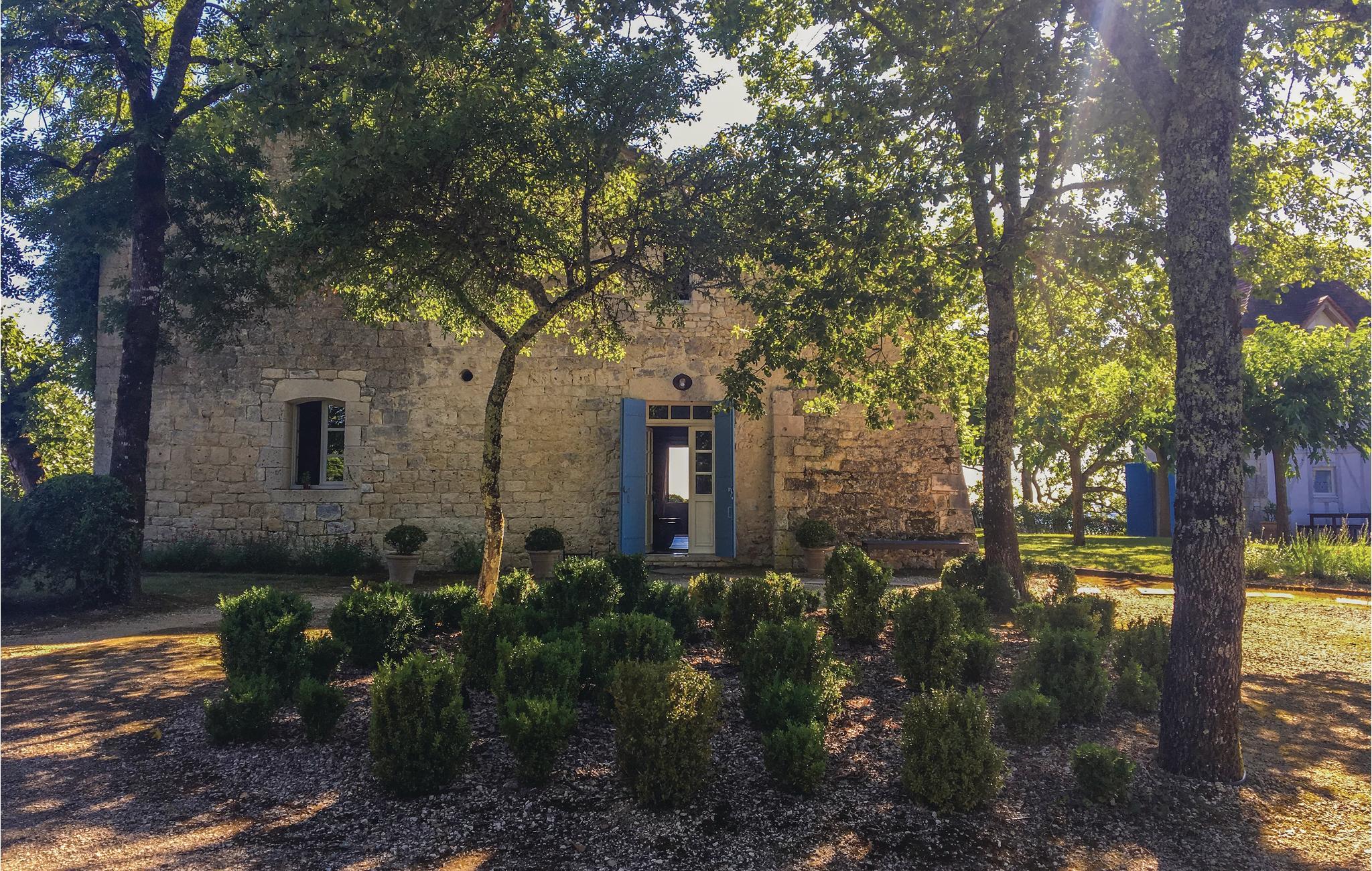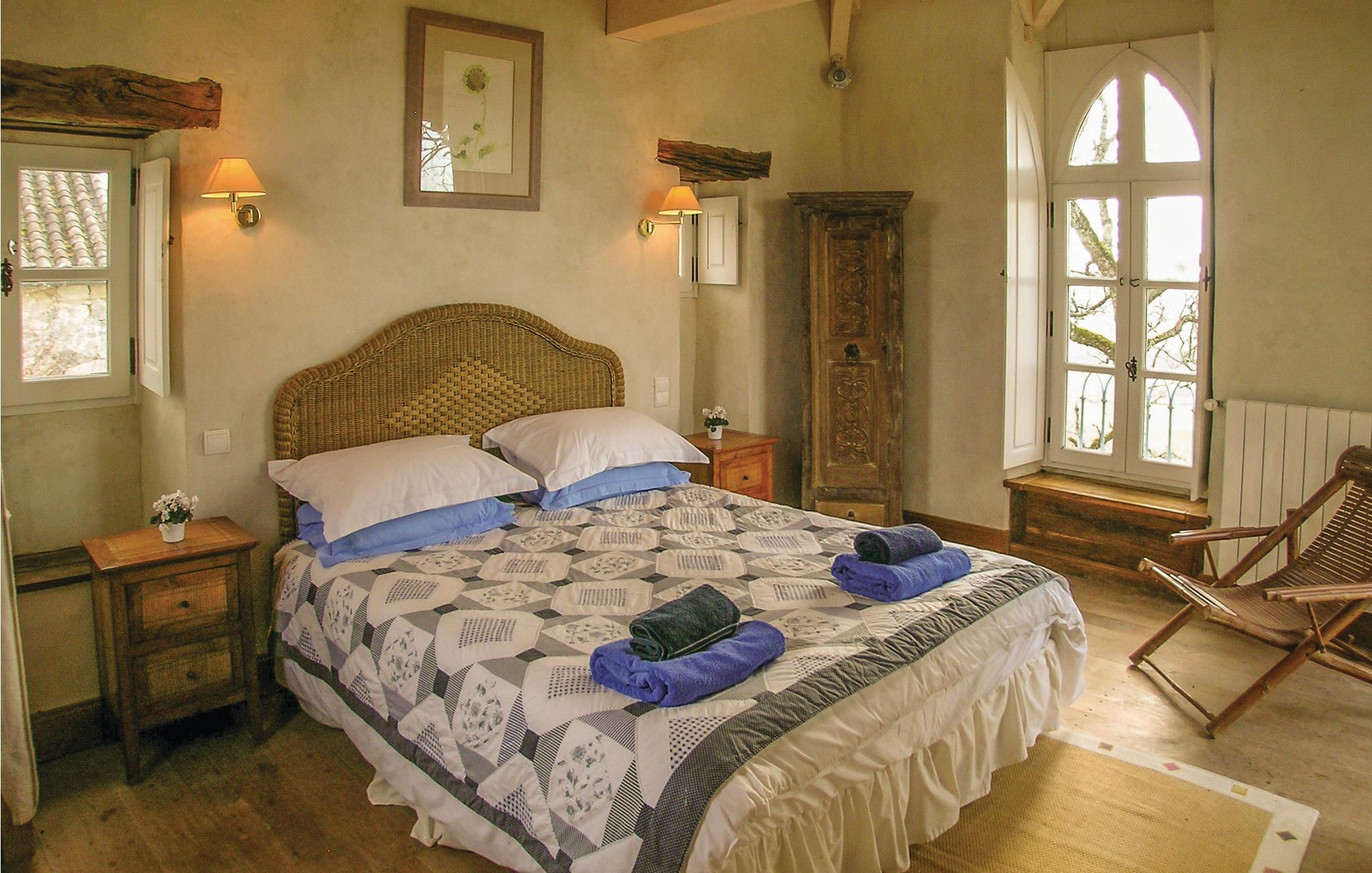 3 km fra den lille by Beauville og ikke langt fra Agen ligger dette vidunderlige feriehus med privat pool. Herfra kan I udforske Lot-et-Garonne. Huset er bygget af sten fra den 13. århundrede og ligger på en 17 ha stor grund med privat skov. Her er tre master bedrooms med udsigt over dalen, flere terrasser, hvor I kan nyde jeres mad i det fri, samt en opvarmet saltvandspool. Det femte soveværelse ligger i et anneks. Vær opmærksom, at grunden er meget stejl. Der er udendørs bruser ved siden af kælderen, hvor I kan spille bordtennis. Køkkenet er udstyret med alt, hvad I har brug for, og her kan I også sidde og spise. Der er ligeledes en stue med kamin og stenvægge. Fra de øverste værelser har I adgang til terrasse. I stueetagen er der et kontor, et bryggers og et badeværelse. På første etage er der fire soveværelser. Fra de to soveværelser med badeværelse på øverste etage har I udsigt over trækronerne og byen Beauville. Her er ligeledes et soveværelse med to enkeltsenge, mens det sidste soveværelse har en dobbeltseng. I annekset ligger et soveværelse med badeværelse og separat WC. I udhuset finder I en stue og et soveværelse med dobbeltseng, som er tilgængeligt med en trappe.