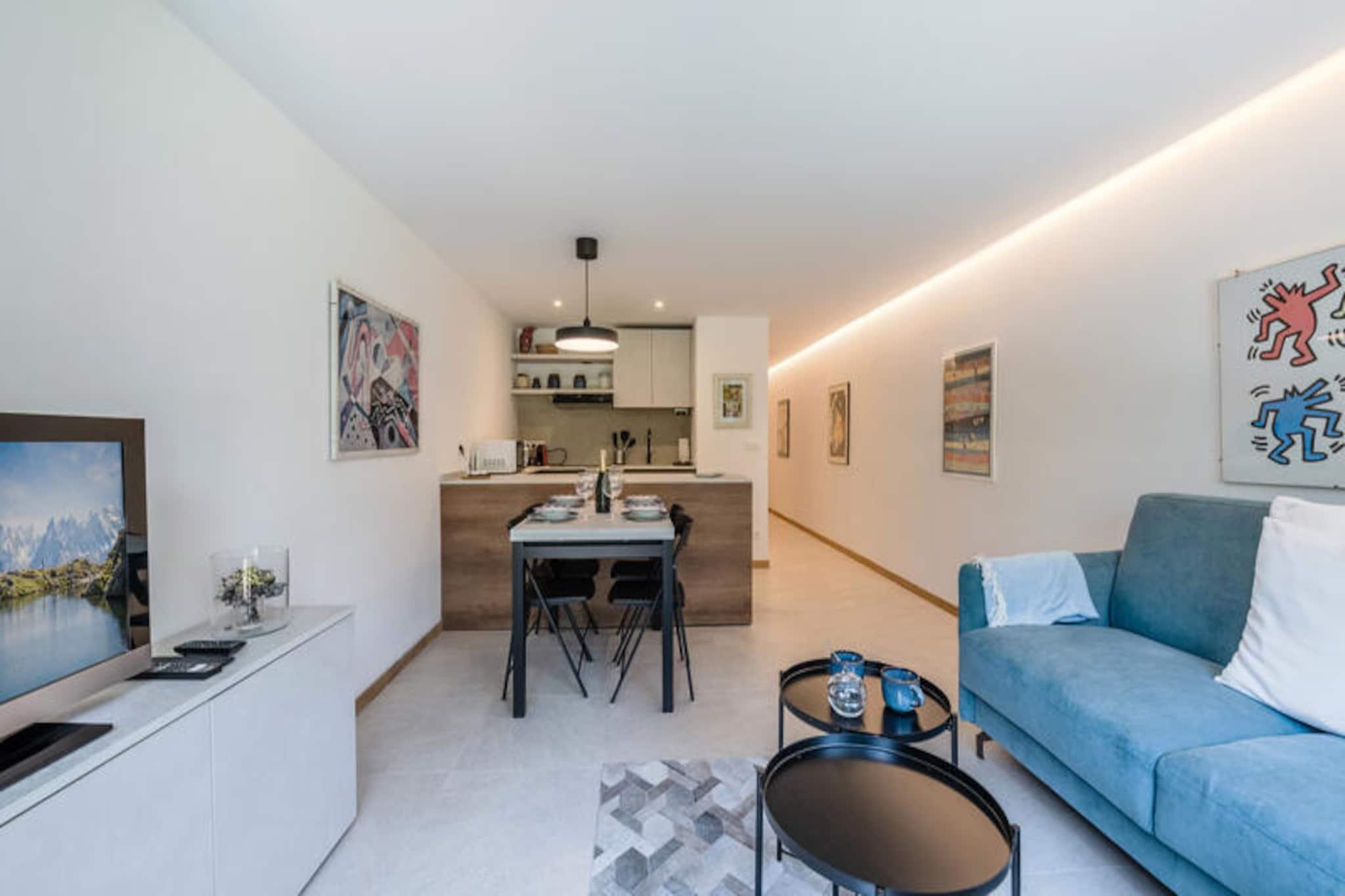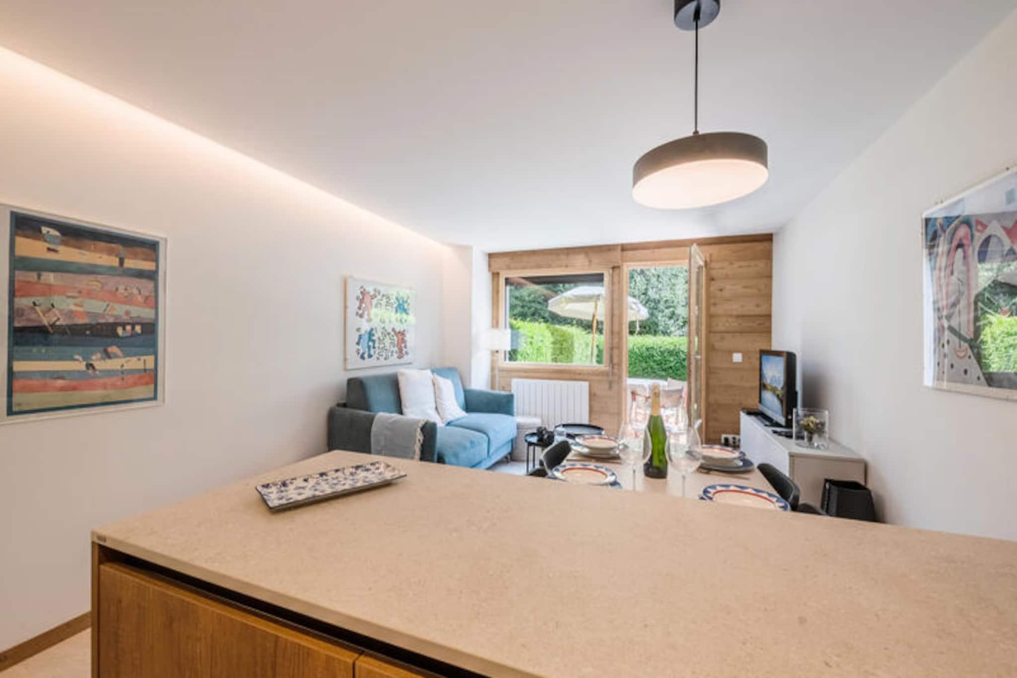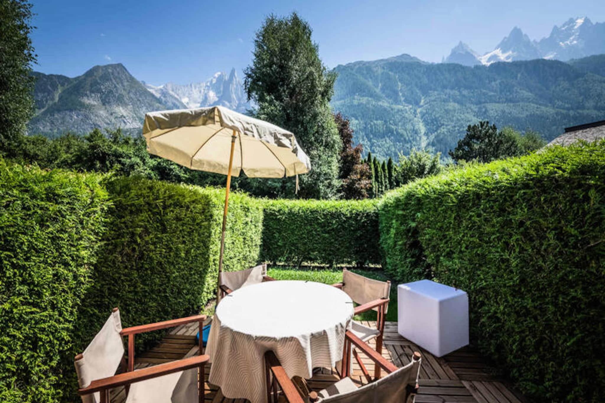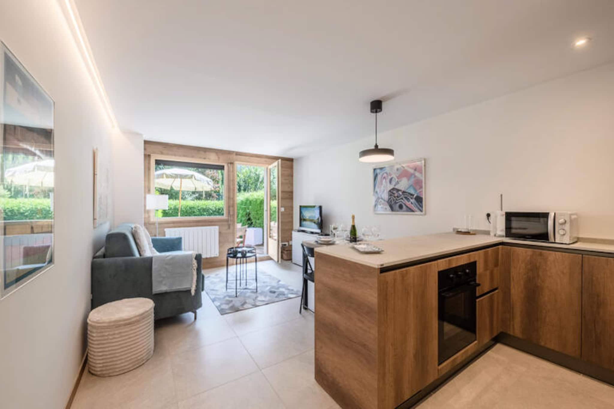 I hjertet af den majestætiske Chamonix-dal tilbyder denne charmerende lejlighed i stueetagen i Les Praz et roligt tilflugtssted for par eller små familier. Med sin private have og terrasse vågner du op til en betagende udsigt over Les Drus og Aiguille Verte, en perfekt kulisse for din alpine flugt. Uanset om du nipper til din morgenkaffe eller nyder en aften under stjernerne, vil den rolige atmosfære på denne beliggenhed fortrylle dig. \n\nLejligheden er 38 m² stor og er omhyggeligt designet til at tilbyde både komfort og funktionalitet. Det hyggelige soveværelse med dobbeltseng sikrer afslappende nætter, mens den lyse stue med sovesofa og fladskærms-tv indbyder til afslapning efter en dag med eventyr. Det fuldt udstyrede køkken med moderne apparater som induktionskogeplade, ovn og Nespresso-maskine gør det nemt at tilberede måltider til servering indendørs eller på terrassen. Yderligere bekvemmeligheder såsom vaskemaskine, håndklædetørrer og Wi-Fi forbedrer dit ophold og sikrer en problemfri oplevelse.\n\nEjendommen ligger kun 170 meter fra bus- og togstoppesteder og tilbyder fremragende forbindelser til Chamonix' berømte attraktioner. Udforsk skiløjper i verdensklasse, vandrestier og det pulserende bycentrum, alt sammen inden for rækkevidde. Efter en dag med udforskning kan du opbevare dit udstyr i det private skiopbevaringsrum og slappe af i dit komfortable alpine paradis.\n\nMed sin blanding af moderne bekvemmeligheder, betagende landskaber og førsteklasses beliggenhed er denne lejlighed et ideelt valg for dem, der søger en mindeværdig ferie i de franske alper. Lad Chamonix' skønhed inspirere dit næste eventyr.