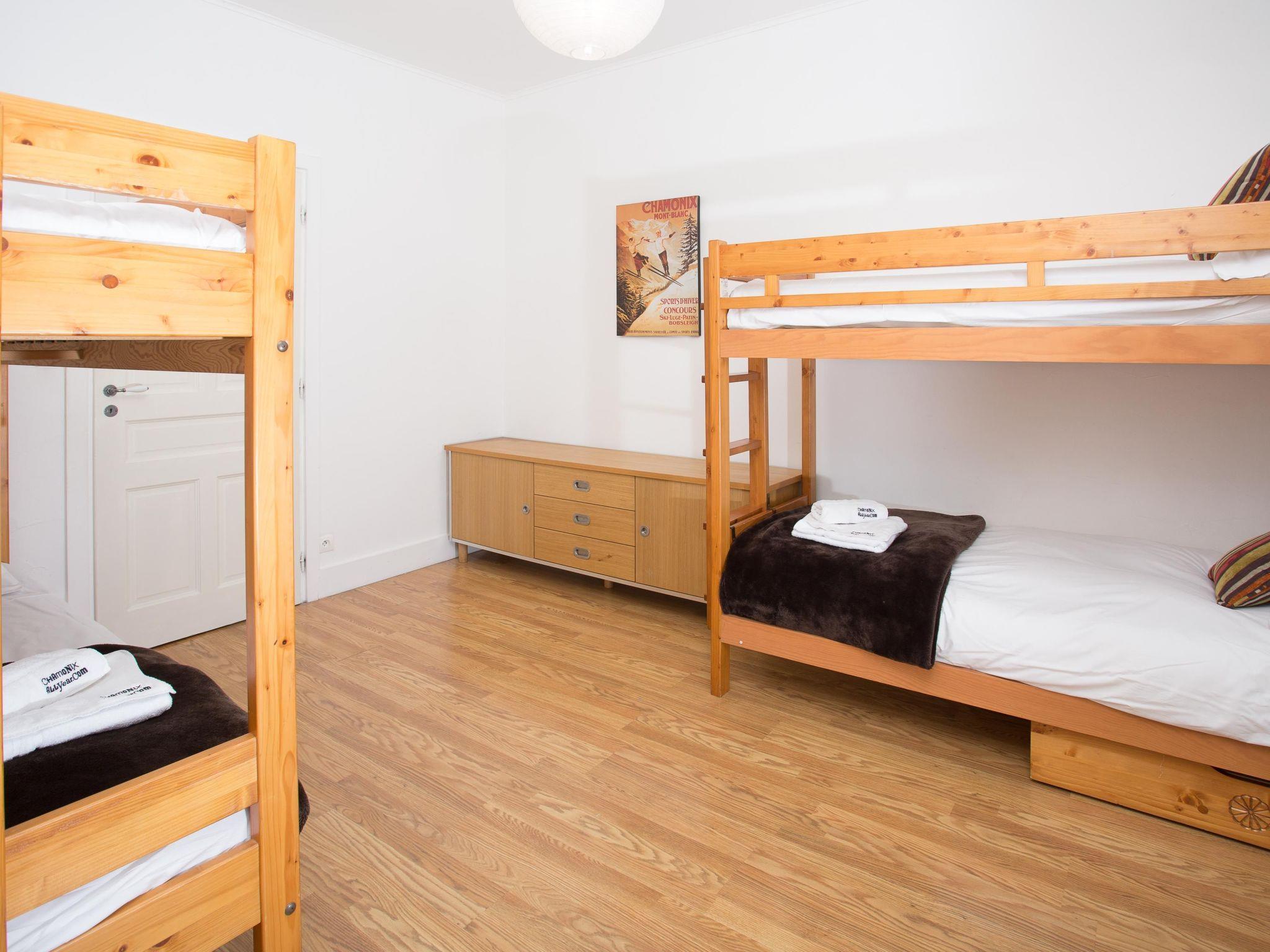 Located on the first floor of this historic Chamonix residence, right in the centre of the town, Mont Blanc apartment is a 70 sqm classic two bedroom Chamonix apartment with two bathrooms, an open plan living room with modern kitchen, dining area and lounge, as well as communal parking for one car, ski locker and bike storage too. Nicely furnished and decorated, Mont Blanc apartment has two bedrooms: the main bedroom has a double bed and an ensuite family bathroom with bath/ shower and WC, and the second bedroom has two adult size bunkbeds sleeping 4. The second bathroom has a shower and WC. This Chamonix apartment boasts classical high ceilings and is light spacious, with a large open plan living area. The Residence Mont Blanc is one of Chamonix's oldest historical buildings and is home to the Chamonix Alpine Museum too, right in the centre of Chamonix's pedestrian high street.