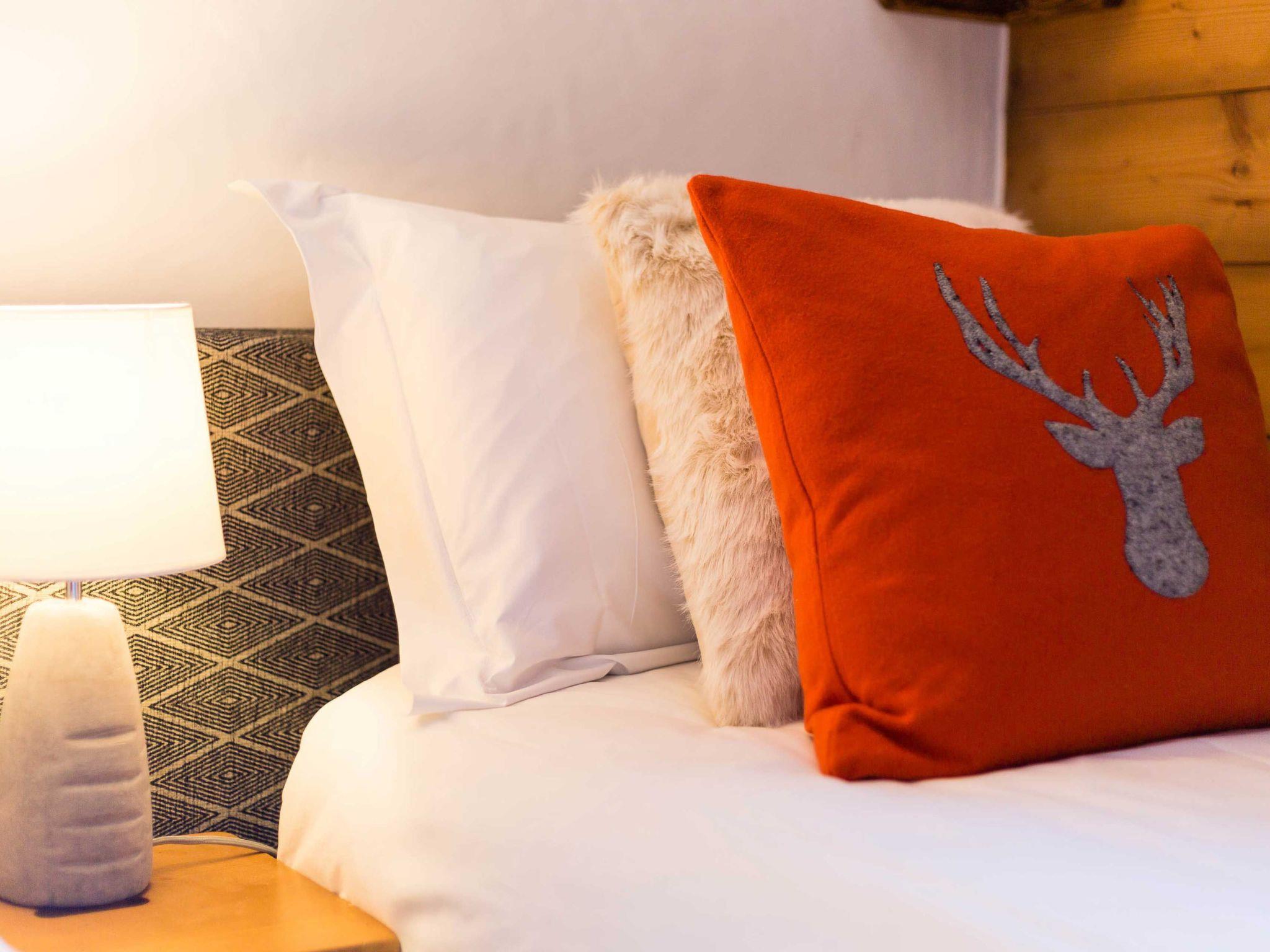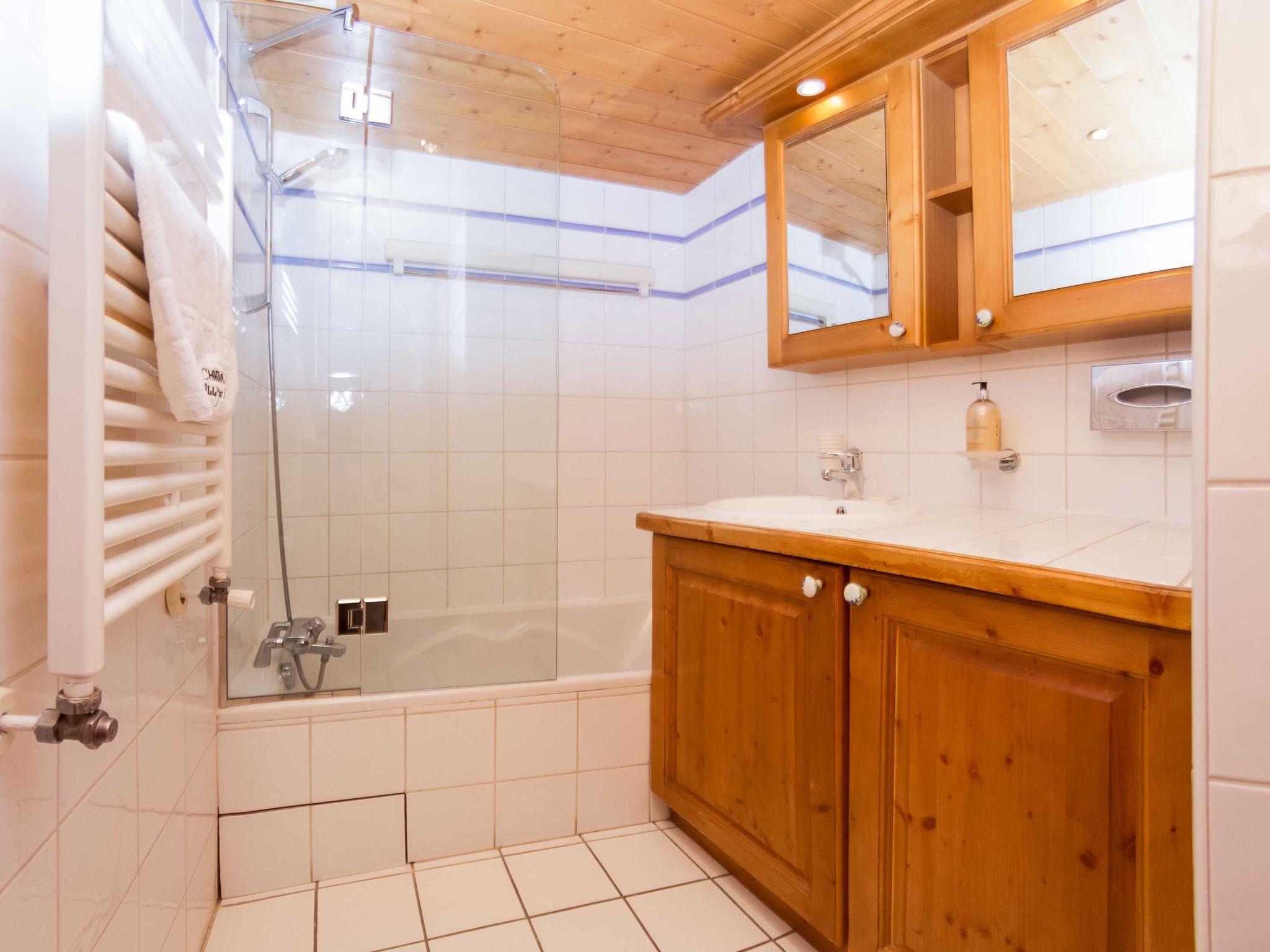 Ginabelle 14 apartment is a central, 2 bedroom apartment which benefits from luxury holiday rentals amenities of swimming pool, sauna, hammam and gym access within the residence. The apartment has one master super-king bedroom with ensuite bathroom, as well as a second bedroom which can be made as a twin room or super-king. In addition there is a family bathroom with bath and overhead shower, as well as a second separate WC. In the living area are a comfy sofa, TV and games, as well as doors which open out onto a spacious balcony with sweeping views of Les Planards ski area and up the valley towards Le Tour. The adjoining dining area in Ginabelle 14 apartment has seating for 6 with three dining chairs and a bench along one side, while the kitchenette is equipped with more luxury holiday rental essentials, including dishwasher and Nespresso coffee machine. The apartment also benefits from underground parking, private ski locker and wifi internet access.
