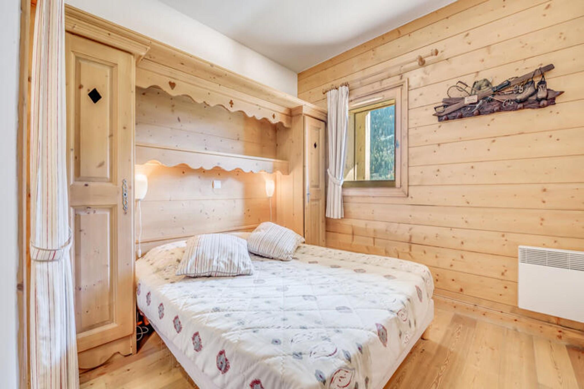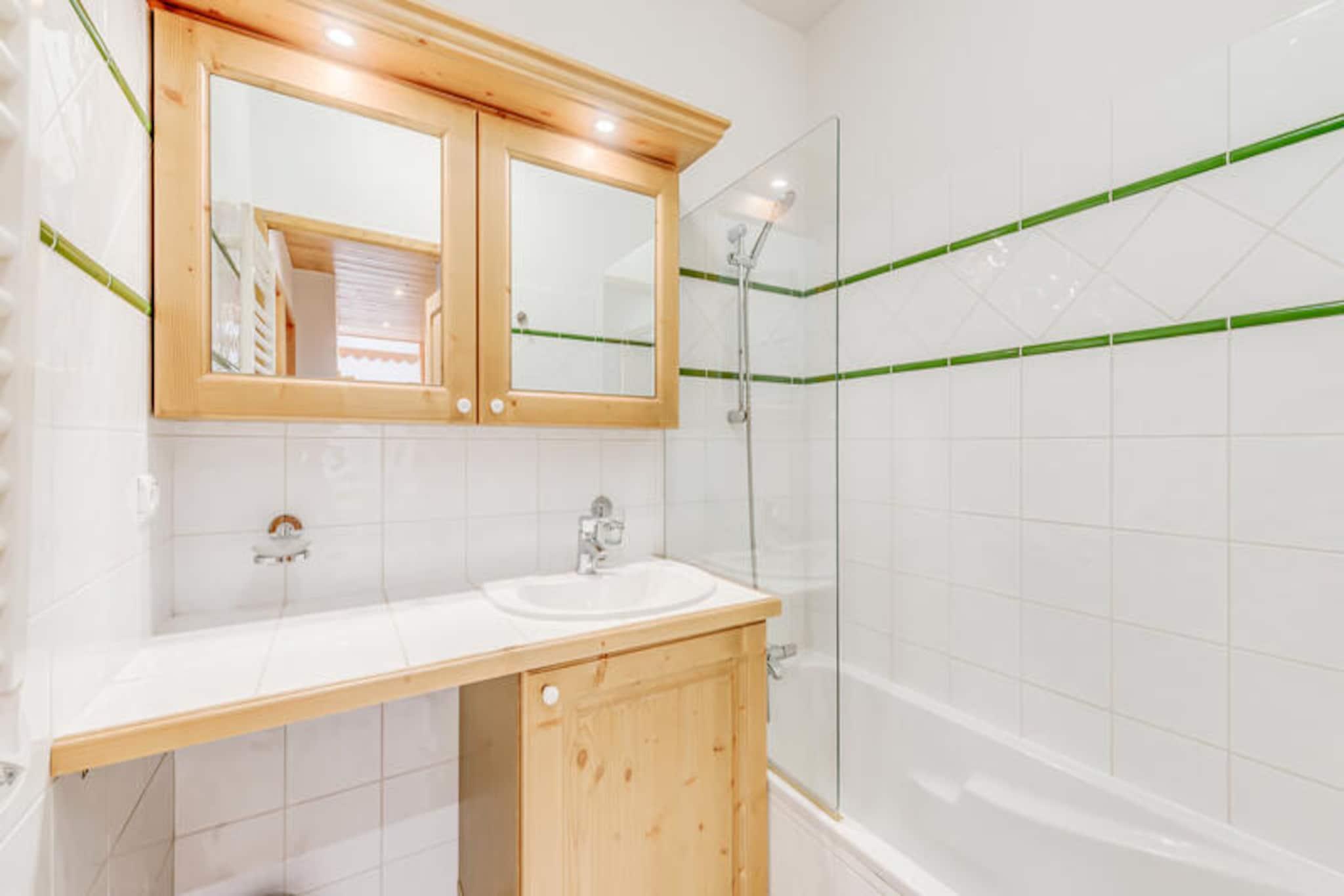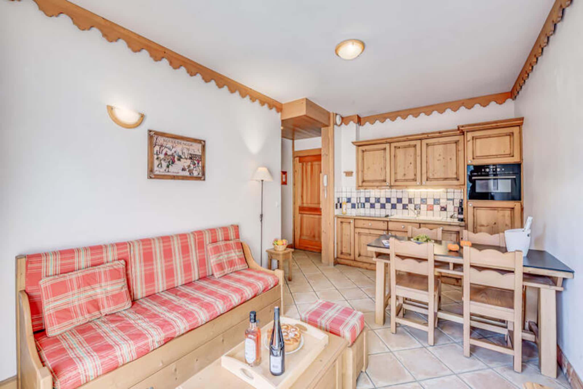 Denne komfortable lejlighed på 49 m² kan rumme op til seks gæster. Det har to soveværelser: et med to enkeltsenge og en master suite med en dobbeltseng og bruser. I stuen er der en udtrækssovesofa til to. En sydvendt altan byder på naturskøn udsigt. Boligen tilbyder gratis adgang til en swimmingpool (med udvidet åbningstid to nætter om ugen), et fitnesscenter og et skiskab til hver lejlighed. Kæledyr er ikke tilladt, og rygning er forbudt i lejligheden. Beliggende ved indgangen til landsbyen tilbyder lejligheden en fantastisk udsigt over Vanoise-massivet og Courchevel-skråningerne. En gratis shuttle-service (i vintersæsonen, hvert 8. minut) giver nem adgang til hjertet af resortet, gondolen og ESF-skiskolen. Selvom kildeteksten ikke nævner specifikke nærliggende butikker, restauranter eller markeder, letter shuttle-servicen adgangen til resortets faciliteter. Lejligheden har et fuldt udstyret køkken med opvaskemaskine, ovn, mikroovn, kogeplader, køleskab, kaffemaskine, kedel, brødrister og komplet service. Der er et separat badeværelse og separate toiletter. Der er fjernsyn i opholdsstuen. Inkluderede tjenester er WiFi, sengelinned, håndklæder og slutrengøring (undtagen køkkenet). Babyudstyr (seng/stol) er tilgængeligt mod et ekstra gebyr ved reservation. Der kræves et depositum på EURO1500.