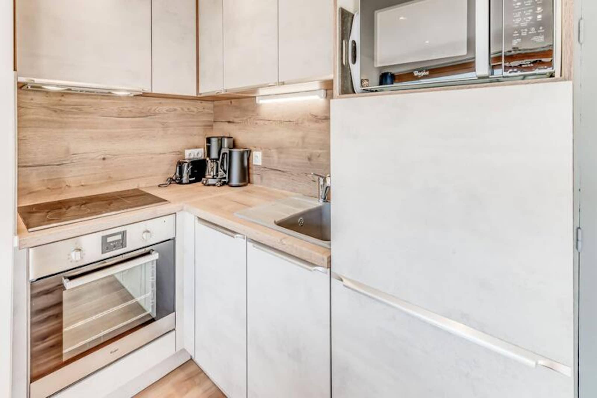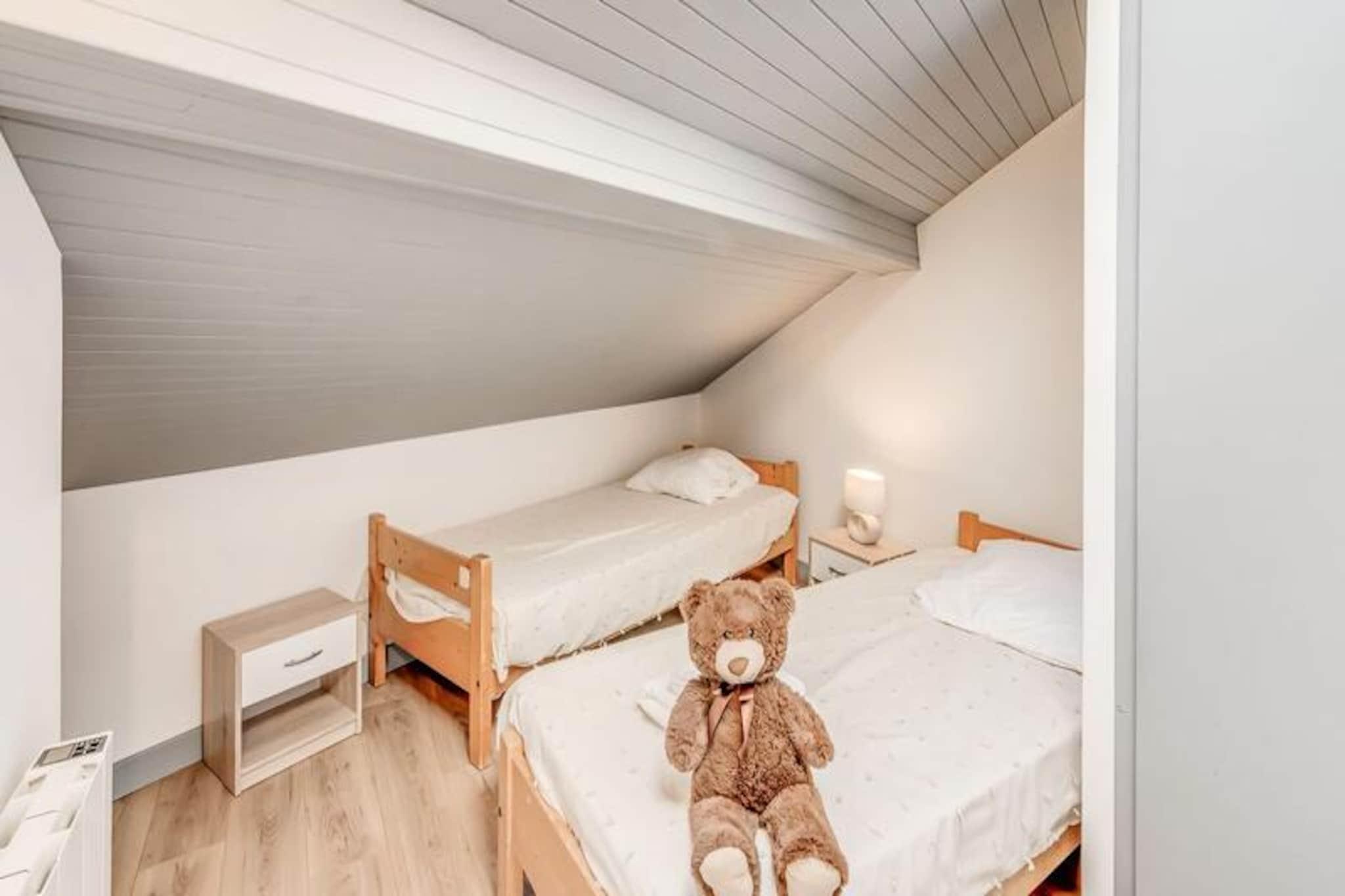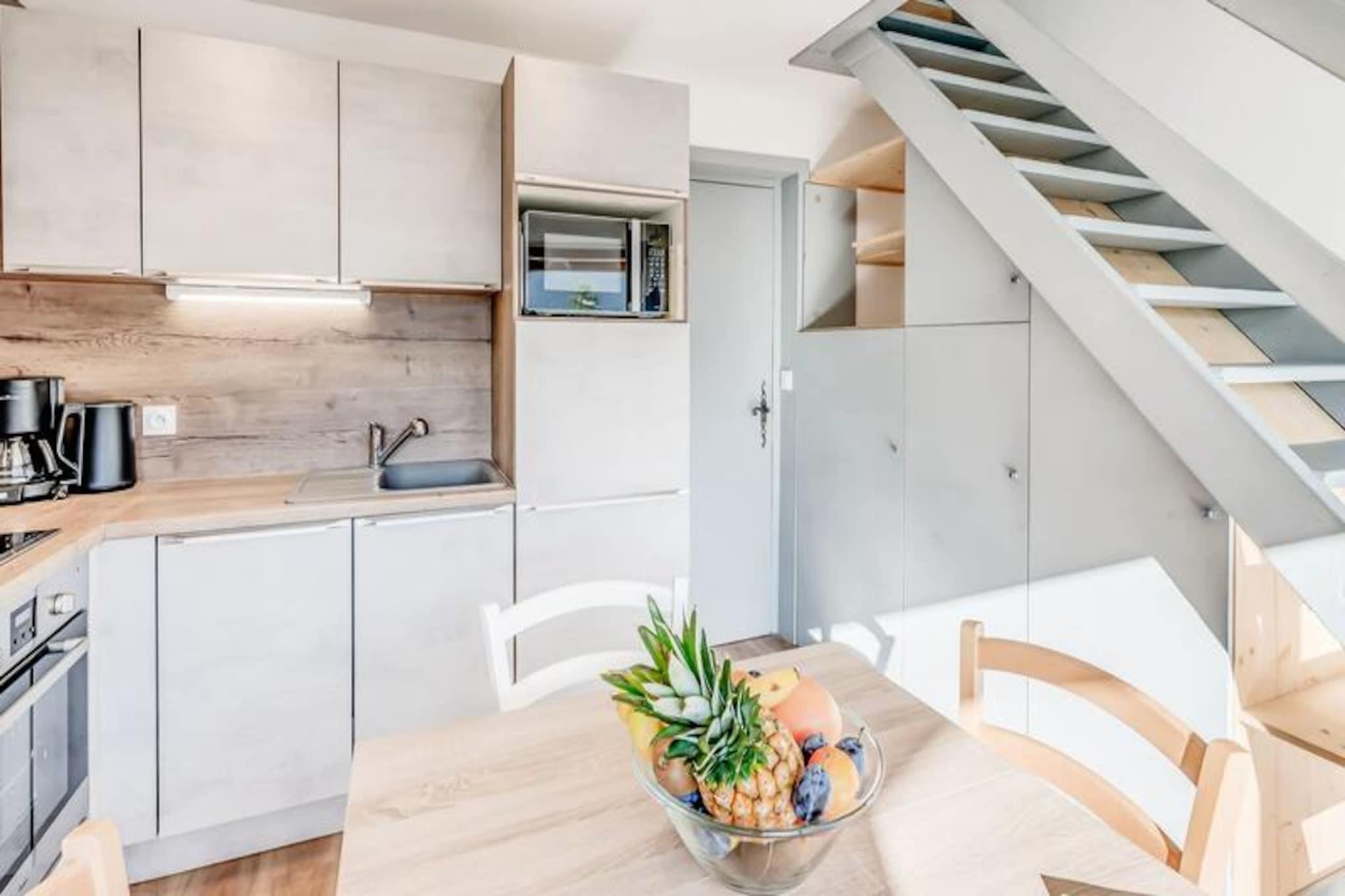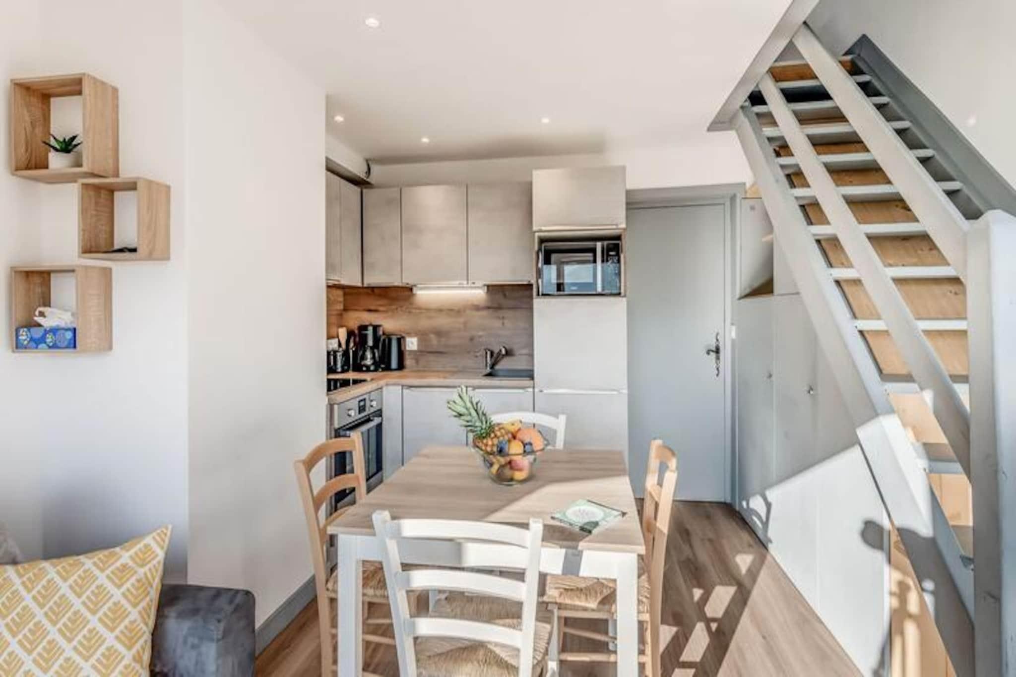 Denne charmerende duplex-lejlighed tilbyder et behageligt ophold for 4-6 gæster, med to soveværelser og en sovesofa i stuen. Det første soveværelse har en dobbeltseng, mens det andet soveværelse er udstyret med to enkeltsenge. Lejligheden er designet med moderne møbler, herunder tv og spiseplads. Nyd luksusen ved hoteltjenester såsom sengetøj, håndklæder og slutrengøring (undtagen køkkenet). Bemærk venligst, at kæledyr ikke er tilladt, og lejligheden er ikke-ryger. Der kræves et depositum, og yderligere tjenester såsom Wi-Fi og babyudstyr er tilgængelige mod et ekstra gebyr. Lejligheden er bekvemt beliggende i hjertet af landsbyen og tilbyder nem adgang til lokale attraktioner. Kun en kort gåtur fra den offentlige elevator finder du gondolen og ESF-skiskolen. Alle vigtige butikker, herunder caféer, restauranter og markeder, er i nærheden, så du kan udforske den pulserende landsbyatmosfære. Den sydvestvendte lejlighed har en uhindret udsigt over de omkringliggende bjerge, perfekt til dem, der nyder naturskønne landskaber. Lejlighedens veludstyrede køkken omfatter ovn, mikroovn, opvaskemaskine, stort køleskab, kaffemaskine, brødrister og kedel, hvilket sikrer, at du nemt kan tilberede måltider. Badeværelset har bruseniche, håndvask og toilet. Den rummelige, møblerede balkon giver dig mulighed for at slappe af og nyde den friske bjergluft, hvilket fuldender det hyggelige og funktionelle opholdsrum.