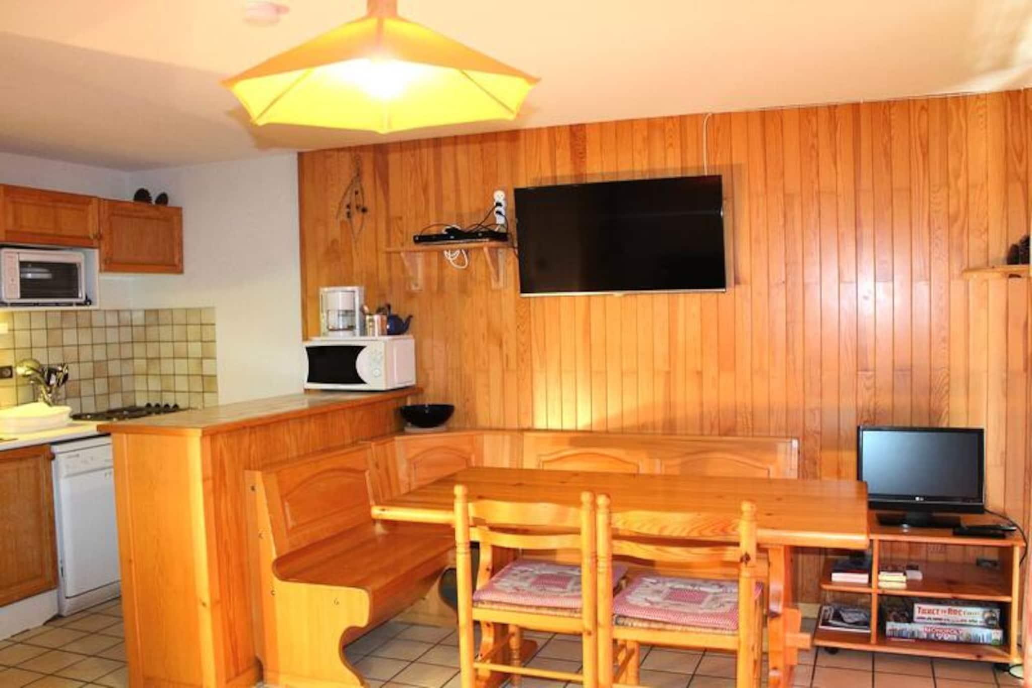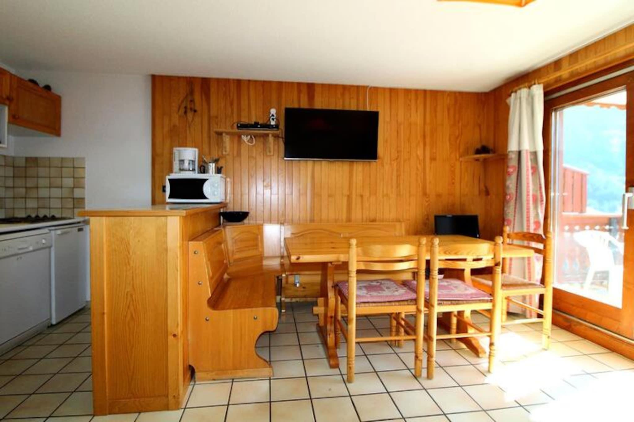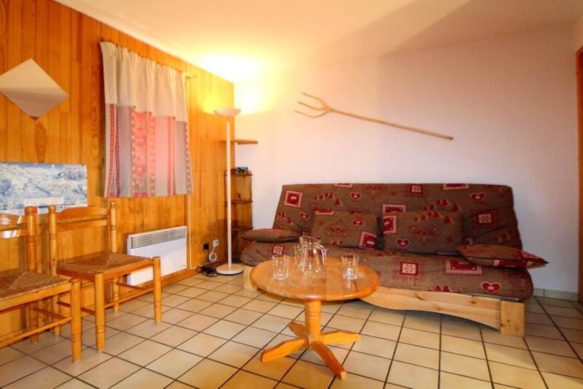 Beliggende i et fredeligt område med udsigt over landsbyen, kan denne smukke 35 m² store lejlighed i "Le Chardonnet" boligen komfortabelt rumme op til 6 personer. Lejligheden ligger på 2. sal og byder på en solrig sydvendt altan med en fantastisk, uhindret udsigt over landsbyen og de omkringliggende bjerge. Det omfatter et soveværelse med dobbeltseng, en lukket kahyt med køjesenge og en stue med en dobbelt sovesofa. For din bekvemmelighed er lejligheden udstyret med et badeværelse, separat toilet og et tekøkken med opvaskemaskine, ovn, mikroovn og andre vigtige apparater. Ejendommen er ideelt beliggende kun 200 meter fra landsbyens centrum, hvor du finder en række butikker, samt gondolen og ESF-skiskolens afgangssted. Denne førsteklasses beliggenhed sikrer nem adgang til skiløb og andre bjergaktiviteter. Det nærliggende landsbycenter byder også på charmerende caféer, restauranter og lokale markeder, så gæsterne kan opleve den autentiske alpine atmosfære og nyde lækre regionale retter. Inde i lejligheden finder du alle hjemmets bekvemmeligheder, herunder et fuldt udstyret tekøkken, en spiseplads og en stue med et fjernsyn. Yderligere tjenester såsom en Wi-Fi miniboks, babyseng og stol er tilgængelige efter anmodning, samt slutrengøring. Sengelinned og håndklæder er også tilgængelige mod et ekstra gebyr. Et skiskab er bekvemt placeret i stueetagen, hvilket giver nem opbevaring af dit skiudstyr. Denne ikke-ryger lejlighed er det perfekte valg til et afslappende og bekvemt ophold i bjergene.