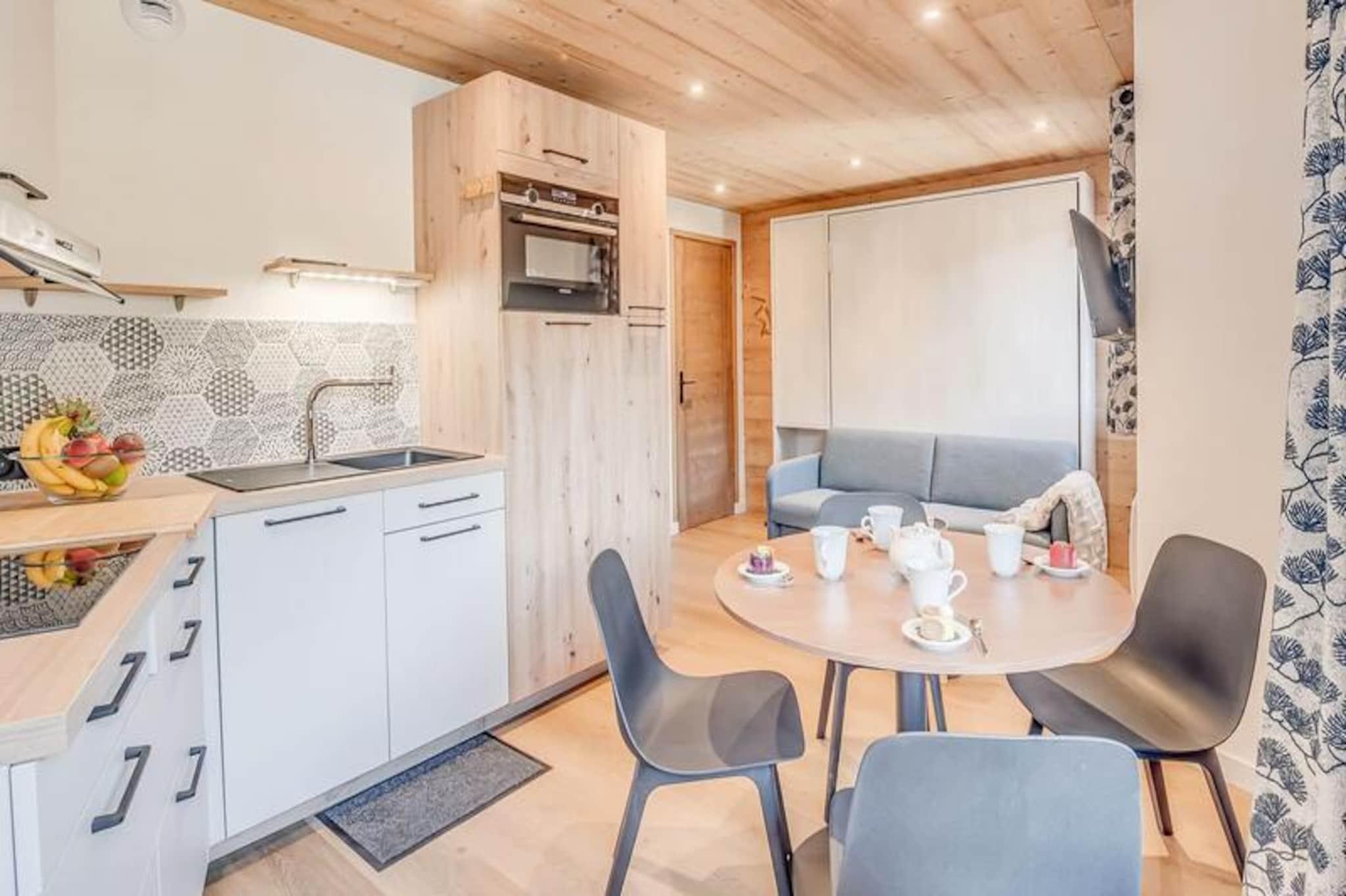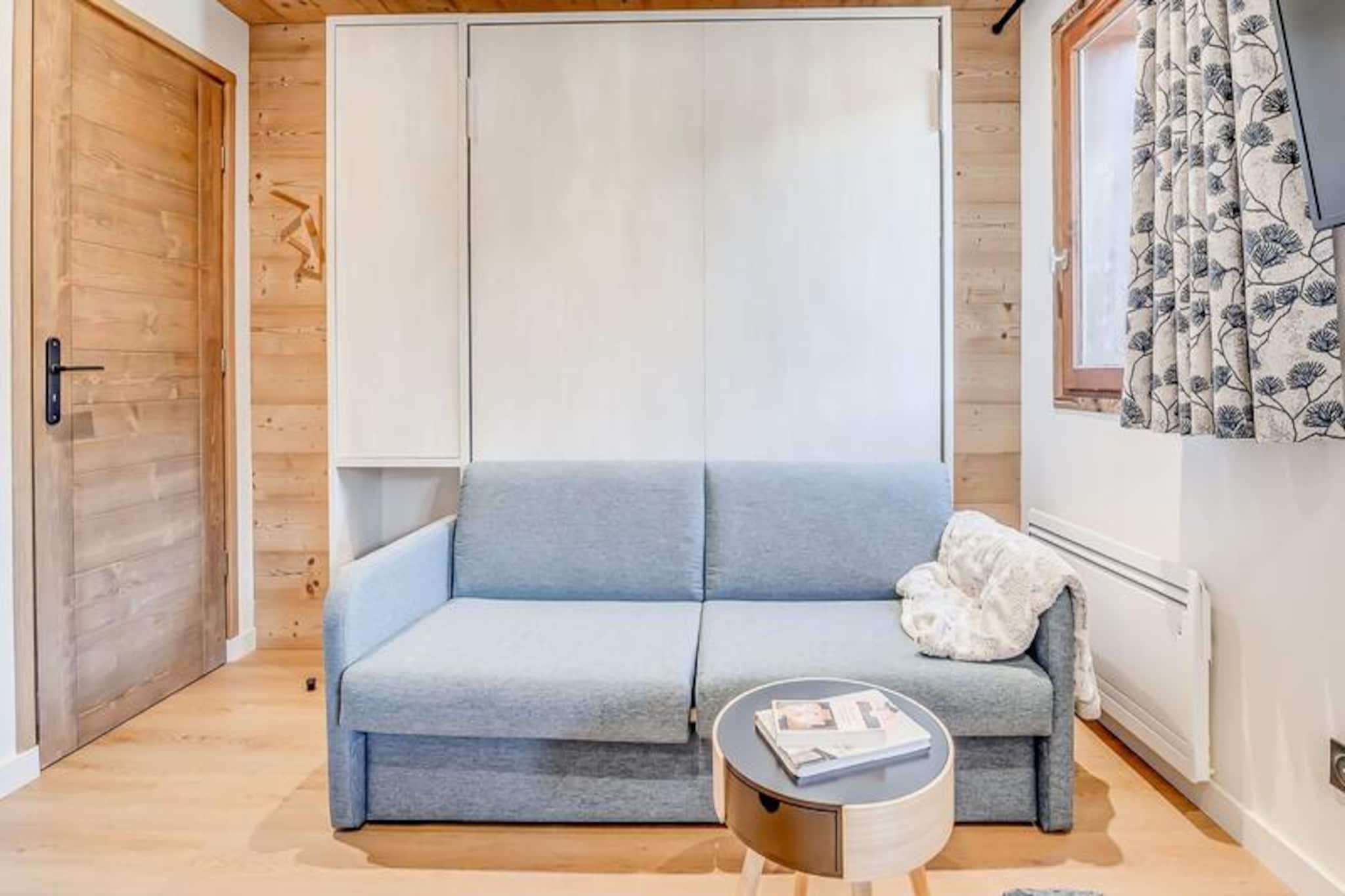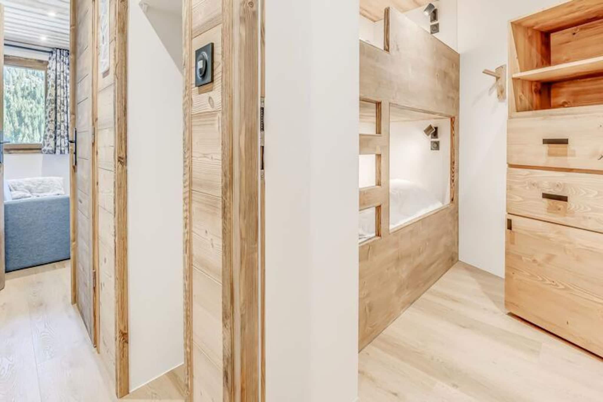 I hjertet af den charmerende landsby Champagny-en-Vanoise tilbyder denne smukt renoverede lejlighed en problemfri blanding af moderne komfort og alpin charme. Beliggende på fjerde sal i den seks-etagers Le Centre-residens, tilbyder den en betagende udsigt over landsbyens torv og de omkringliggende bjerge fra sin sydvendte balkon. Uanset om du er her for et vinterskieventyr eller en sommerferie i bjergene, inviterer denne ejendom dig til at fordybe dig i de franske alpers skønhed. \n\nLejligheden, der er en del af CHAMPAGNY PREMIUM-serien, er omhyggeligt designet til at rumme op til fire gæster. Dens hyggelige planløsning omfatter et nordvendt soveværelse med køjesenge, et stilfuldt badeværelse med bruseniche og et separat toilet for ekstra bekvemmelighed. Opholdsstuen har en udtræksseng, en sovesofa og et tv, hvilket skaber et indbydende rum at slappe af efter en dag med udforskning. Det åbne køkken er fuldt udstyret med moderne apparater, herunder opvaskemaskine, ovn og kaffemaskine, hvilket sikrer, at du har alt, hvad du behøver for at tilberede lækre måltider. Et nyt karnapvindue oversvømmer rummet med naturligt lys og åbner ud til balkonen, perfekt til at nyde din morgenkaffe eller aftenvin.\n\nLe Centre tilbyder exceptionelle faciliteter, herunder elevator, skibokse og direkte adgang til svævebanen og ESF-skiskolen. Butikker i stueetagen gør det nemt at fylde op med fornødenheder eller forkæle sig selv med lokale specialiteter. Om vinteren er pisterne kun få øjeblikke væk, mens sommeren giver muligheder for vandreture, cykling og udforskning af de fantastiske landskaber i Vanoise Nationalpark.\n\nMed hotelservices som sengelinned, håndklæder og slutrengøring inkluderet sikrer denne lejlighed et problemfrit ophold. Uanset om du søger eventyr eller ro, er denne ejendom din port til uforglemmelige alpine minder.
