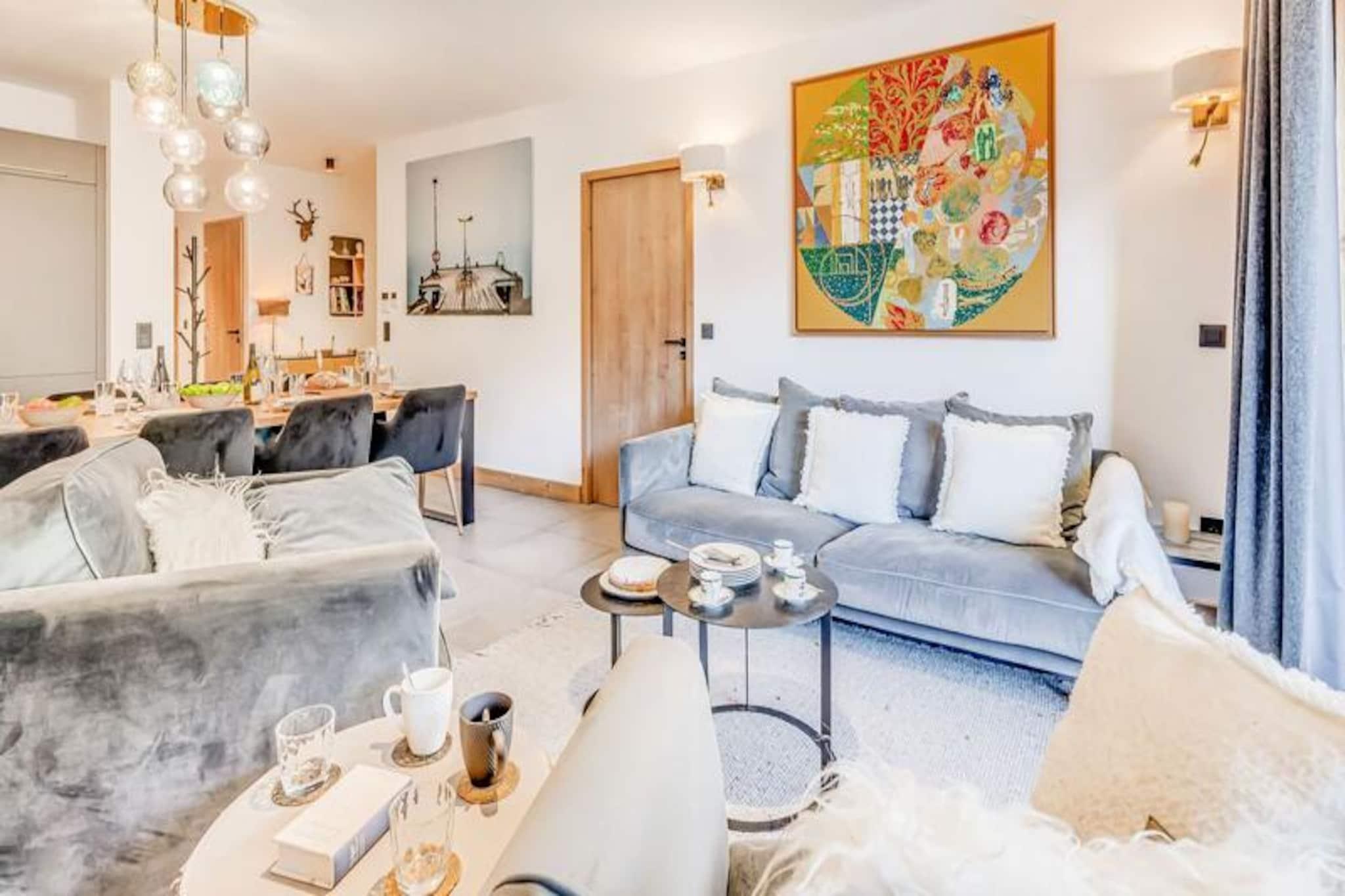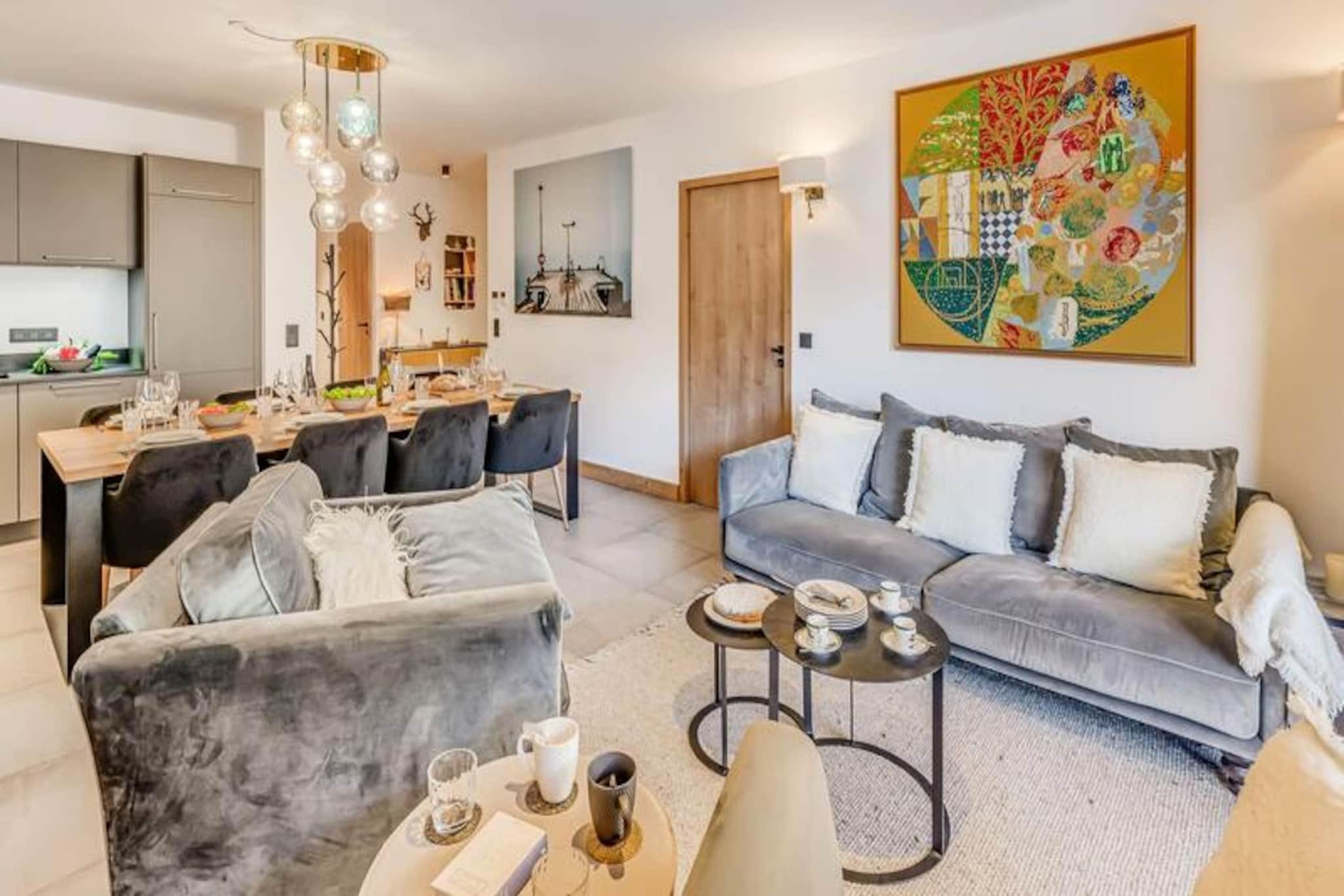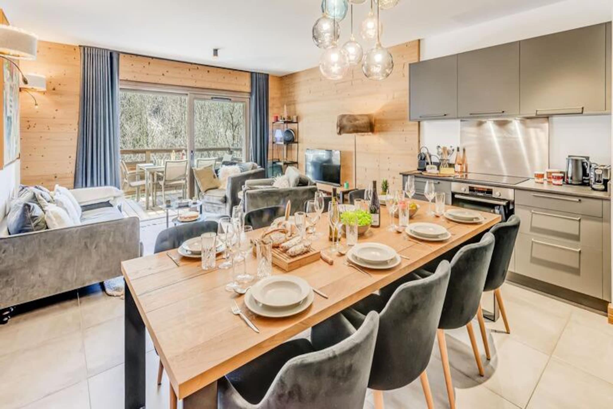Denne luksuriøse lejlighed i Terrasses de la Vanoise-residensen ligger i udkanten af ??den fredfyldte Vanoise-bjergkæde og tilbyder et uovertruffent alpint tilflugtssted. Med en betagende udsigt over de omkringliggende tinder og den charmerende landsby Champagny en Vanoise lige på den anden side af dalen inviterer denne moderne, men hyggelige indkvartering dig til at opleve de franske alper med stil. Uanset om du besøger dem om vinteren for at stå på ski eller om sommeren for at vandre, er beliggenheden ideel til at fordybe dig i natur og eventyr. \n\nLejligheden er på 94 kvadratmeter og er omhyggeligt designet til at rumme op til otte gæster. Den har tre elegante soveværelser, herunder en nordvendt master-suite med eget brusebad og et sydvendt værelse med adgang til terrassen. Opholdsstuen er varm og indbydende med et fuldt udstyret køkken, en rummelig spiseplads og en komfortabel lounge med en Harman Kardon Bluetooth-højttaler og brætspil. Gå ud på den sydvendte terrasse for at nyde solen eller nyde et måltid under åben himmel omgivet af fantastiske alpine udsigter. Moderne faciliteter såsom en Bosch vaskemaskine/tørretumbler, fiberoptisk internet og et skirum med støvletørrer sikrer bekvemmelighed og komfort under hele dit ophold.\n\nResidensen ligger kun 500 meter fra butikker og skilifter og tilbyder nem adgang til alle landsbyens faciliteter. Gratis kommunale shuttlebusser kører hvert 30. minut i højsæsonen og forbinder dig med Champagny-le-Haut og andre lokale attraktioner. Om sommeren tilbyder den nærliggende swimmingpool og spa afslapning efter en dag med udforskning. Med hotellignende tjenester, herunder Wi-Fi, sengelinned og slutrengøring, kombinerer denne ejendom hjemmets komfort med fordelene ved et luksuriøst ophold.\n\nVælg denne elegante lejlighed til din næste alpeferie og skab uforglemmelige minder i hjertet af de franske alper.