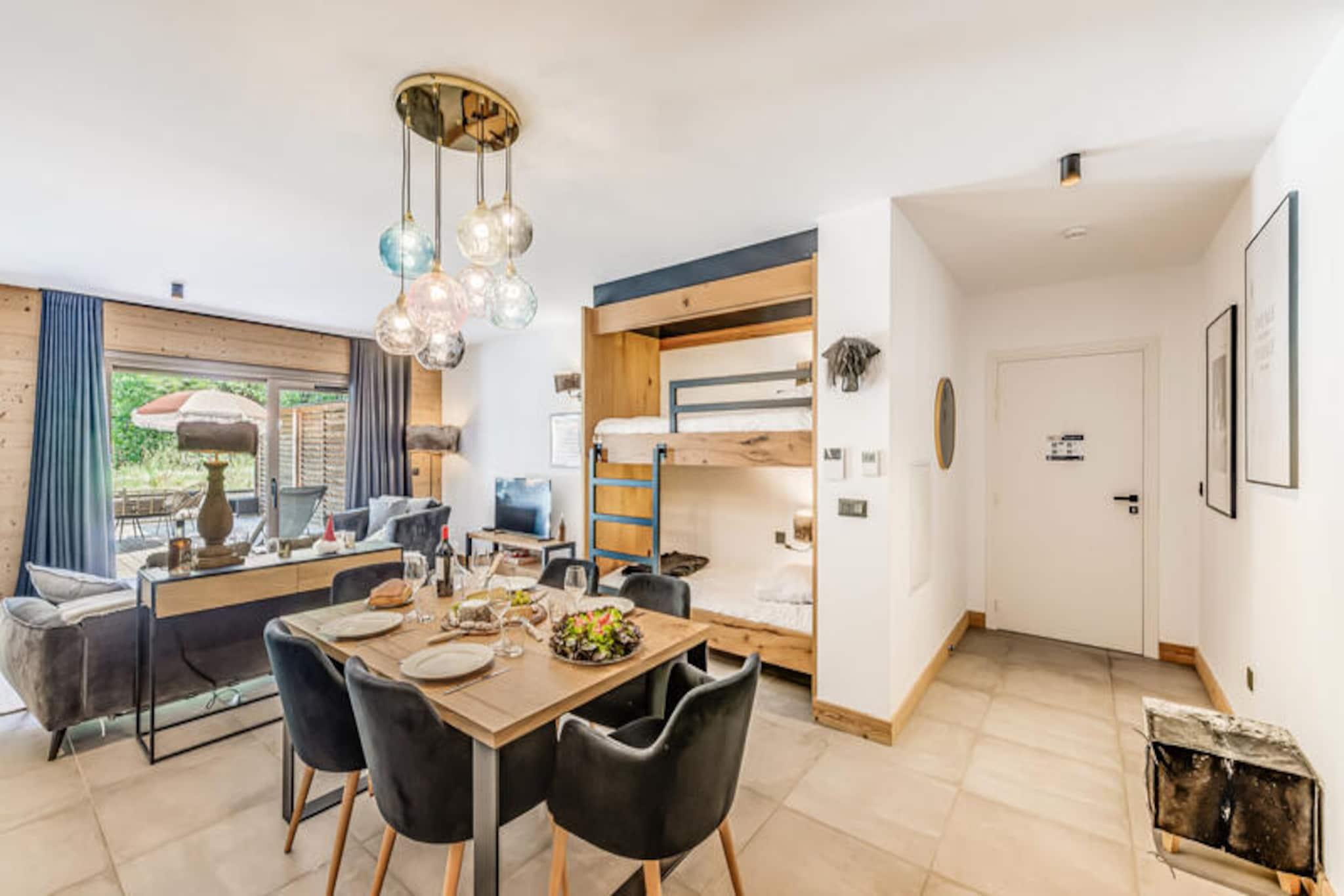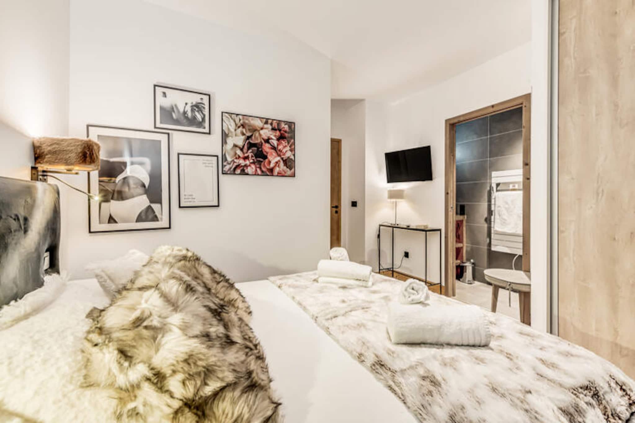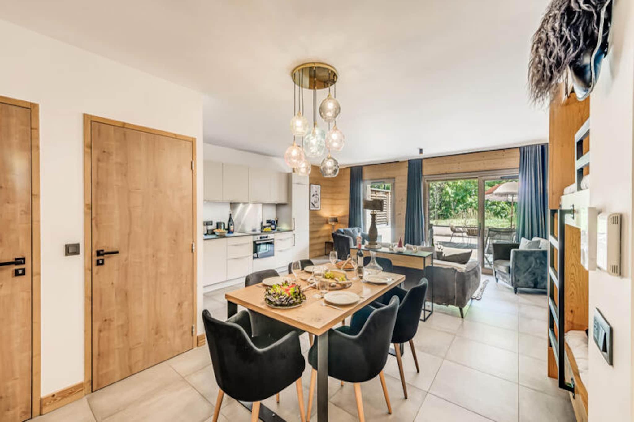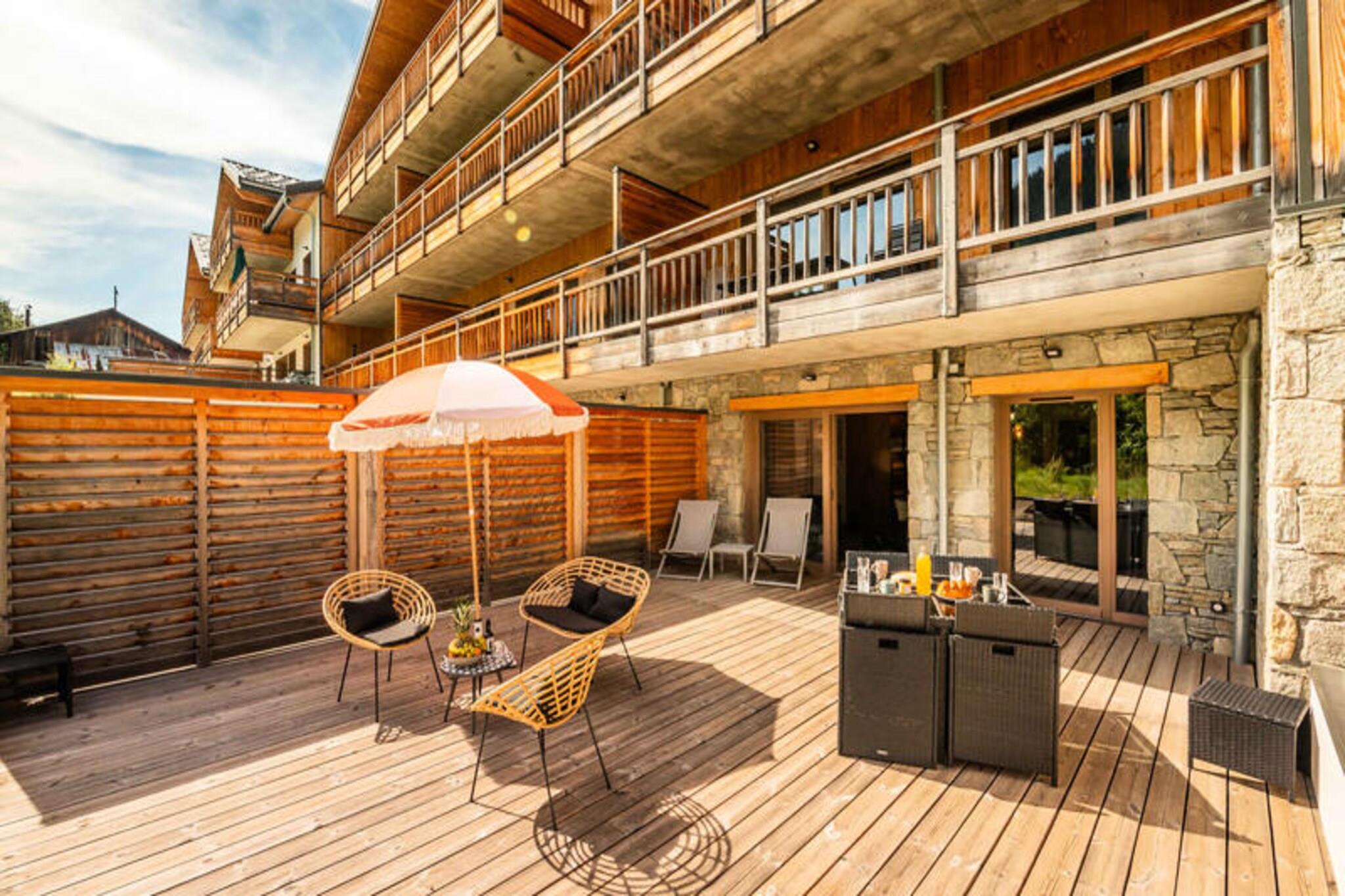 Denne moderne og elegante lejlighed i Terrasses de la Vanoise-residensen ligger i udkanten af ??de maleriske Vanoise-bjerge og tilbyder et luksuriøst alpint tilflugtssted. Ejendommen ligger i den charmerende landsby Villard Dessous, lige over for landsbyen Champagny en Vanoise, og kan prale af en betagende udsigt over de omkringliggende tinder og dale. Uanset om du besøger stedet om sommeren eller vinteren, giver beliggenheden nem adgang til områdets naturlige skønhed og aktiviteter, med butikker og skilifte kun 500 meter væk og gratis kommunale shuttlebusser bekvemt placeret 50 meter fra residensen. \n\nLejligheden, der ligger i stueetagen, er omhyggeligt designet til komfort og stil. Den har en master suite med dobbeltseng, tv, skrivebord og eget brusebad samt et hyggeligt bjerghjørne med køjesenge. Den rummelige stue åbner ud til en sydvendt terrasse, perfekt til at nyde solen og beundre det fantastiske Vanoise-landskab. Et fuldt udstyret køkken, spiseplads og moderne faciliteter såsom vaskemaskine/tørretumbler, satellit-tv og Wi-Fi sikrer et problemfrit ophold. Gæsterne kan også benytte sig af hotellets serviceydelser, herunder sengelinned, håndklæder og slutrengøring. \n\nChampagny en Vanoise tilbyder et væld af aktiviteter året rundt. Om vinteren kan du nyde skiløb og snowboarding i verdensklasse, mens sommeren inviterer dig til at udforske vandrestier, slappe af ved den nærliggende swimmingpool eller forkæle dig selv med spabehandlinger. Den gratis shuttle-service gør det nemt at opdage de charmerende omgivelser, fra Les Rochers til det fredfyldte Champagny-le-Haut. \n\nUanset om du søger eventyr eller ro, kombinerer denne lejlighed moderne komfort med den tidløse charme i de franske alper og lover en uforglemmelig ferieoplevelse.
