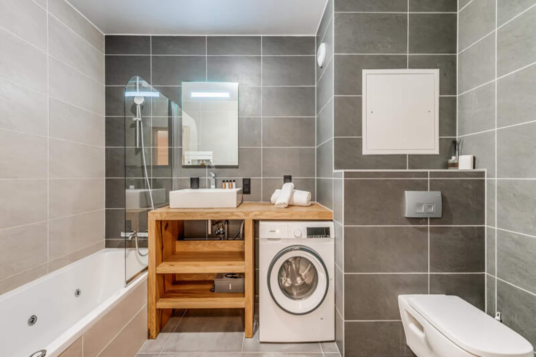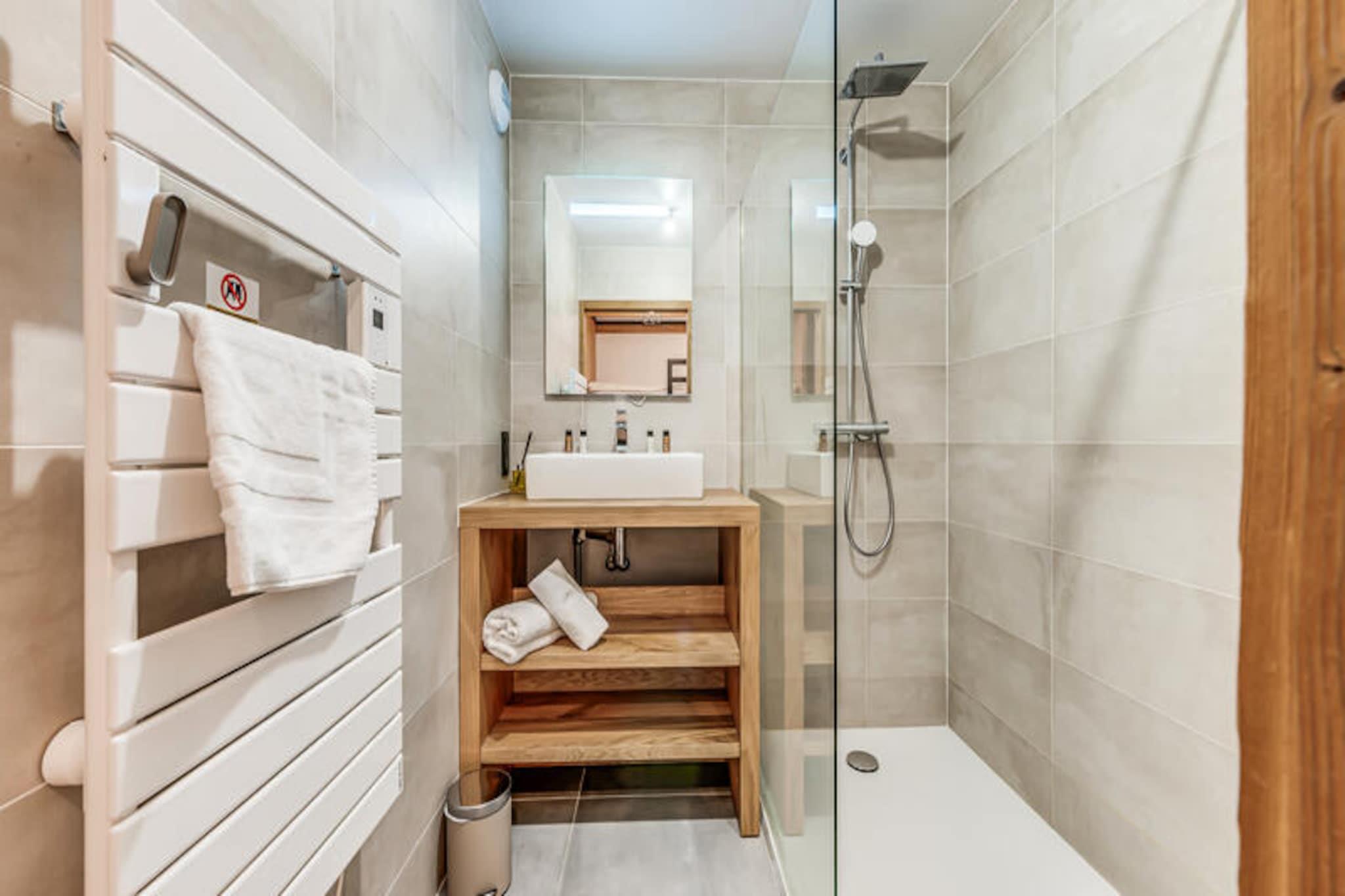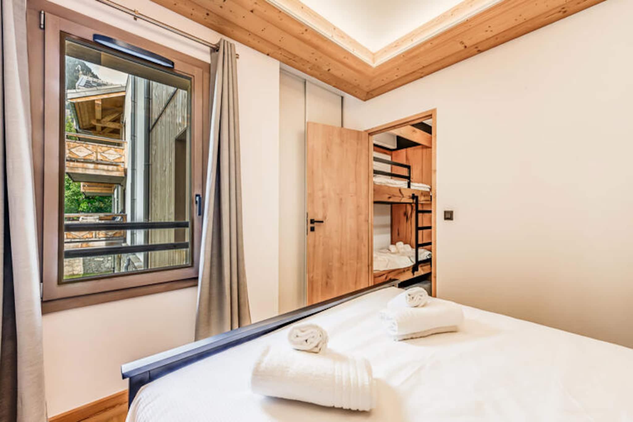 I den maleriske landsby Villard Dessous, hvor de majestætiske Vanoise-bjerge strækker sig uendeligt ud over horisonten, ligger et moderne alpint tilflugtssted, der lover både elegance og komfort. Med uhindret udsigt over bjergtoppene og den charmerende landsby Champagny en Vanoise nedenfor tilbyder denne bolig en perfekt blanding af ro og bekvemmelighed. Uanset om du søger et vintereventyrland eller en sommerflugt, inviterer denne beliggenhed dig til at fordybe dig i de franske alpers skønhed. \n\nLejligheden, der er en del af det nybyggede Terrasses de la Vanoise, kan prale af en rummelig planløsning på 102 m², der er designet til at rumme op til otte gæster. Med tre nordvendte soveværelser, inklusive en familiesuite med køjesenge, og et luksuriøst badeværelse med spabad, er hver eneste detalje omhyggeligt udformet til afslapning. Det fuldt udstyrede køkken åbner ud til en hyggelig stue, hvor du kan slappe af efter en dag med eventyr. Træd ud på den sydvendte balkon og indånd den friske alpeluft, mens du beundrer panoramaudsigten. Yderligere faciliteter inkluderer Wi-Fi, hotelservice, parkering med elektriske ladestationer og et skirum med støvletørrer, hvilket sikrer et problemfrit ophold. \n\nBeliggende kun 500 meter fra butikker og skilifter har du nem adgang til landsbyens faciliteter, herunder gratis kommunale shuttlebusser, der forbinder dig med Champagny-le-Haut. Om sommeren tilbyder den nærliggende swimmingpool og spa forfriskende fritidsmuligheder. Udforsk de omkringliggende stier, nyd lokal mad, eller slap blot af i den rolige alpine atmosfære. Med sin blanding af moderne luksus og naturlig skønhed er denne ejendom din port til uforglemmelige bjergminder.