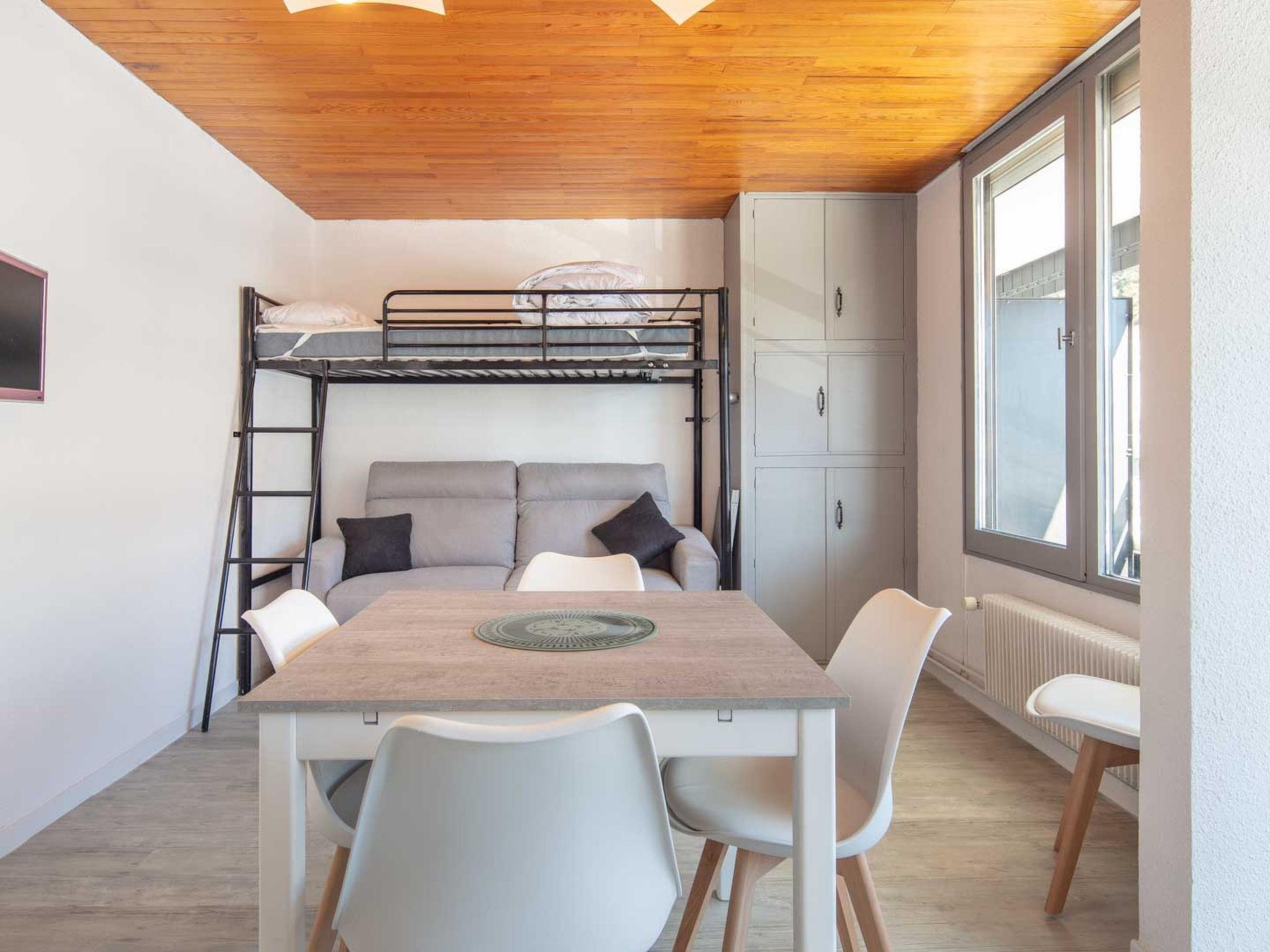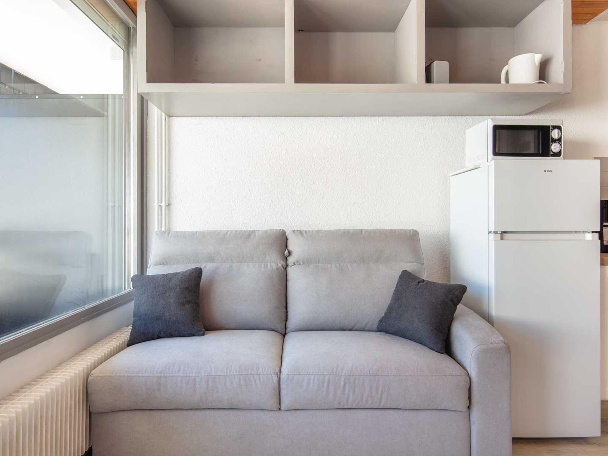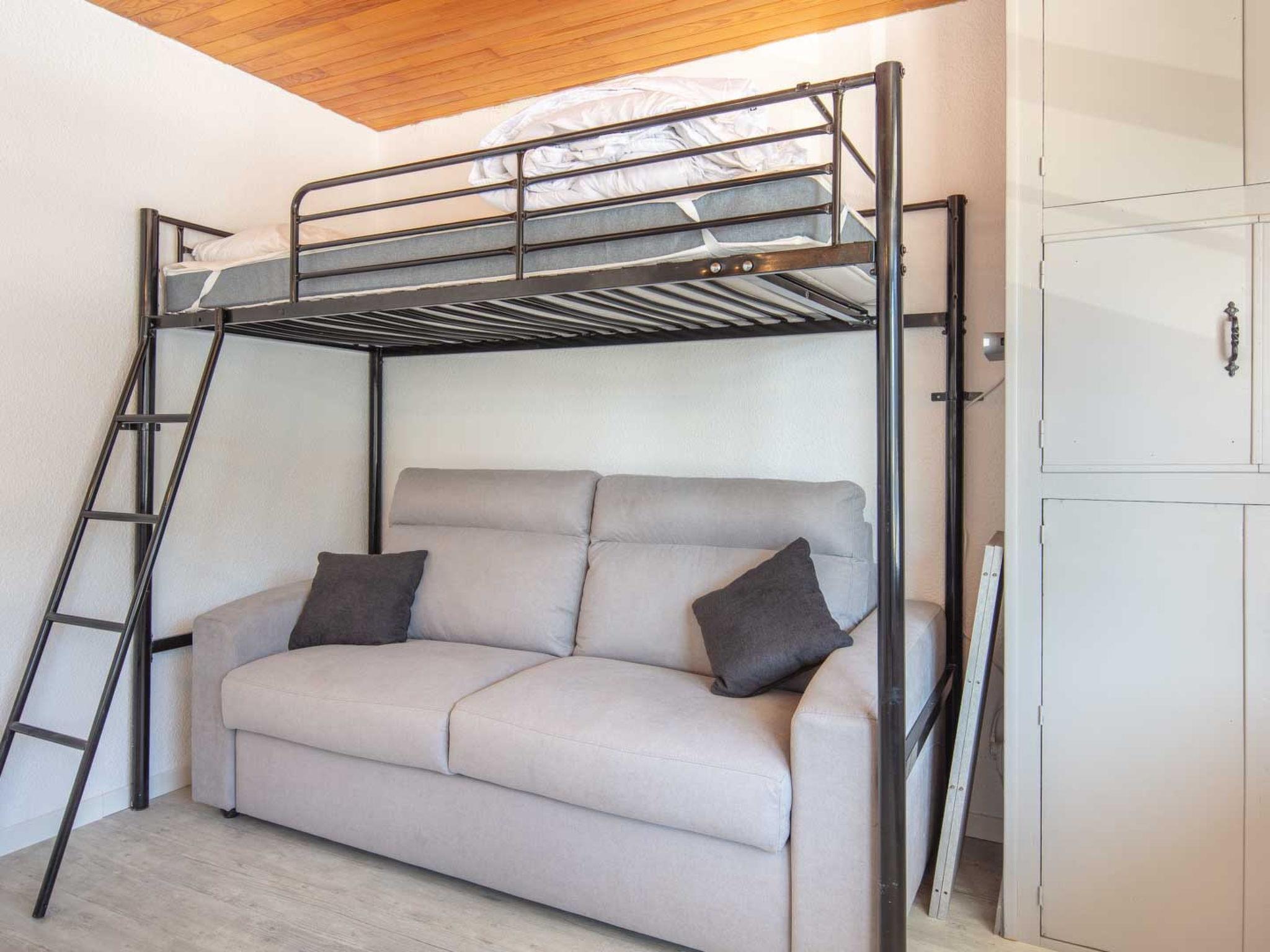 "Les Carlines", 1-room studio 30 m2 on 4th floor. Object suitable for 5 adults. Living room with 2 sofabeds and 1 x 2 bunk beds, 2 pull-out beds and TV. Open kitchen (2 hot plates, microwave, electric coffee machine). Shower/WC. Balcony. View of the mountains and the ski run. Please note: non-smokers only. 1 pet/ dog allowed. Offer by a commercial proprietor according to Art. 155, IV, CGI