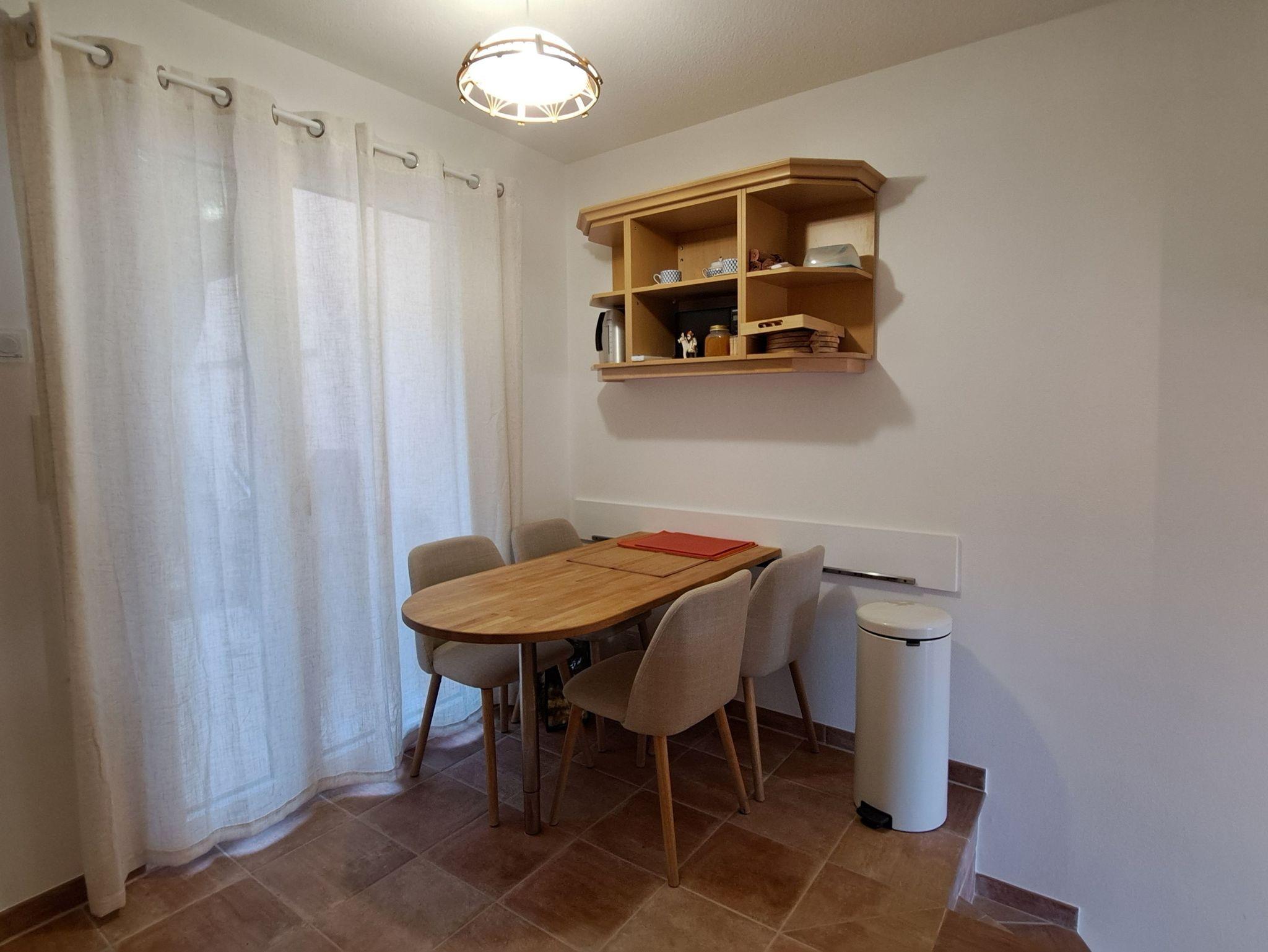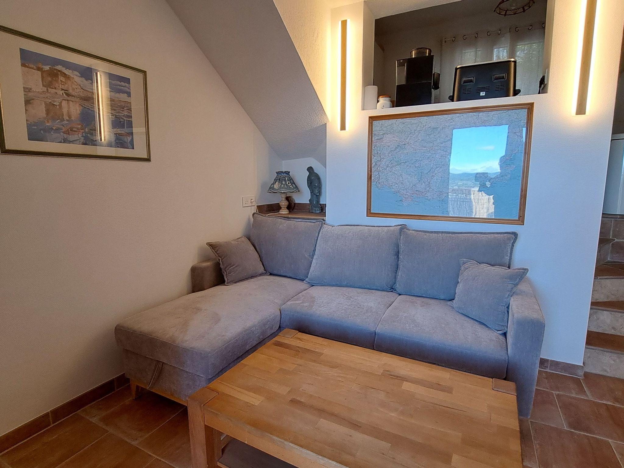 Das Ferienhaus in Frankreich ist auf drei Etagen verteilt. Es bietet Platz für 5 Personen. Im Erdgeschoss befindet sich das Wohnzimmer mit Terrasse und Schlafsofa, auf halber Treppe die Küche mit Essbereich. Im 1. Obergeschoss ein Schlafzimmer und ein Badezimmer und im 2. Obergeschoss ein weiteres Schlafzimmer und ein separates WC.