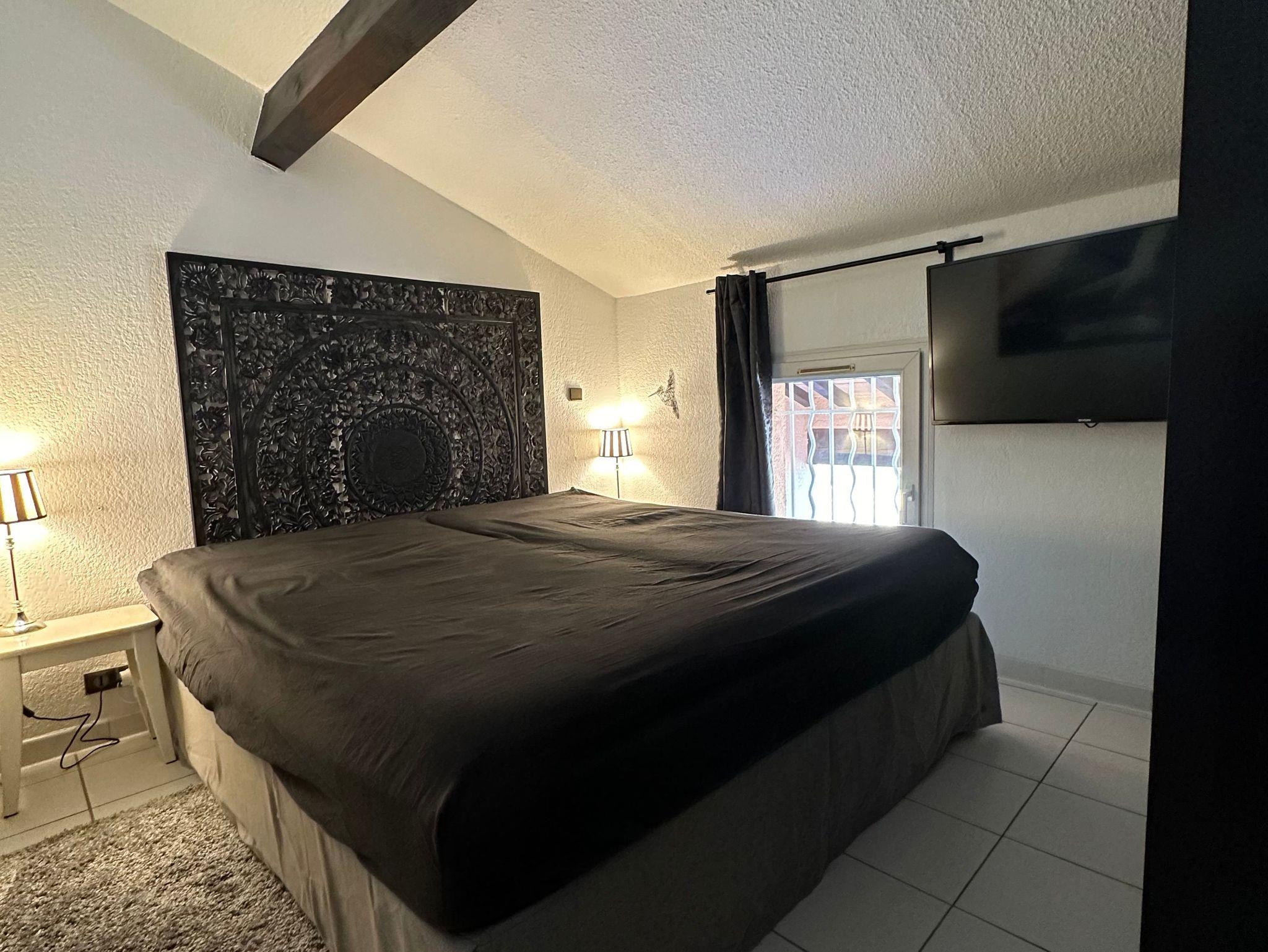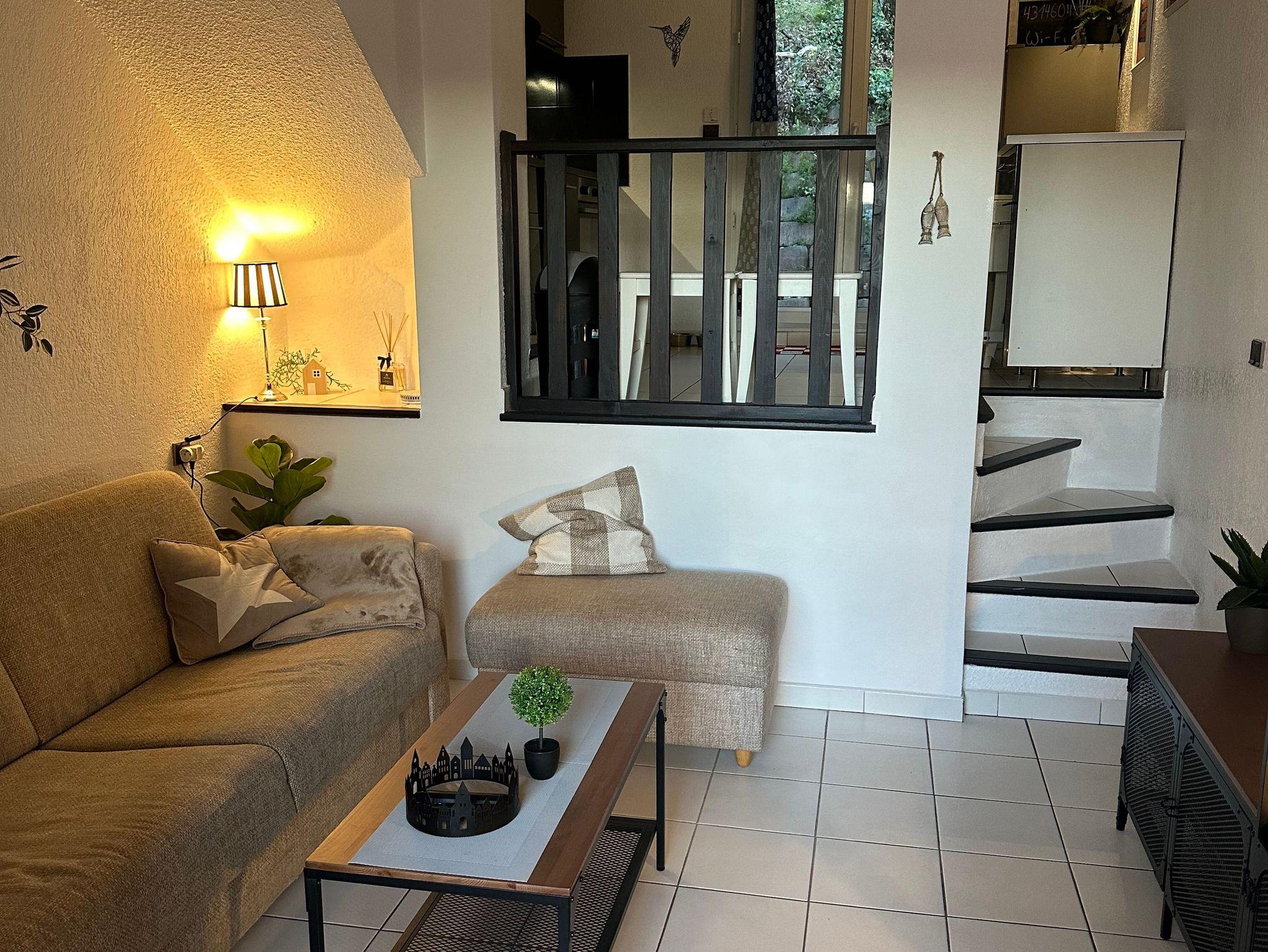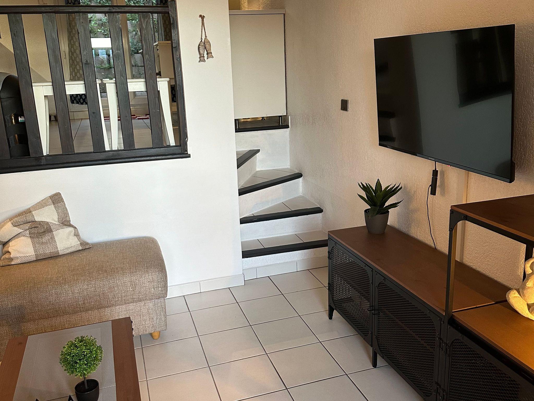 Das Haus erstreckt sich über zwei Etagen und bietet Platz für bis zu vier Personen. Im Erdgeschoss befindet sich das Wohnzimmer mit Schlafcouch und Zugang zur sonnigen Terrasse. Auf halber Treppe liegt die voll ausgestattete Küche mit Essbereich, im Obergeschoss folgen Schlafzimmer, Badezimmer und ein separates WC. Eine Klimaanlage sorgt an heißen Tagen für angenehme Kühle in allen Wohnbereichen.
