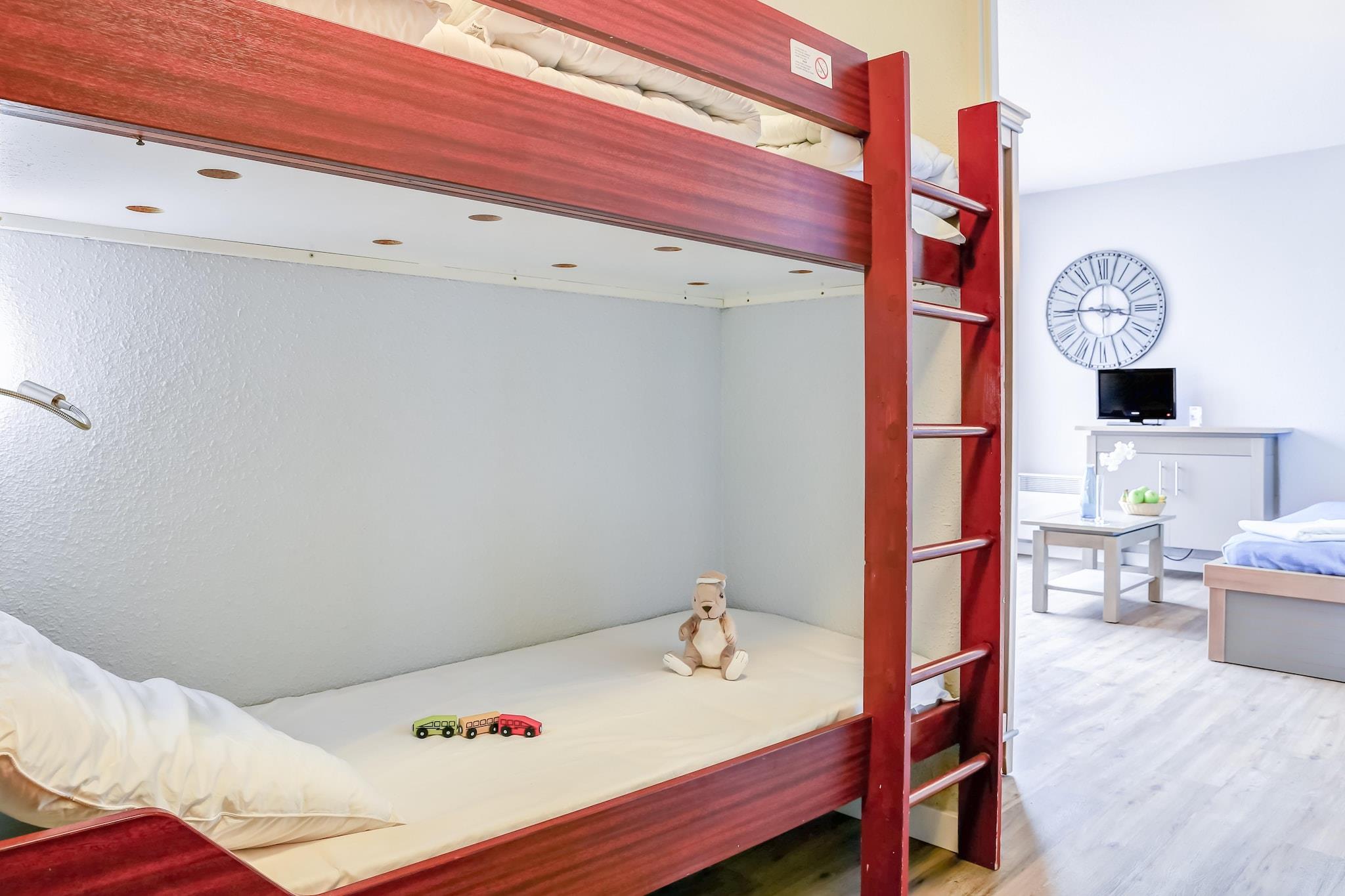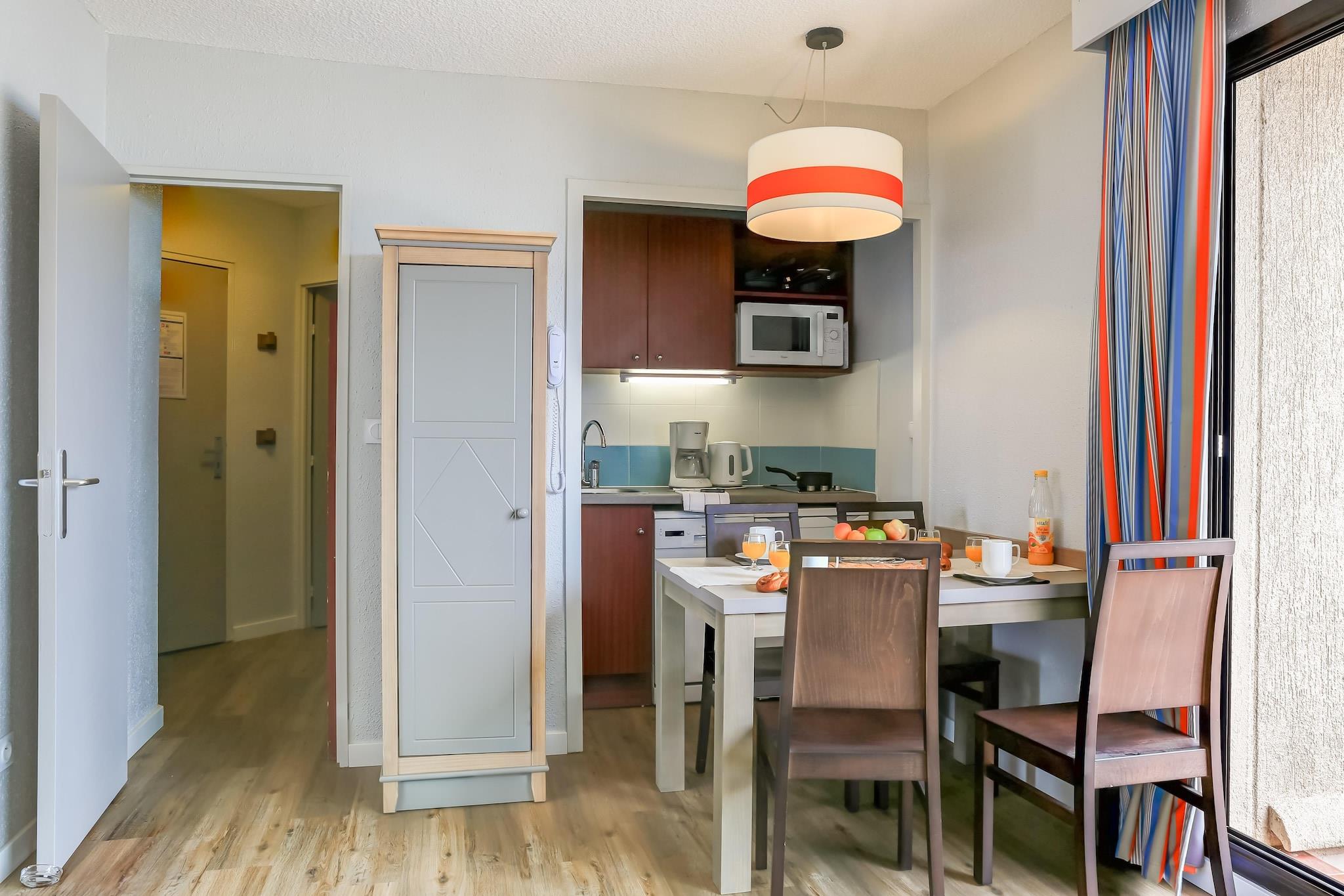 Tekøkken(elkedel, komfur(Komfur med to kogeplader), kaffemaskine, mikrobølgeovn, opvaskemaskine , køleskab), Stue/soveværelse(feltseng, enkeltsovesofa, Fjernsyn), soveniche(køjeseng), badeværelse(badekar, toilet), balkon eller terrasse, havemøbler, swimmingpool(deles med andre gæster, udendørs, opened from Apr upto and including Aug)