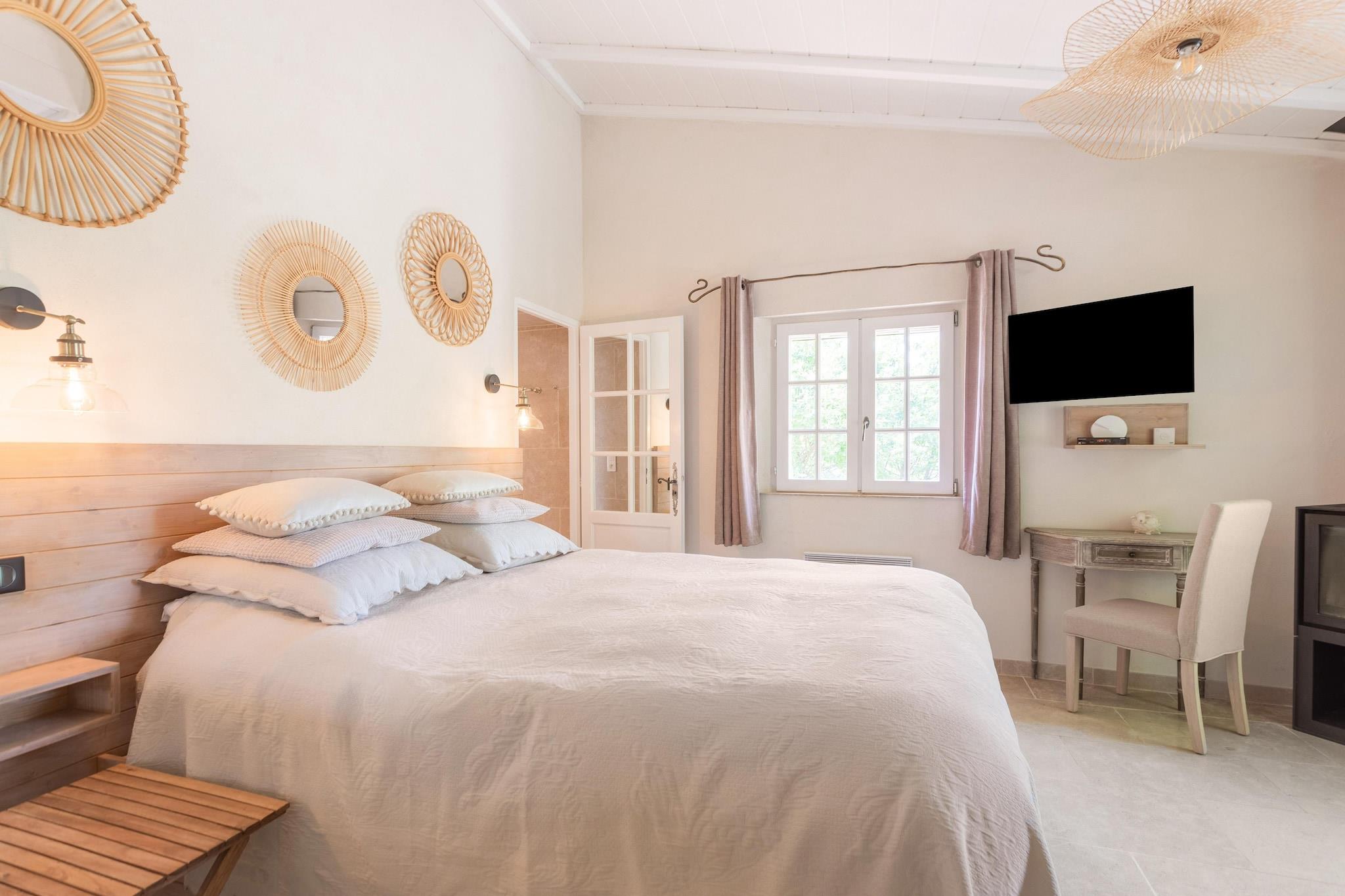 Dette fritliggende feriehus ligger på en 4 hektar stor ejendom, 4 km fra landsbyen Cotignac (i Var). Det er omgivet af egetræer, fyrretræer og oliventræer, og du kan bo komfortabelt med familie og venner. Der er masser at lave i regionen. Du kan sejle i kano, vandcykel og surfe ved søen Sainte Croix og den berømte Gorges du Verdon. Det luksuriøse Saint Tropez og forskellige middelhavsstrande ligger 65 km fra overnatningsstedet, og et besøg i umiddelbar nærhed byder på interessante seværdigheder, såsom vandfaldene i Sillan (6 km) og det smukke Salerne (15 km) med sine karakteristiske terracotta-fliser. Denne tidligere fårefold fra det 18. århundrede blev restaureret i 2000 og tilbyder gæsterne en kombination af en autentisk atmosfære med moderne komfort. Slap af i swimmingpoolen og tilbered dine yndlingsretter omgivet af natur i det udendørs køkken.