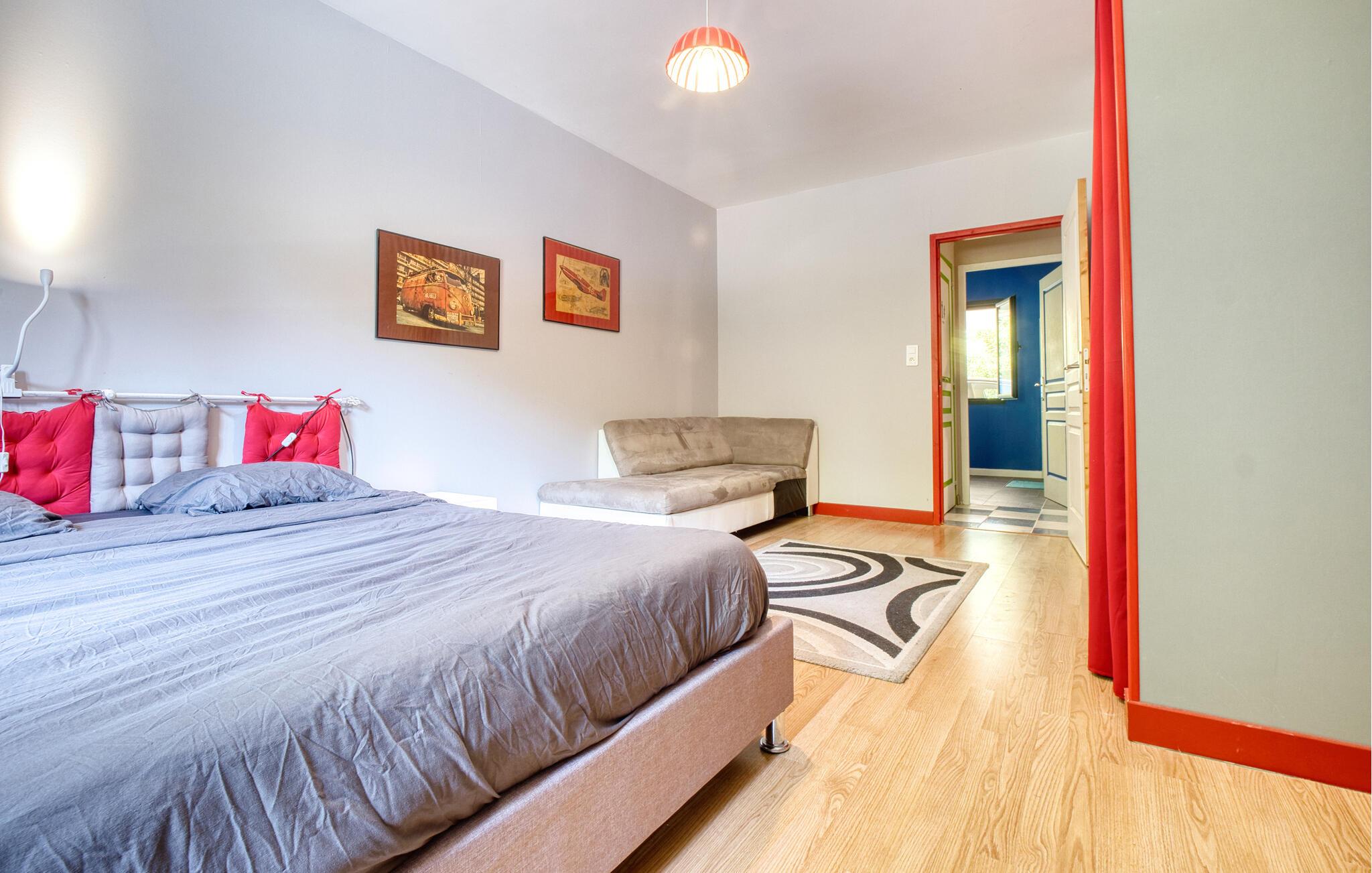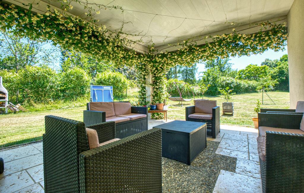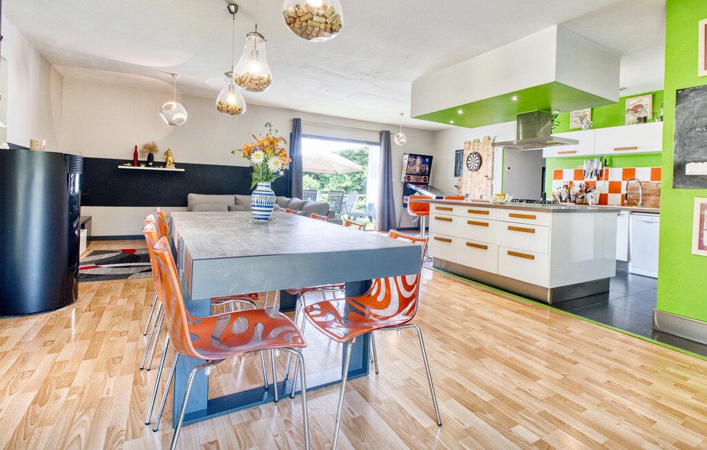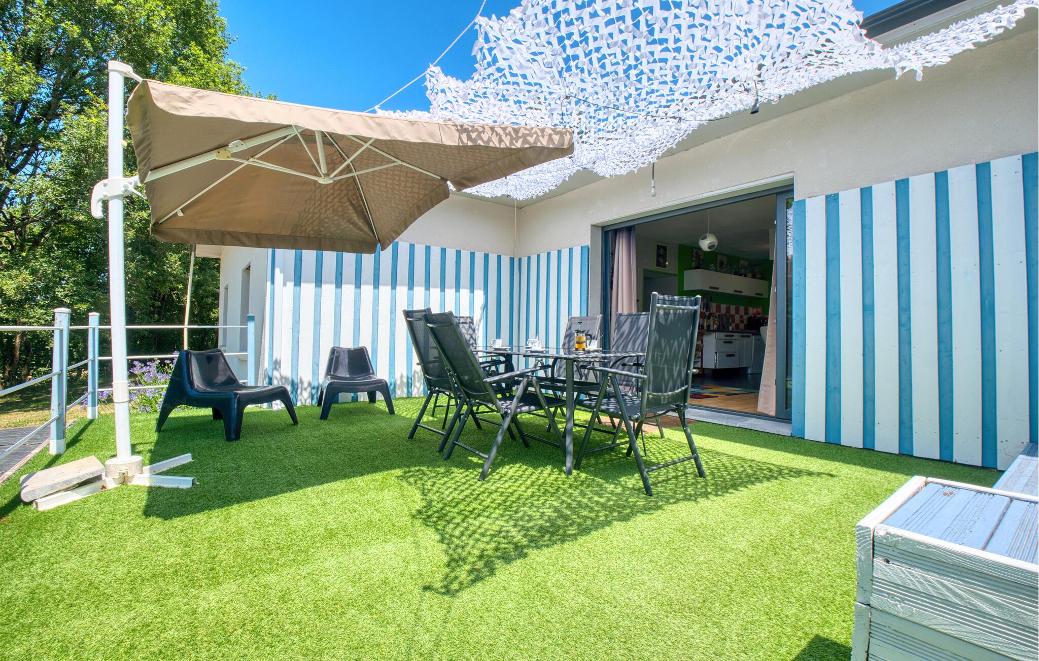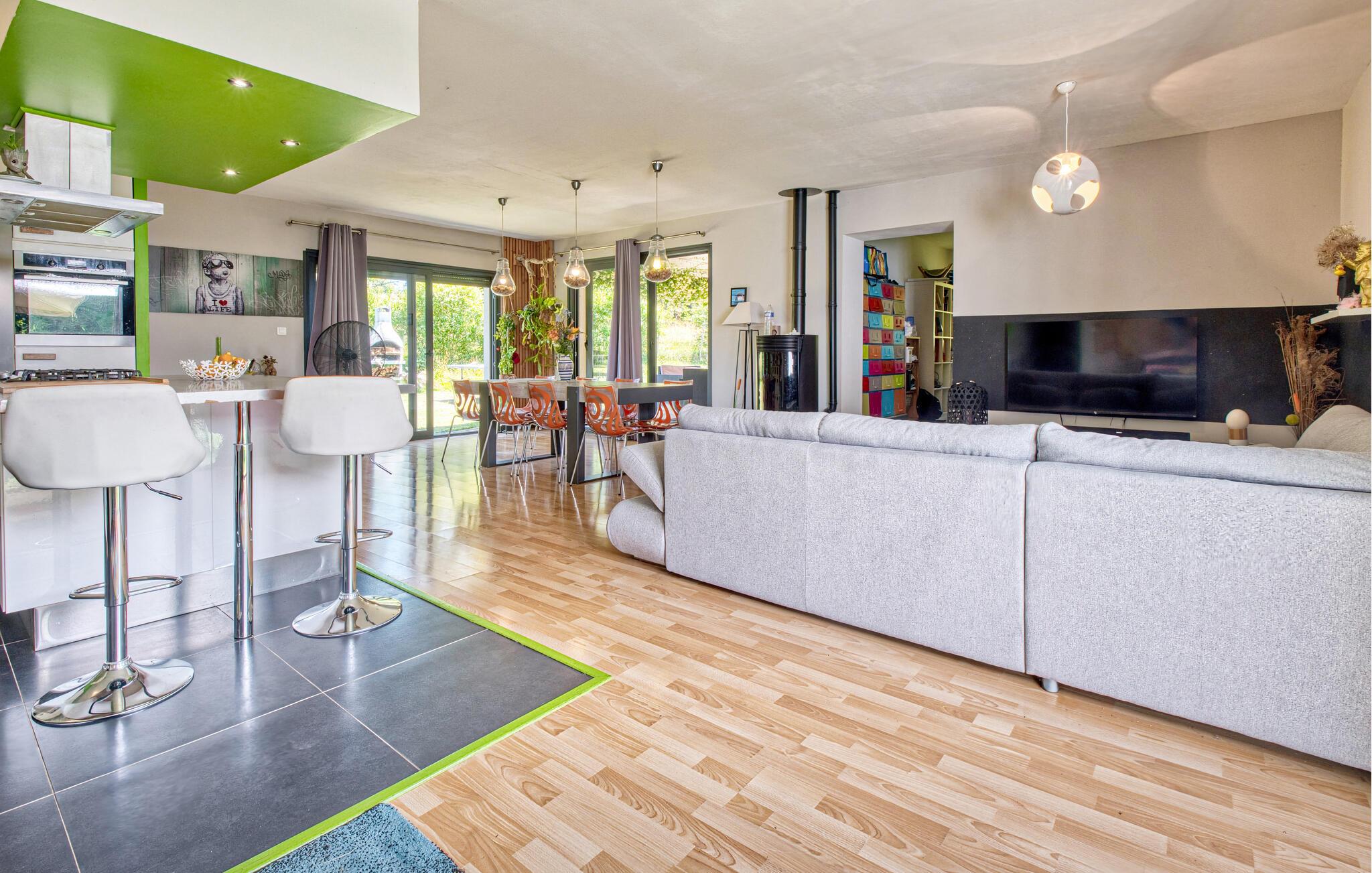 Tilbring jeres næste ferie i Frankrig i dette stilfulde feriehus nær Coursac. Glæd jer til at tilbringe tid sammen med familien i den rummelige opholdsstue. Den moderne indretning med lyse trægulve, et åbent køkken og en behagelig sofagruppe skaber en behagelig atmosfære. De farverige accenter bidrager også til den ubekymrede stemning. Tag dagens måltider ved den hyggelige spiseafdeling og nyd hyggelige timer. Afslut aftenen med at slappe af foran brændeovnen eller med en film på storskærms-tv.