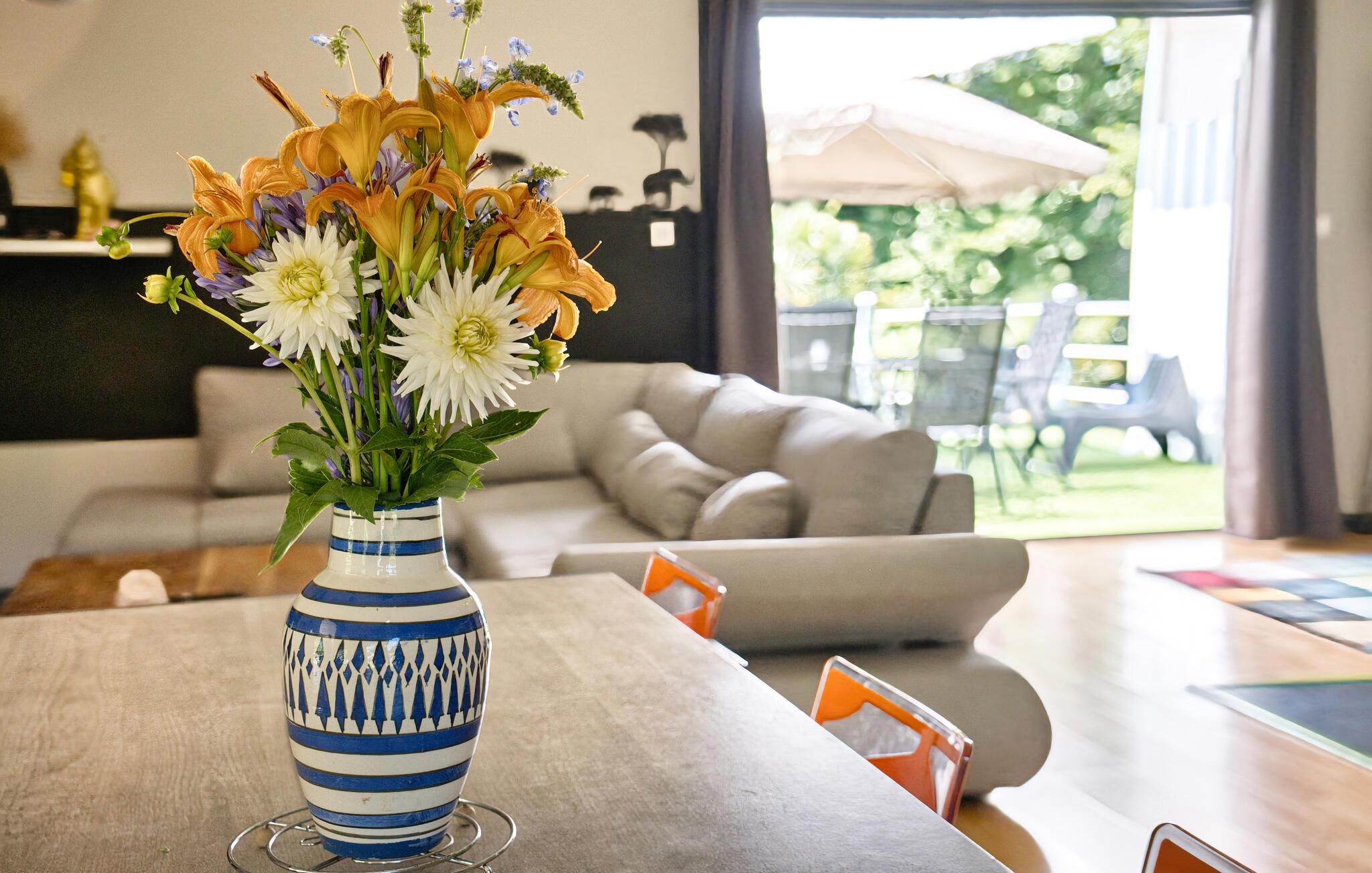 Brug det rummelige udendørsområde til afslappende timer. Solbad på den store terrasse eller tag en forfriskende dukkert i den private pool eller spabad. Det hyggelige loungehjørne lægger op til at tilbringe afslappende stunder i skyggen. Nyd freden og roen og lad blikket vandre over de grønne omgivelser.