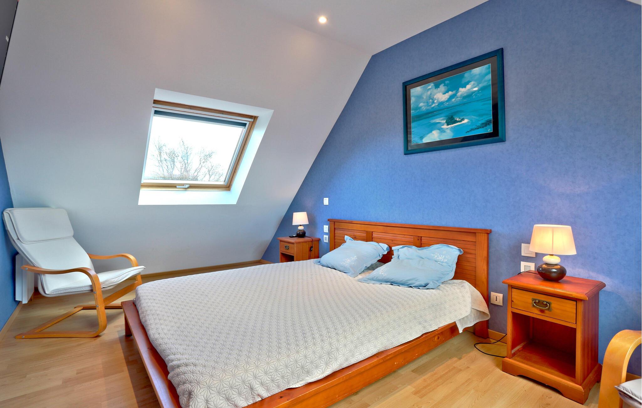 Ren ferieafslapning venter jer i dette charmerende hus, beliggende på en forhøjet bakke nær Mont-Saint-Michel-bugten, som I kan beundre fra stuen, soveværelset og terrassen. Find jer godt til rette med familien i de indbydende, farverige lokaler og brug feriehuset som base for en uforglemmelig tid med spændende udflugter i området. Vend tilbage hertil om aftenen og nyd den vidunderlige udsigt, mens I spiser sammen.