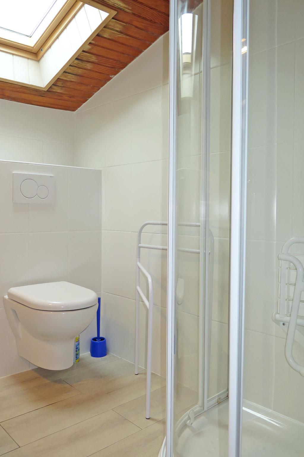 "Les Sapins", 4-room house 90 m2 on 2 levels. Rustic and cosy furnishings: living/dining room with open-hearth fireplace (only for decoration), dining table and TV. Kitchen (oven, dishwasher, 3 induction hot plates, toaster, kettle, microwave, freezer, electric coffee machine) with dining table. Exit to the garden. Sep. WC. Upper floor: 1 room with sloping ceilings with 1 french bed (140 cm, length 190 cm). 1 room with sloping ceilings with 2 beds (80 cm, length 190 cm). 1 room with sloping ceilings with 1 bed (80 cm, length 190 cm). Shower/WC. Electric heating. Terrace furniture, electric barbecue, deck chairs (2), box-room. Facilities: washing machine, iron, children's high chair, baby cot, hair dryer. Please note: non-smoking house. Maximum 1 pet/ dog allowed. Smoke alarm. Offer by a private individual according to Art. 155, IV of CGI.