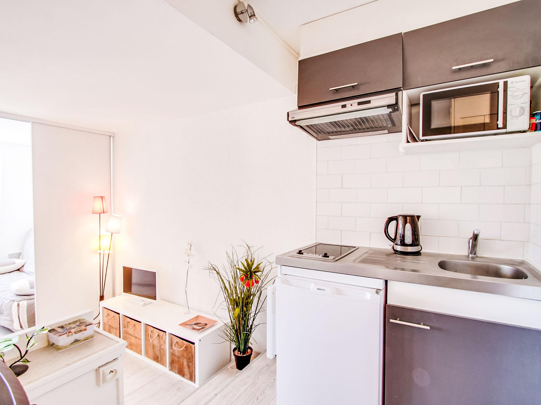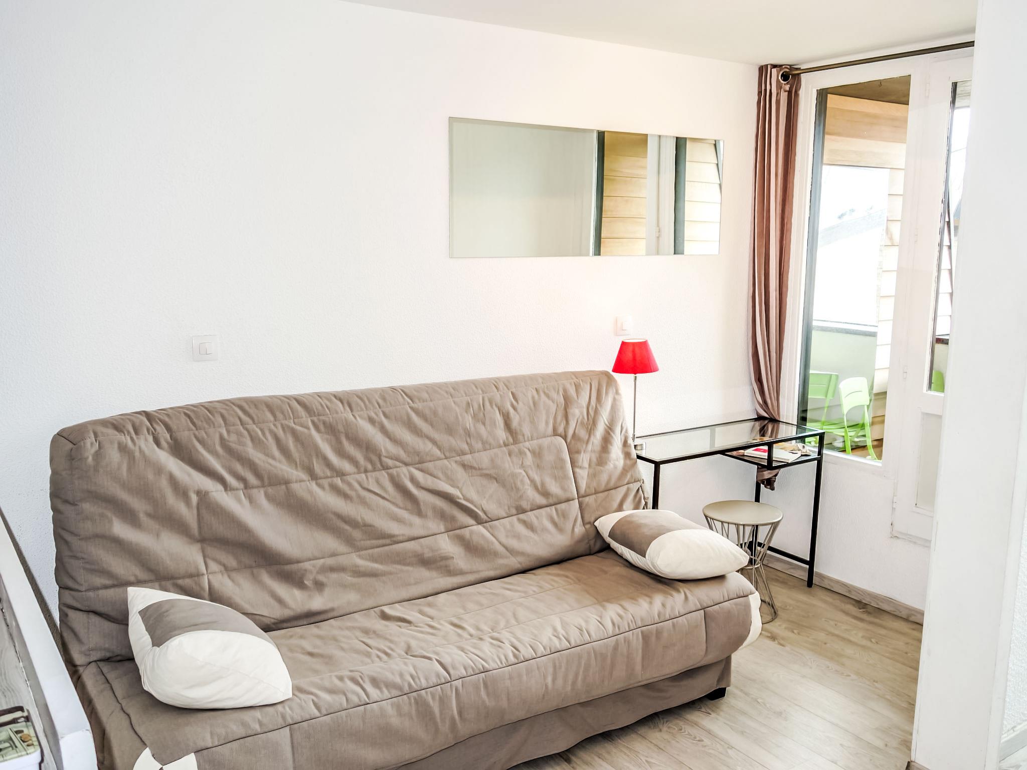 1-room studio 23 m2 on 5th floor, west facing position. Object suitable for 2 adults + 1 child. Living/dining room with 1 double sofabed (1 x 140 cm, length 190 cm), TV (flat screen). Alcove with 1 double sofabed (1 x 140 cm, length 190 cm). Kitchenette (2 hot plates, toaster, kettle, microwave, electric coffee machine). Bathroom, sep. WC. Electric heating. Small balcony 1 m2. Balcony furniture. Facilities: Internet (WiFi, free). Please note: non-smokers only. Smoke alarm. Instead of an enclosed bedroom, some sleeping areas are located in an open-plan area (gallery, alcove, etc.). 14220000114 OU